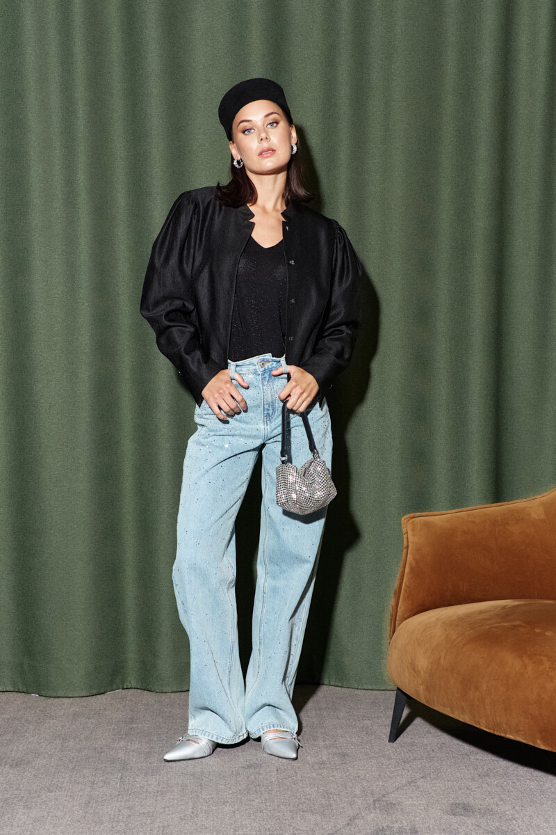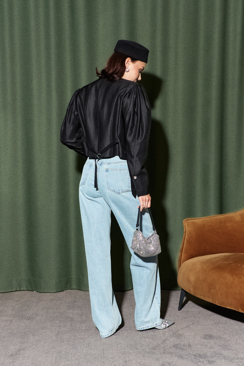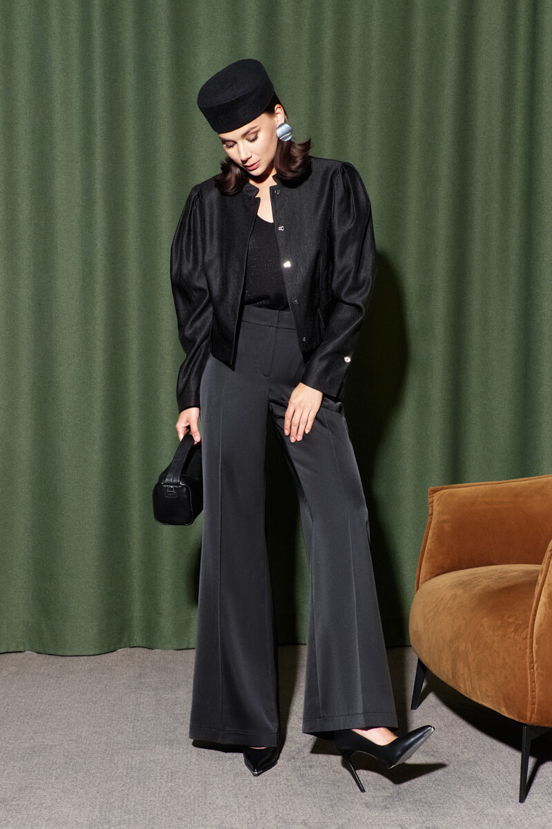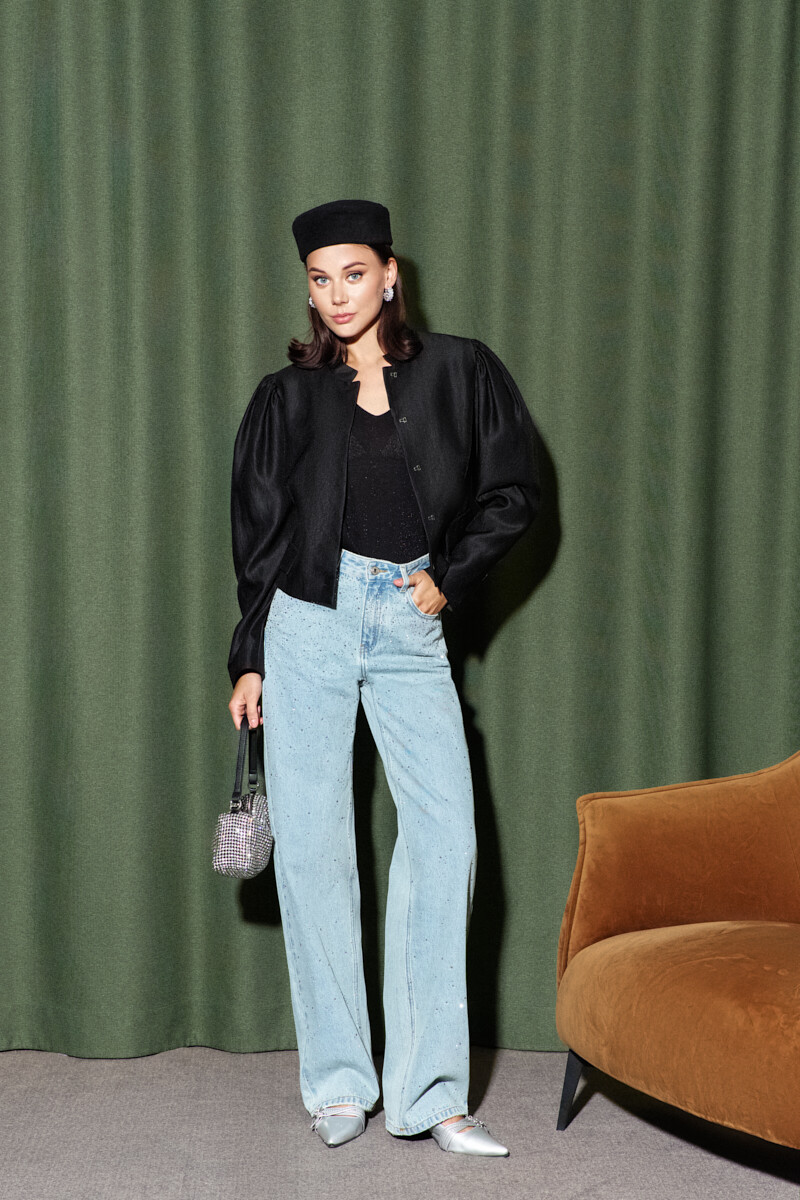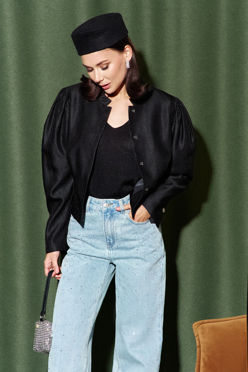 Стильный однобортный жакет на подкладке, выполнен из костюмно-плательного полотна с благородным блеском. Модель полуприлегающего силуэта со стойкой по горловине и застежкой на пришивные металлические крючки. Спереди расположены клапаны. В рельефе спинки односторонний пояс из основной ткани на пряжке. Особый вид изделию придают объёмные длинные рукава со сборкой и высокой шлицей в шве на петлю и декоративную пуговицу. Длина изделия 47 см; длина рукава 63 см.