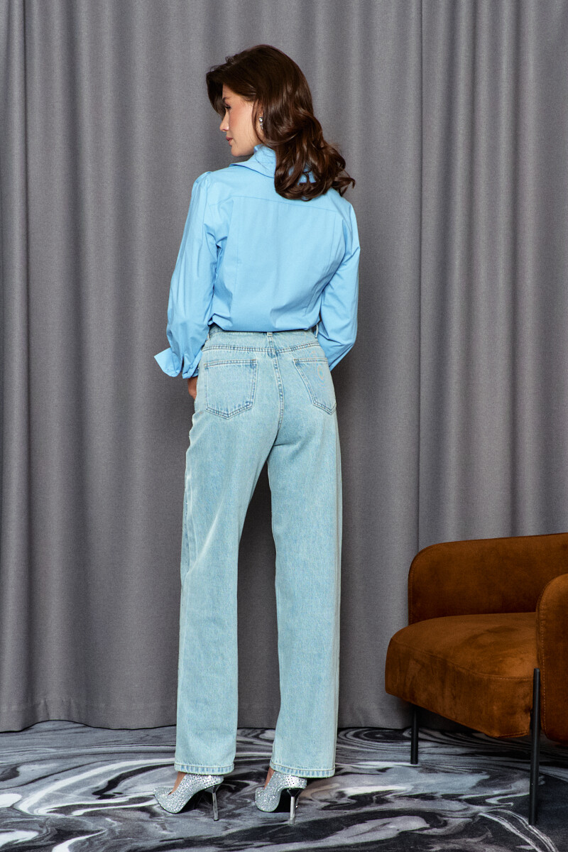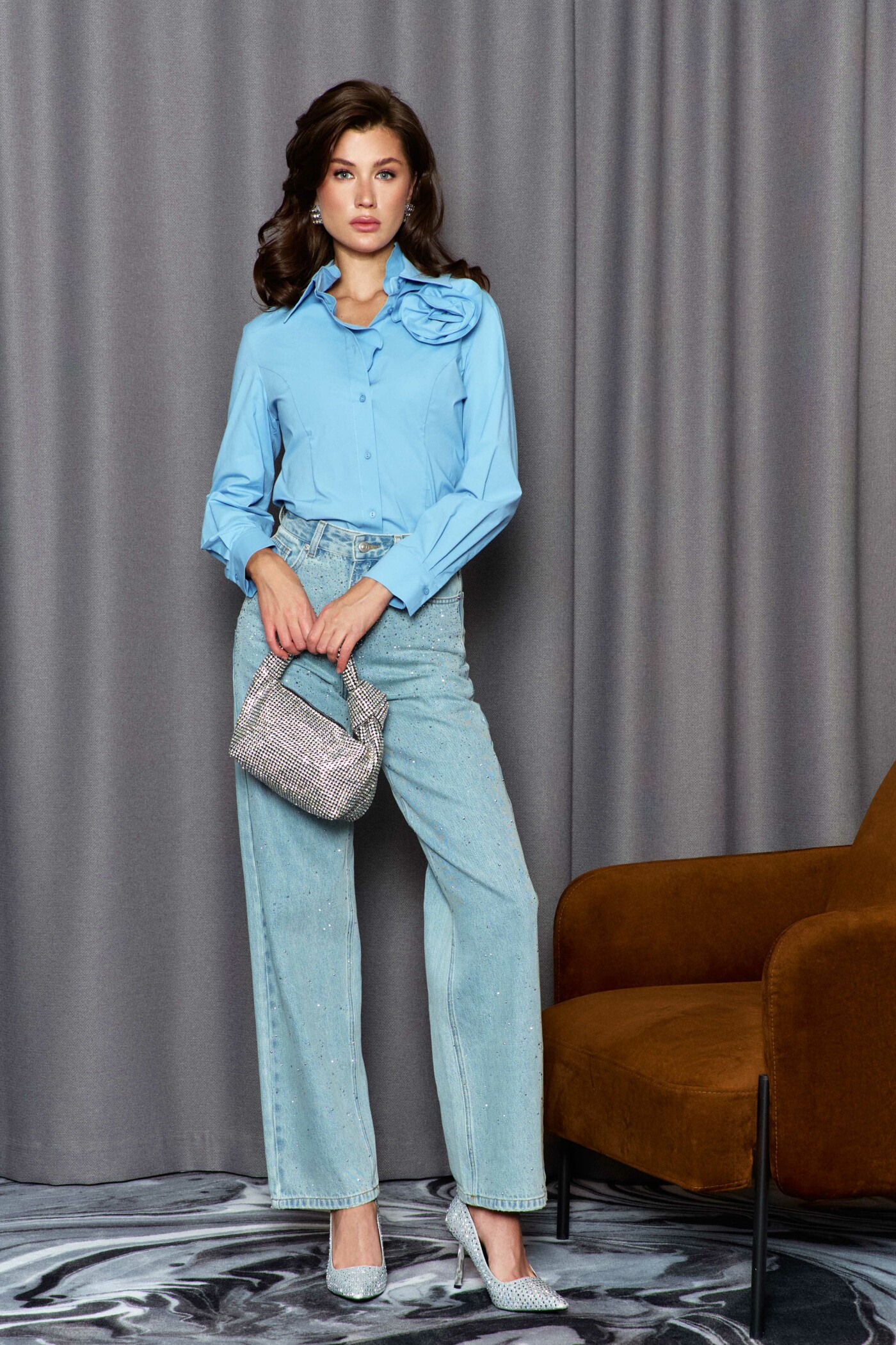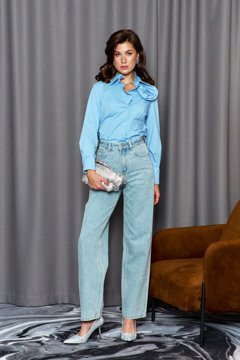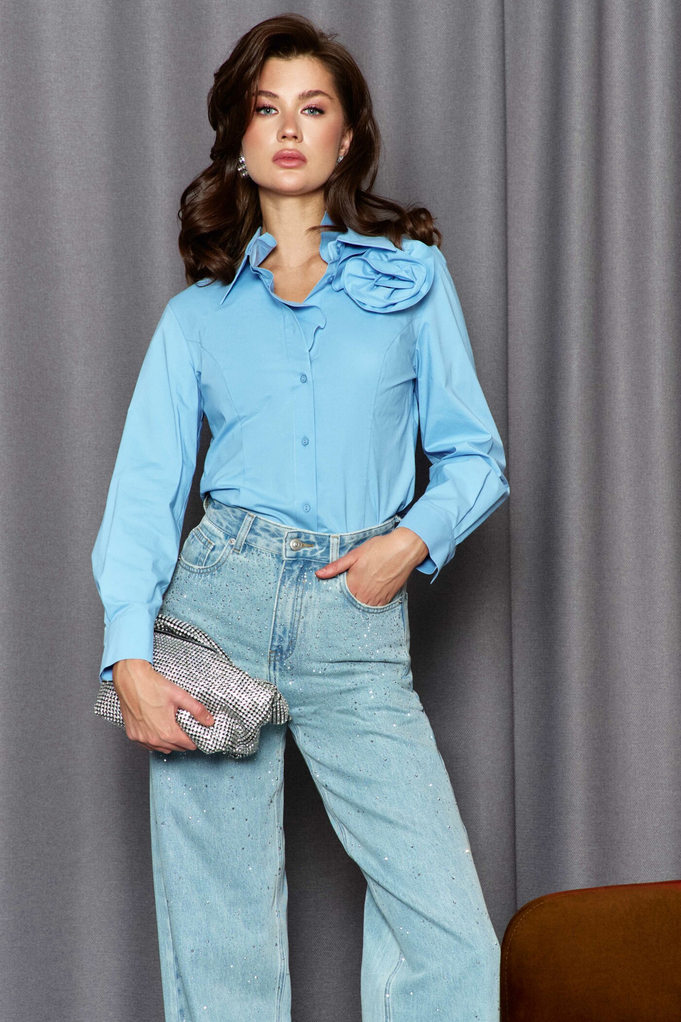 Блузка-рубашка выполнена из хлопкового полотна. Модель полуприлегающего силуэта со спущенной линией плеча. Воротник отложной на стойке. Перед с рельефами от пройм до низа и цельнокроеной планкой на петли и декоративные пуговицы. По спинке рельефы и две складки, направленные от кокетки. Рукава втачные длинные со складками вдоль застёгивающейся манжеты. В качестве декора в шов втачивания воротника и планки на правой части переда вставлены отлетные детали фигурной формы, а на левую часть переда настрочен цветок из основной ткани. Длина изделия 71 см; длина рукава 61,5 см.