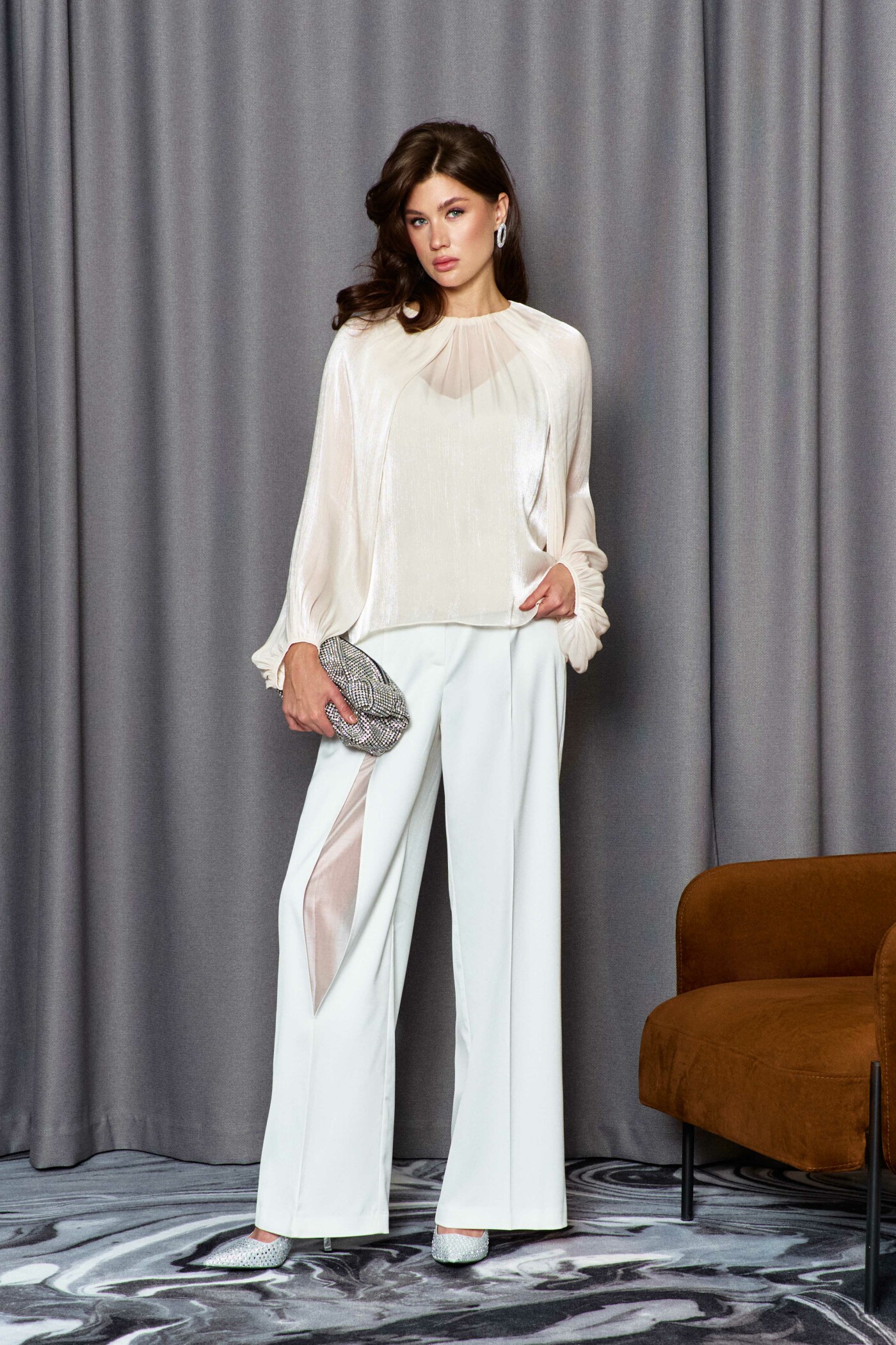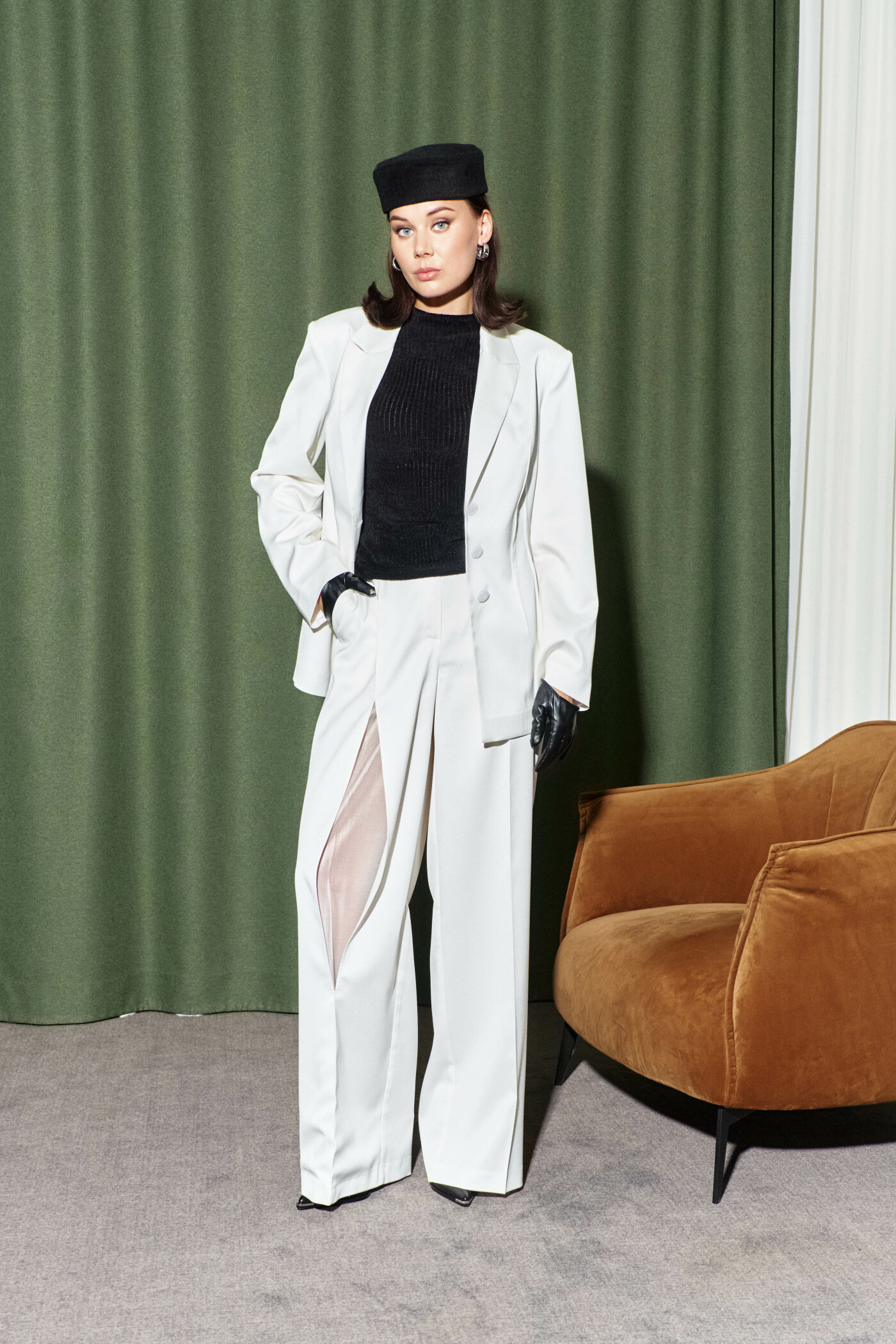 Классические свободные брюки в стиле city chic выполнены из костюмного полотна. Модель с комфортной высокой посадкой, на притачном поясе со шлевками и эластичной лентой внутри по спинке, застегивающимся на потайной брючный крючок. Спереди предусмотрен косой карман в правой части переда и застёжка на тесьму «молнию». Особым декоративным элементом является разрез на части переда, из которого видна отделочная деталь. Длина изделия по боковому шву (с поясом) 113 см.