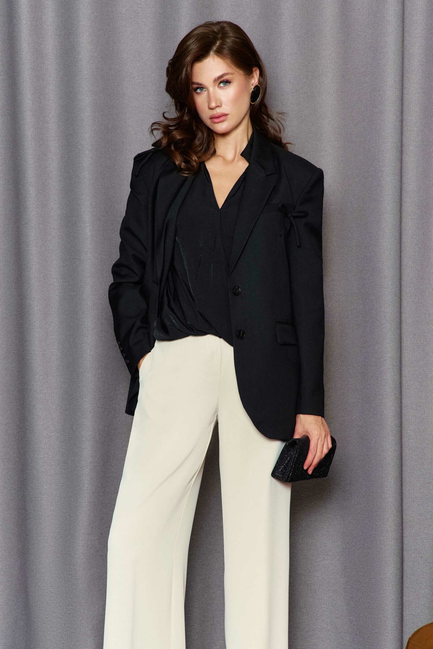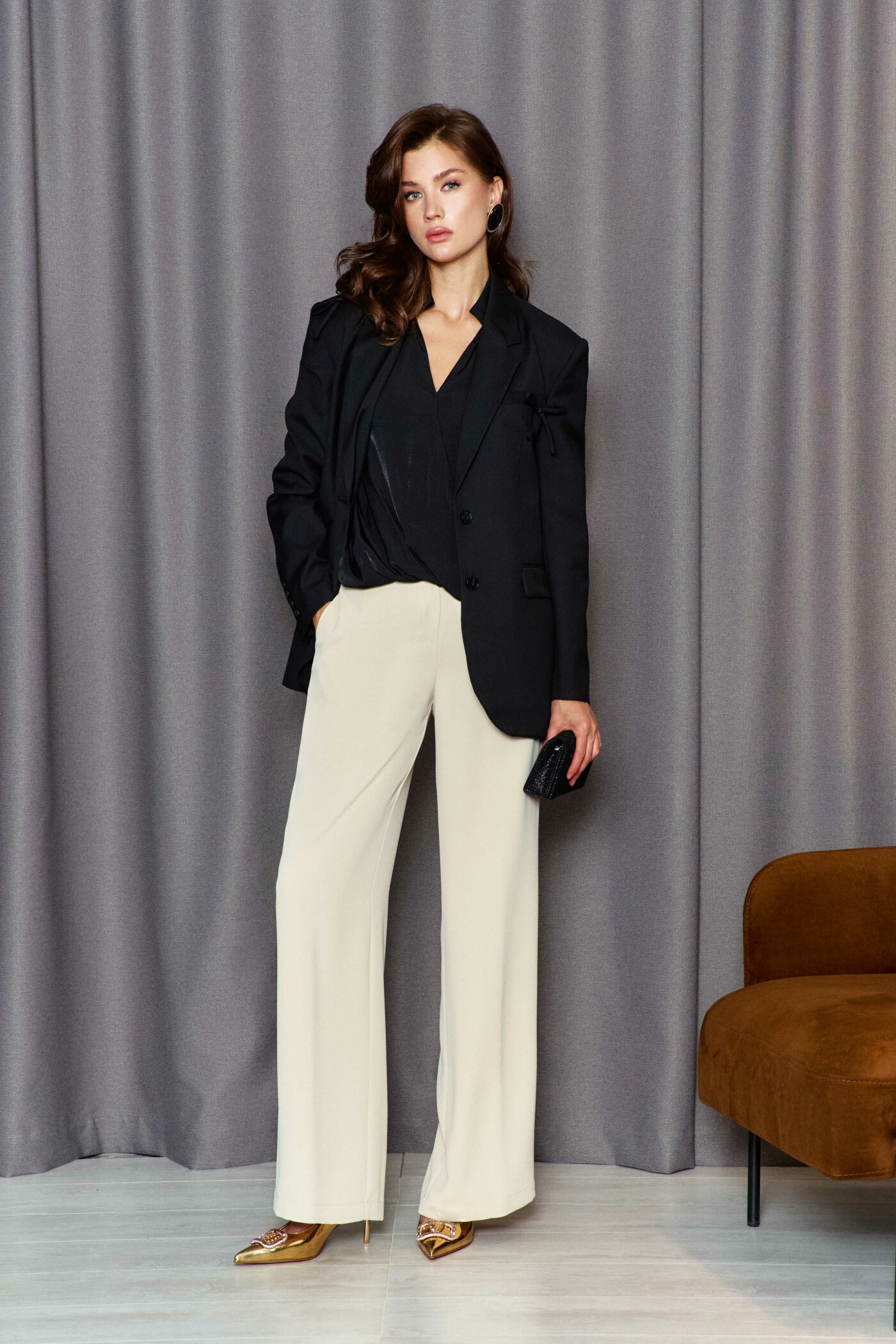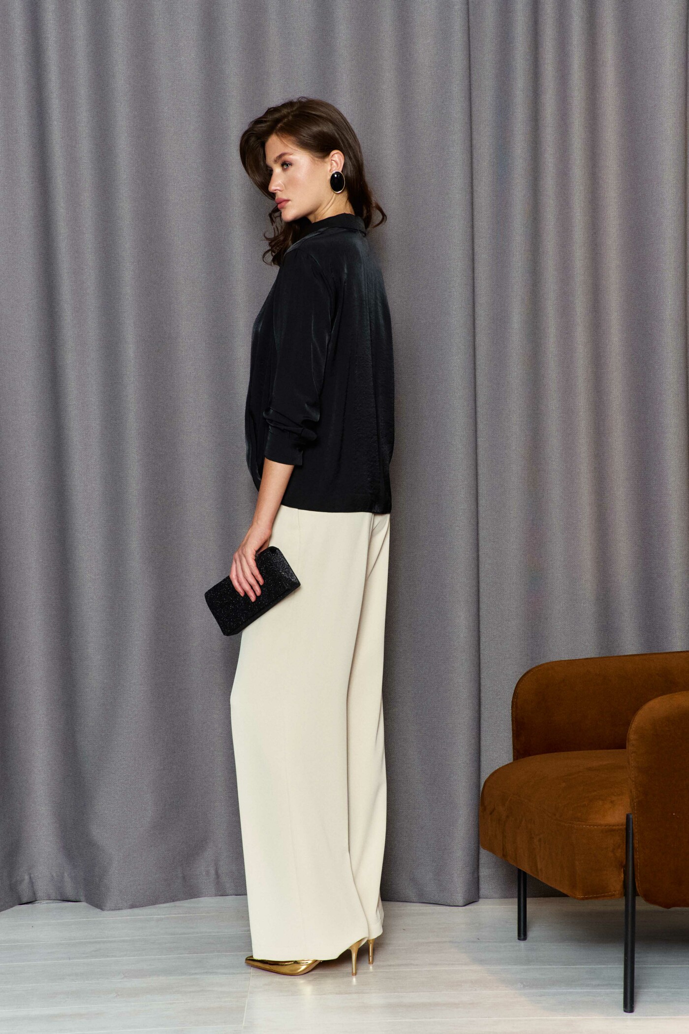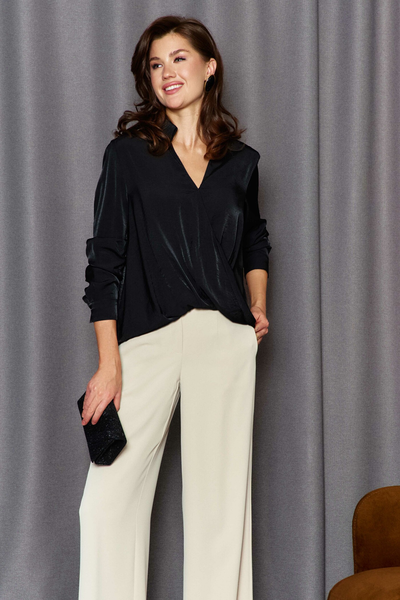 Блузка в стиле city chic выполнена из сатинового полотна с благородным блеском. Модель прямого силуэта. V-образная горловина на запах с отложным воротником на стойке. Особым декоративным элементом является двойной перед с перекрутом и складками. Рукава втачные, длинные, со складками вдоль застёгивающейся манжеты. Длина изделия 69 см, длина рукава 65 см.