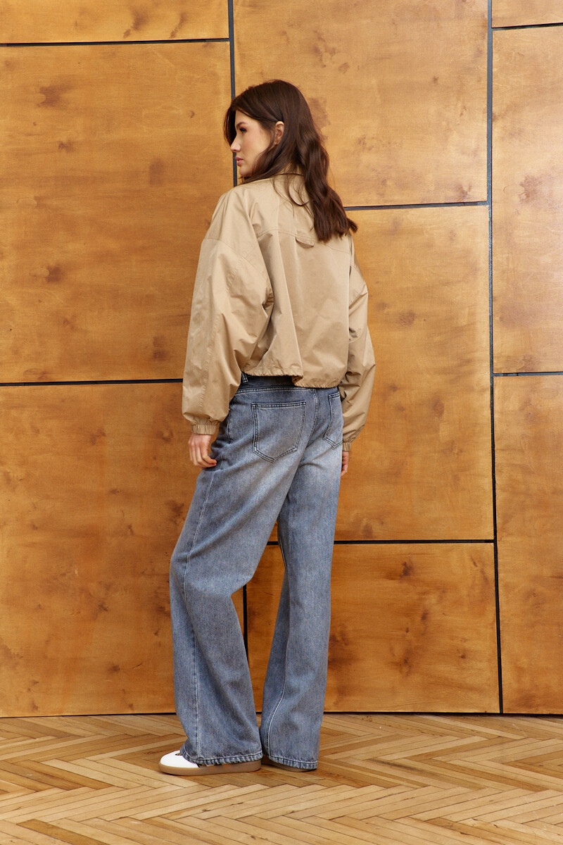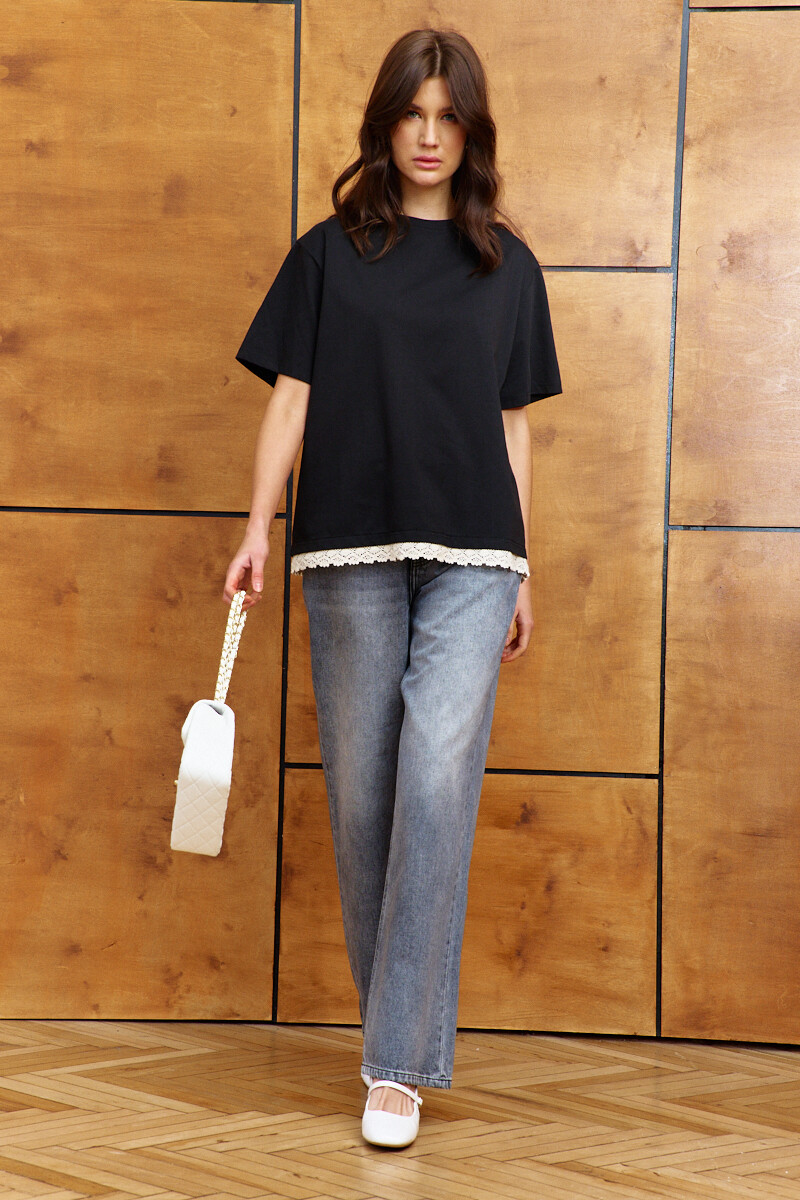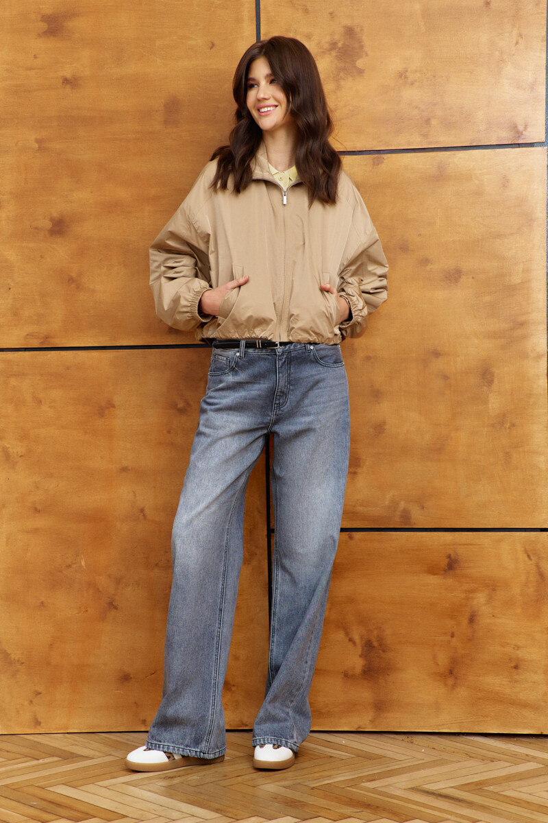 Брюки в стиле smart casual выполнены из хлопкового джинсового полотна. Модель с комфортной высокой посадкой на притачном поясе со шлёвками и застёгивающемся на декоративную пуговицу. Спереди предусмотрены карманы с отрезным бочком и застёжка на "молнию", сзади накладные карманы. Модель декорирована наличием отделочных строчек. Длина изделия по боковому шву (с поясом) 108 см.