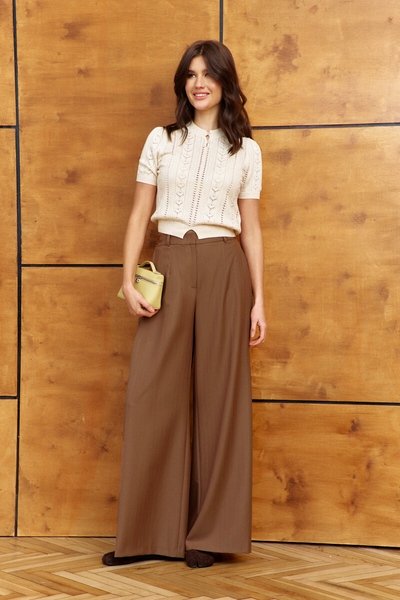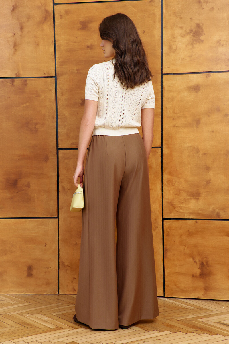 Элегантные брюки выполнены из костюмного полотна с актуальным дизайном "ёлочка". Модель с комфортной средней посадкой, на притачном поясе и эластичной тесьмой по спинке, застёгивающейся на потайной брючный крючок. Для удобства в носке спереди предусмотрены карманы с отрезным бочком и застежка на тесьму «молнию. Особым декоративным элементом является спереди деталь в виде складки от пояса до низа, которая фиксируется на поясе на петли и декоративные пуговицы. Длина изделия (с поясом) 112 см.