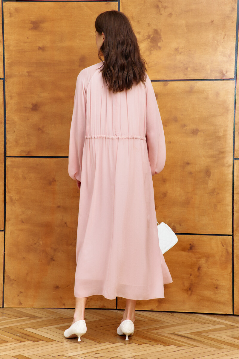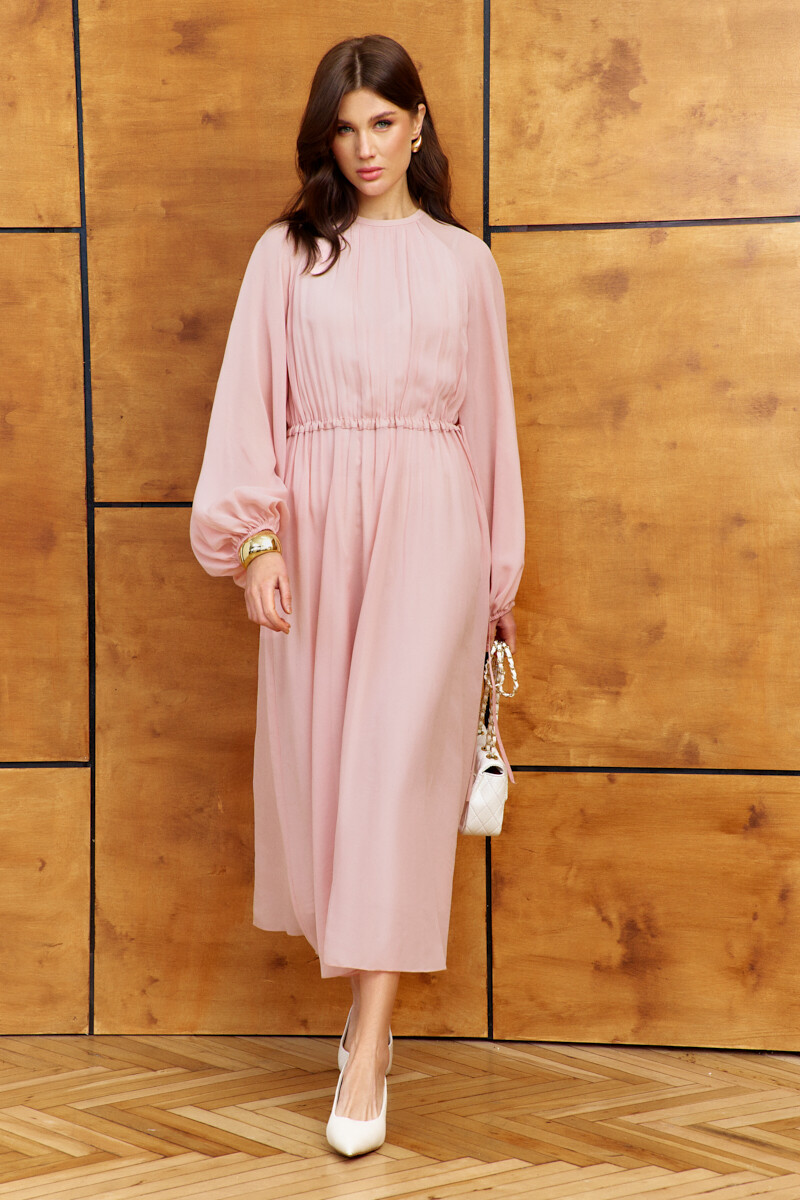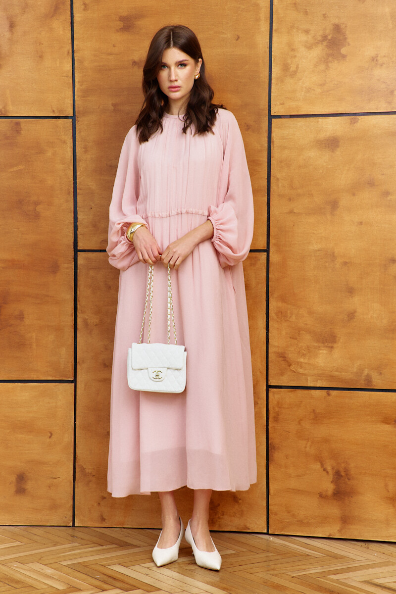 Платье в стиле City Chic выполнена из полупрозрачного вискозного полотна. Модель свободного силуэта, отрезное по линии талии с кулисой, через которую протянут съёмный завязывающийся пояс-шнур из основного полотна. Воротником-стойка. По горловине спинки и переда выполнена сборка. Для удобства в носке в среднем шве спинки потайная тесьма-молния. Рукава реглан длинные, расширенные со сборкой и эластичной тесьмой внизу. Модель на подкладке из вискозного полотна. Длина изделия 128 см; длина рукава (от горловины) 77 см.