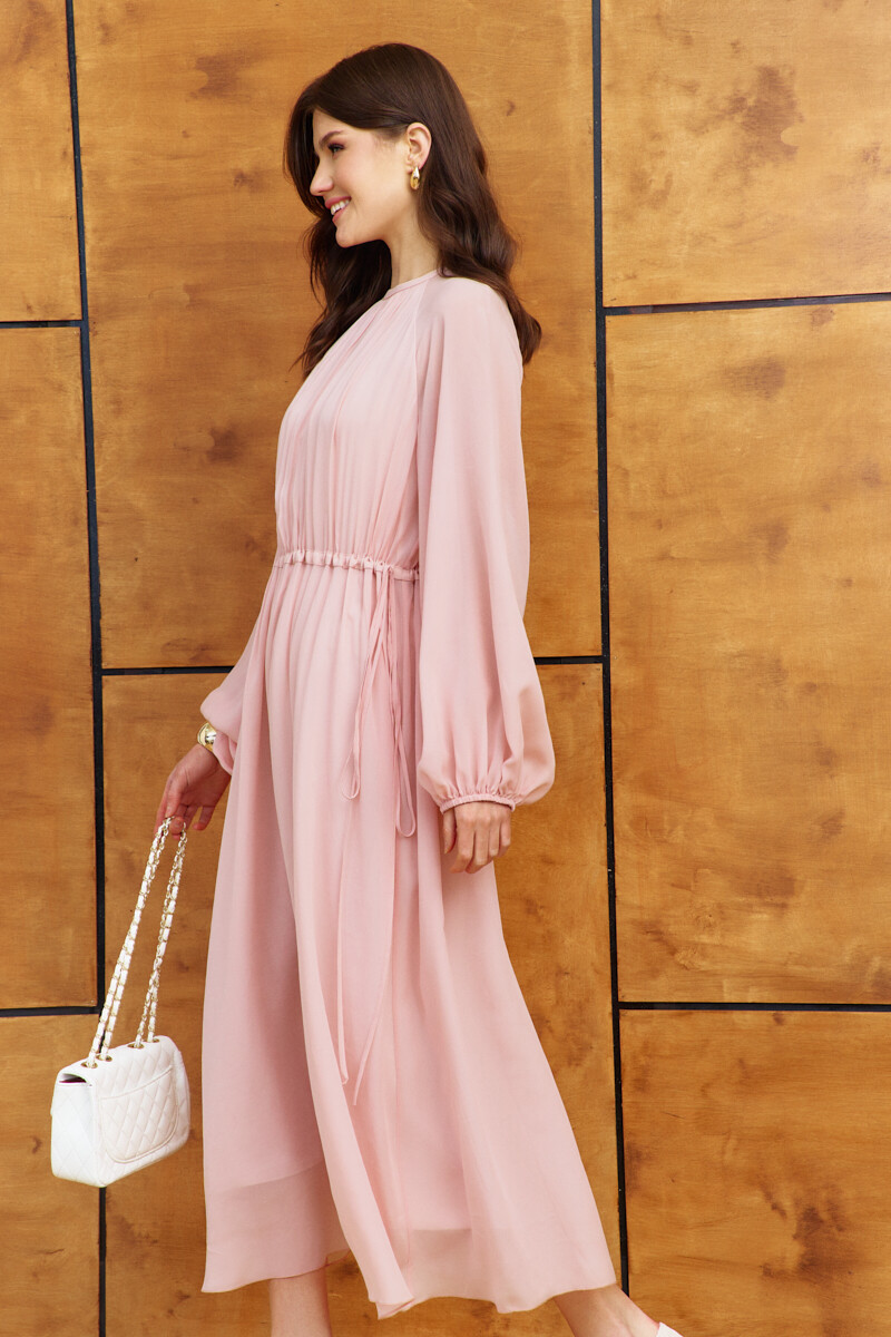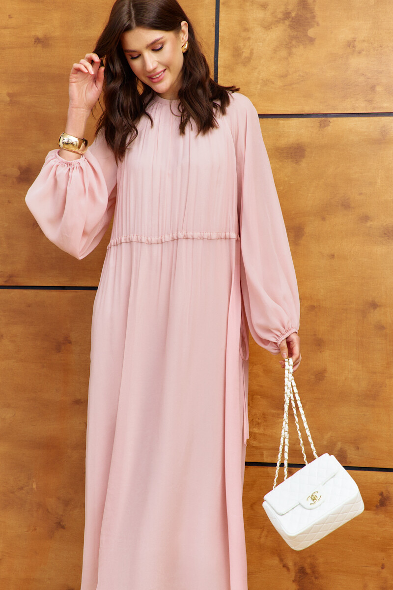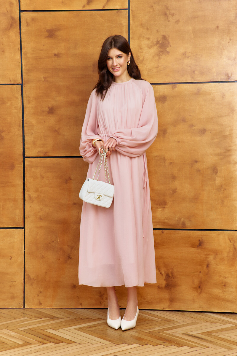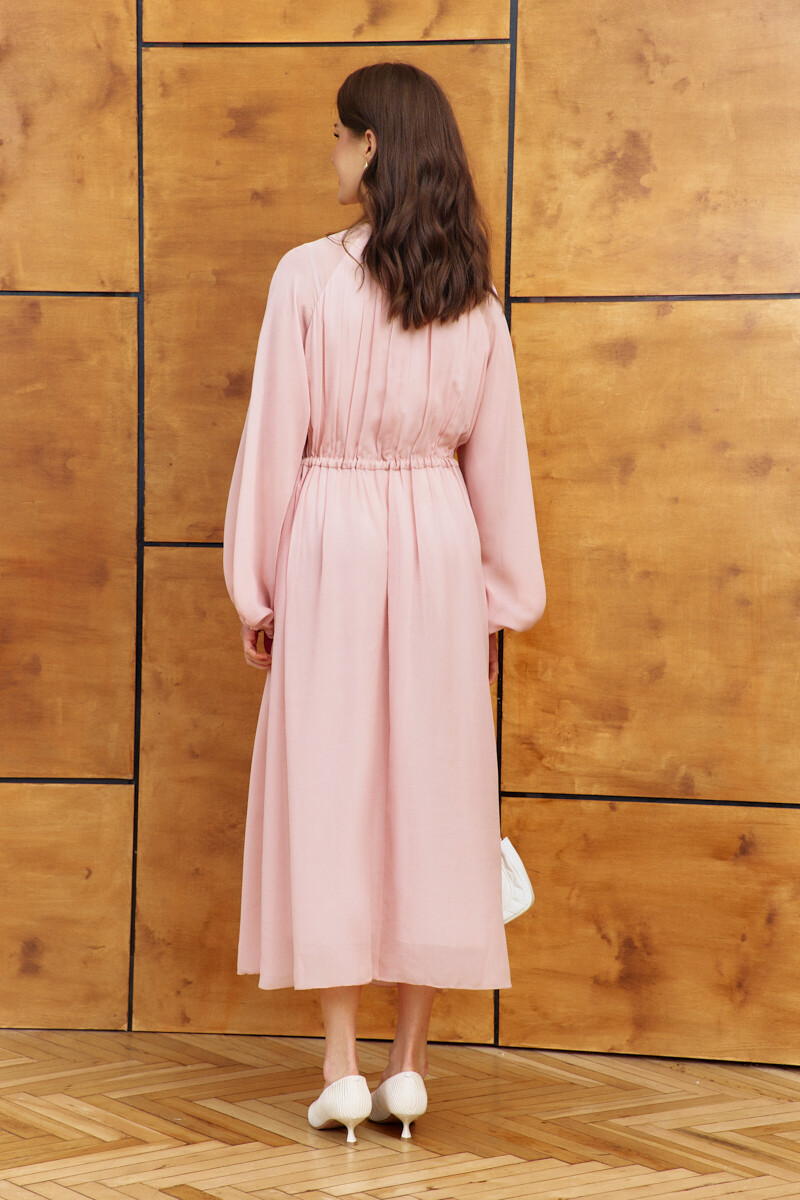 Платье в стиле City Chic выполнена из полупрозрачного вискозного полотна. Модель свободного силуэта, отрезное по линии талии с кулисой, через которую протянут съёмный завязывающийся пояс-шнур из основного полотна. Воротником-стойка. По горловине спинки и переда выполнена сборка. Для удобства в носке в среднем шве спинки потайная тесьма-молния. Рукава реглан длинные, расширенные со сборкой и эластичной тесьмой внизу. Модель на подкладке из вискозного полотна. Длина изделия 128 см; длина рукава (от горловины) 77 см.