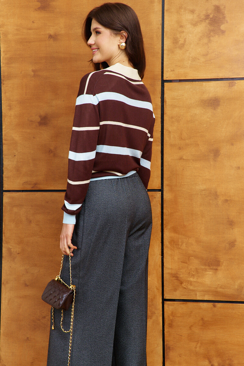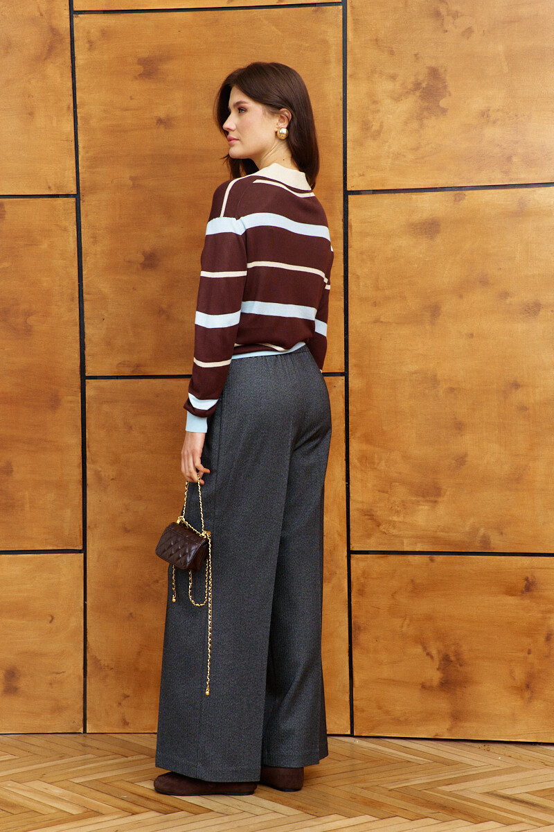 Классические свободные брюки выполнены из костюмного полотна с дизайном "ёлочка". Модель с комфортной высокой посадкой; на притачном поясе и эластичной лентой внутри по спинке; застёгивающимся на потайной брючный крючок. Спереди предусмотрены карманы и застёжка на тесьму "молнию". Длина изделия по боковому шву (с поясом) 110 см.
