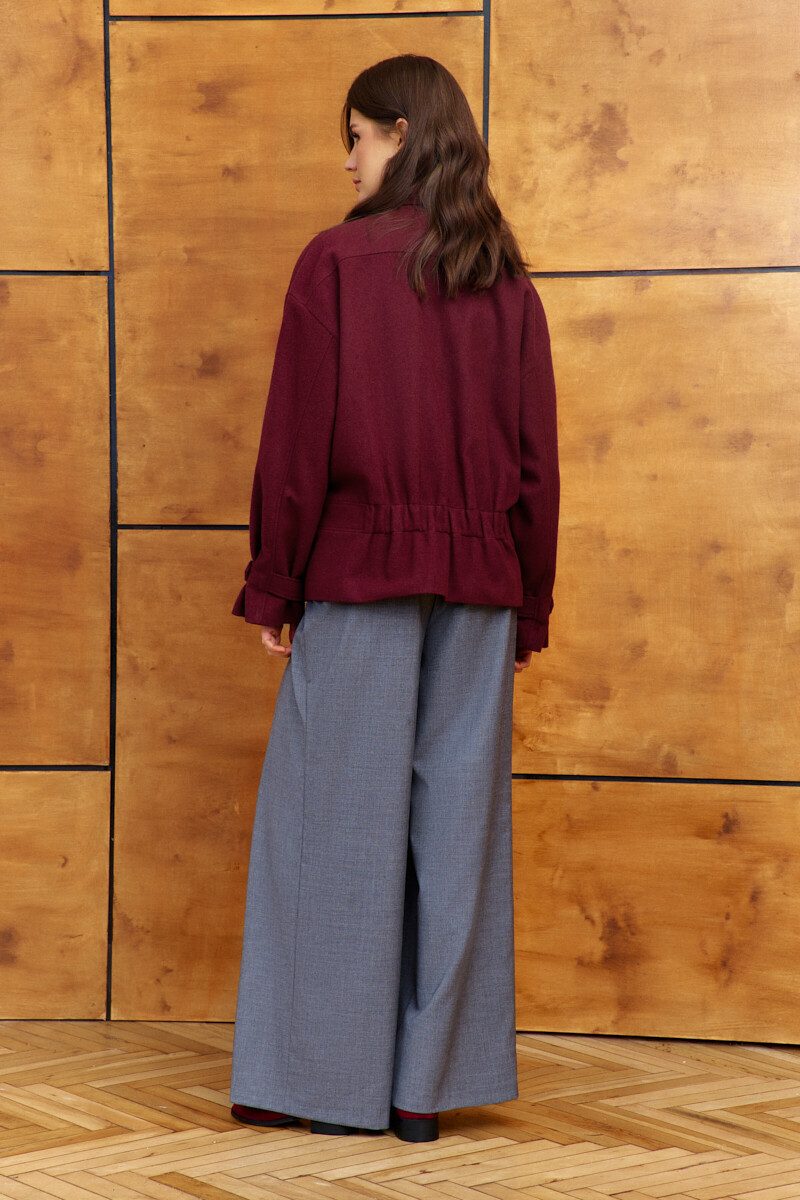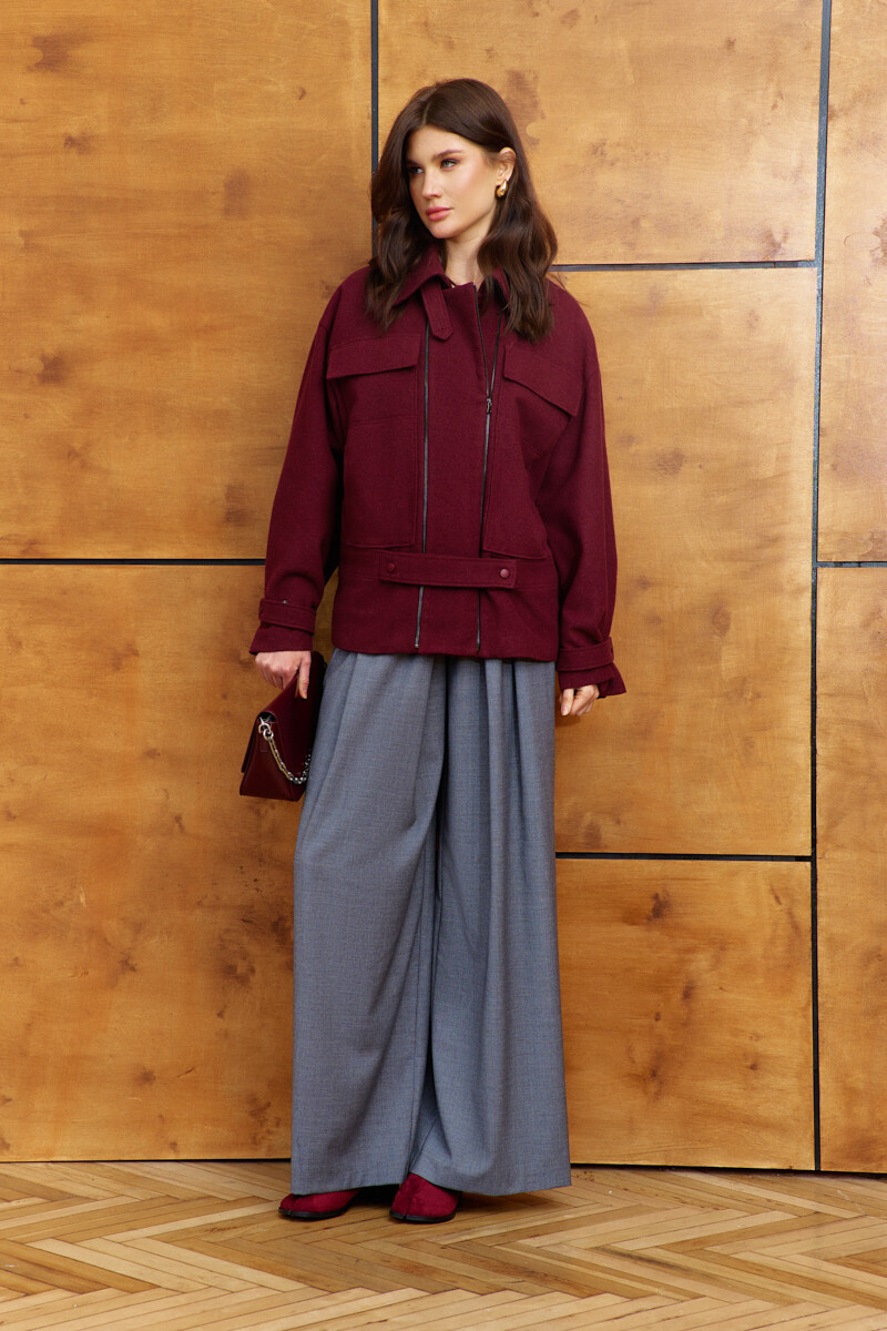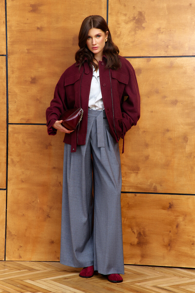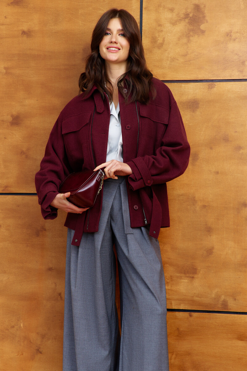 Стильный и практичный жакет на подкладке является отличным выбором для создания разнообразных модных образов. Изделие выполнено из пальтового полотна. Модель свободного силуэта, со спущенной линией плеча. Воротник стояче-отложной на стойке с патой на петлю и декоративную пуговицу, центральная застёжка на две металлические тесьмы "молнии". На деталях переда выполнены функциональные накладные карманы с клапаном. Втачной пояс, расположенный ниже талии, создает легкий наплыв при застежке, а его отлетная часть с пробивными кнопками добавляет функциональности и возможности для стилистических экспериментов. На спинке отрезная кокетка и втачной пояс на уровне ниже талии, с резинкой по центру. Длинные втачные рукава с застроченной складкой и хлястиком застегивающимся на пробивную кнопку, который позволяет регулировать объем, создавая выразительные складки по низу. Длина изделия 67 см; длина рукава (от горловины) 77 см.