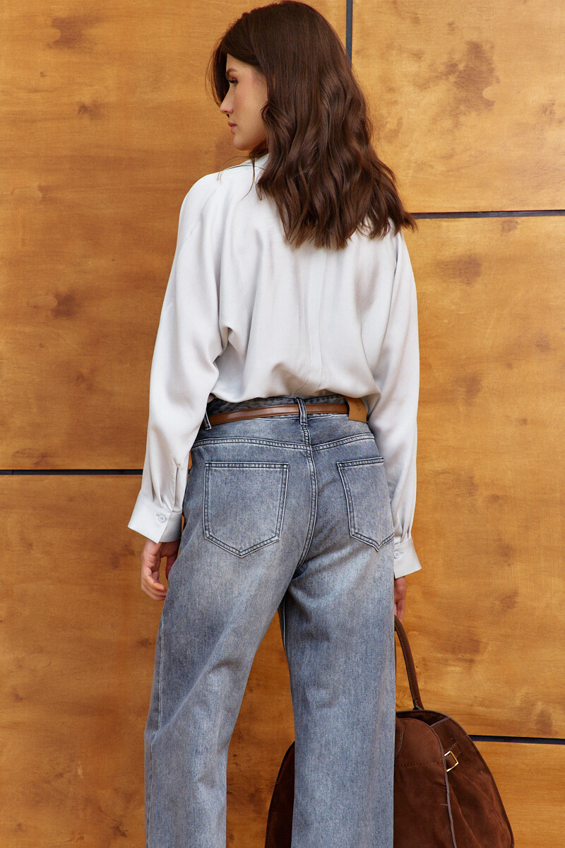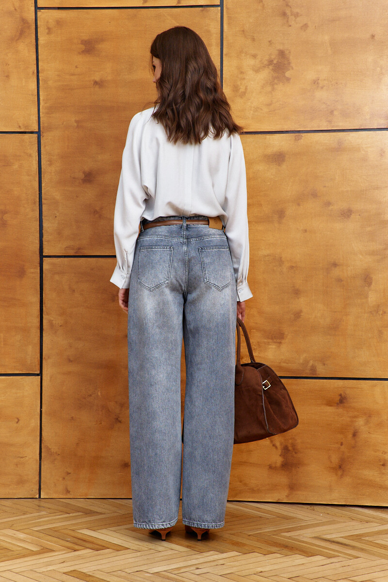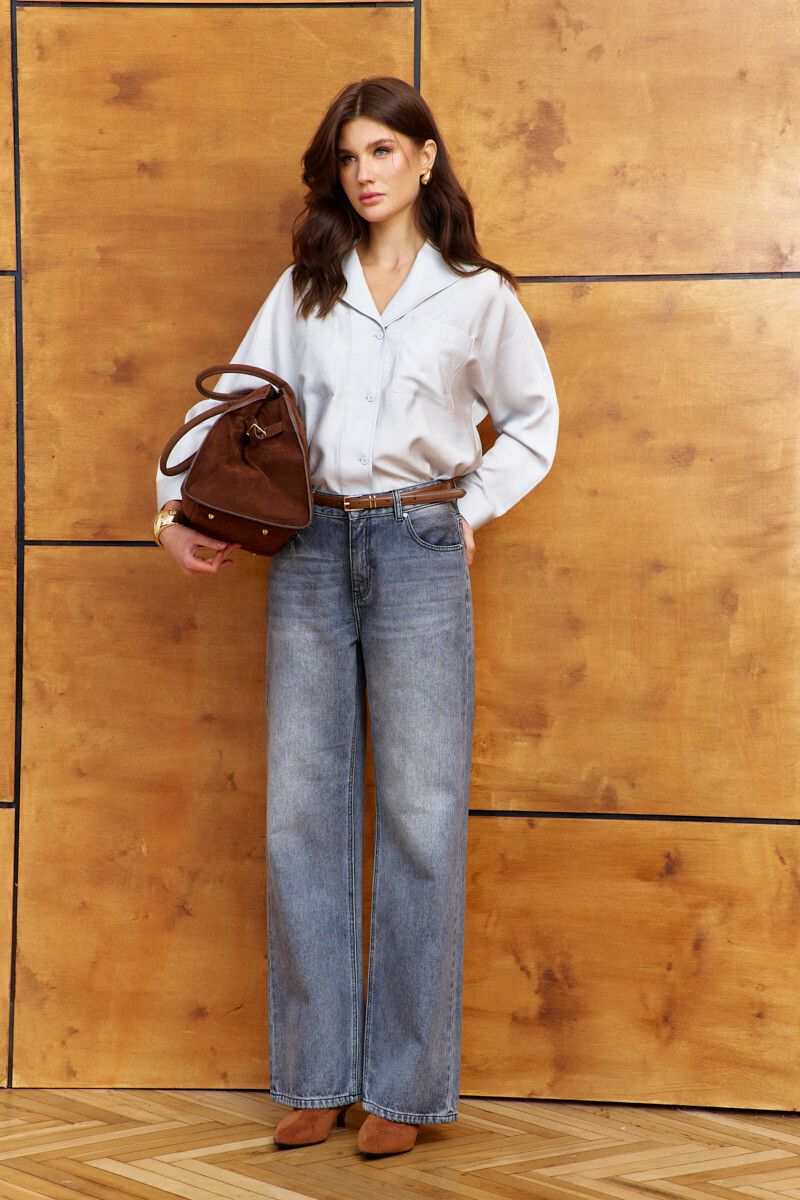 Брюки в стиле smart casual выполнены из хлопкового джинсового полотна. Модель с комфортной высокой посадкой на притачном поясе со шлёвками и застёгивающемся на декоративную пуговицу. Спереди предусмотрены карманы с отрезным бочком и застёжка на "молнию", сзади накладные карманы. Модель декорирована наличием отделочных строчек. Длина изделия по боковому шву (с поясом) 108 см.