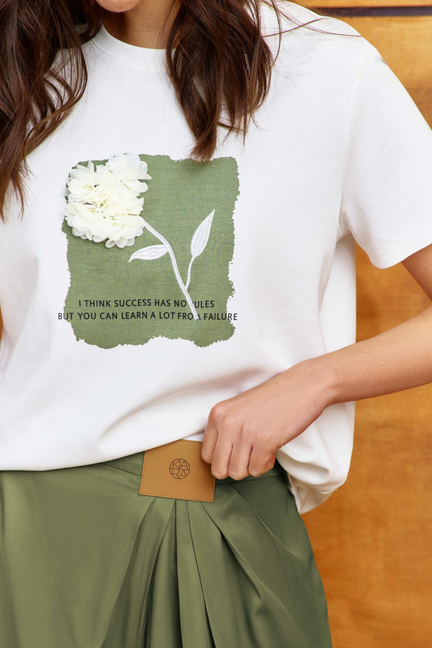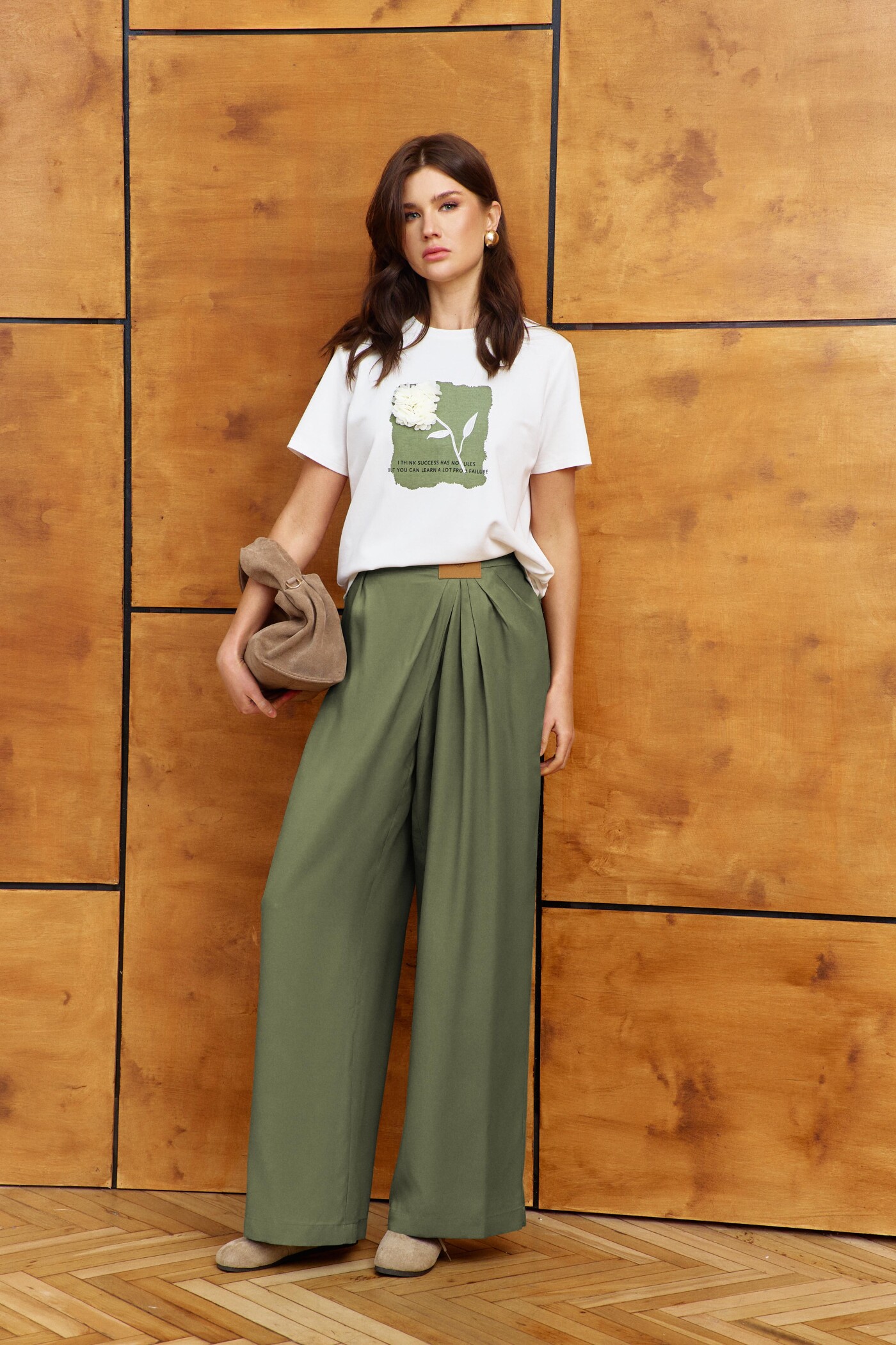 Джемпер выполнен из хлопкового трикотажного полотна высокого качества, обладающего рядом положительных свойств: мягкость, эластичность и устойчивость к деформации. Модель свободного кроя, со спущенной линией плеча и коротким рукавом. Горловина обработана узкой бейкой, а по спинке усилена тесьмой с целью предотвращения ее деформации. Деталь переда декорирована авторской дизайнерской печатью. Длина по спинке 66 см; длина рукава (от горловины) 39,5 см.