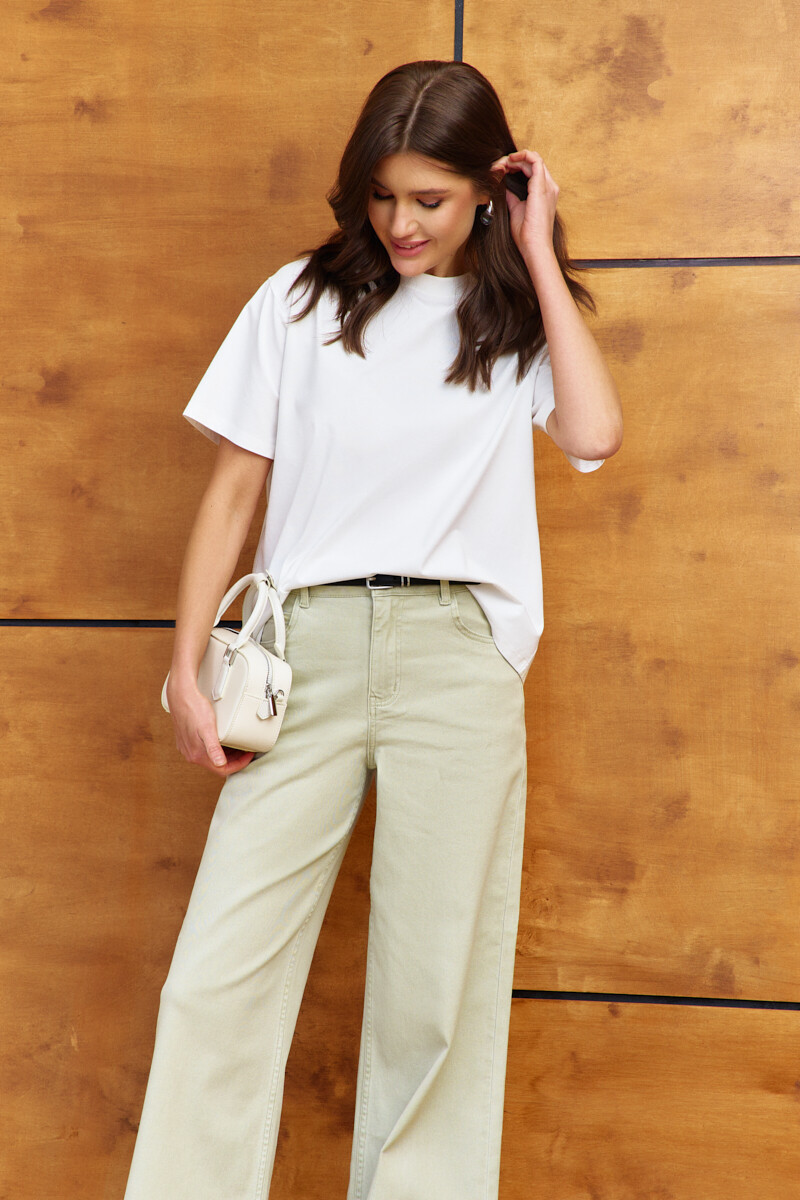 Джемпер выполнен из хлопкового трикотажного полотна высокого качества, обладающего рядом положительных свойств: мягкость, эластичность и устойчивость к деформации. Модель свободного кроя, со спущенной линией плеча и коротким рукавом. Горловина обработана узкой бейкой, а по спинке усилена тесьмой с целью предотвращения ее деформации. Длина по спинке 66 см; длина рукава (от горловины) 39,5 см.