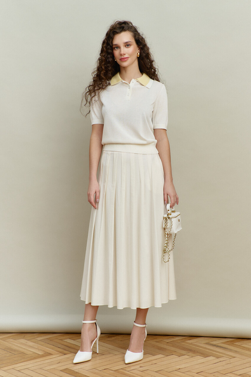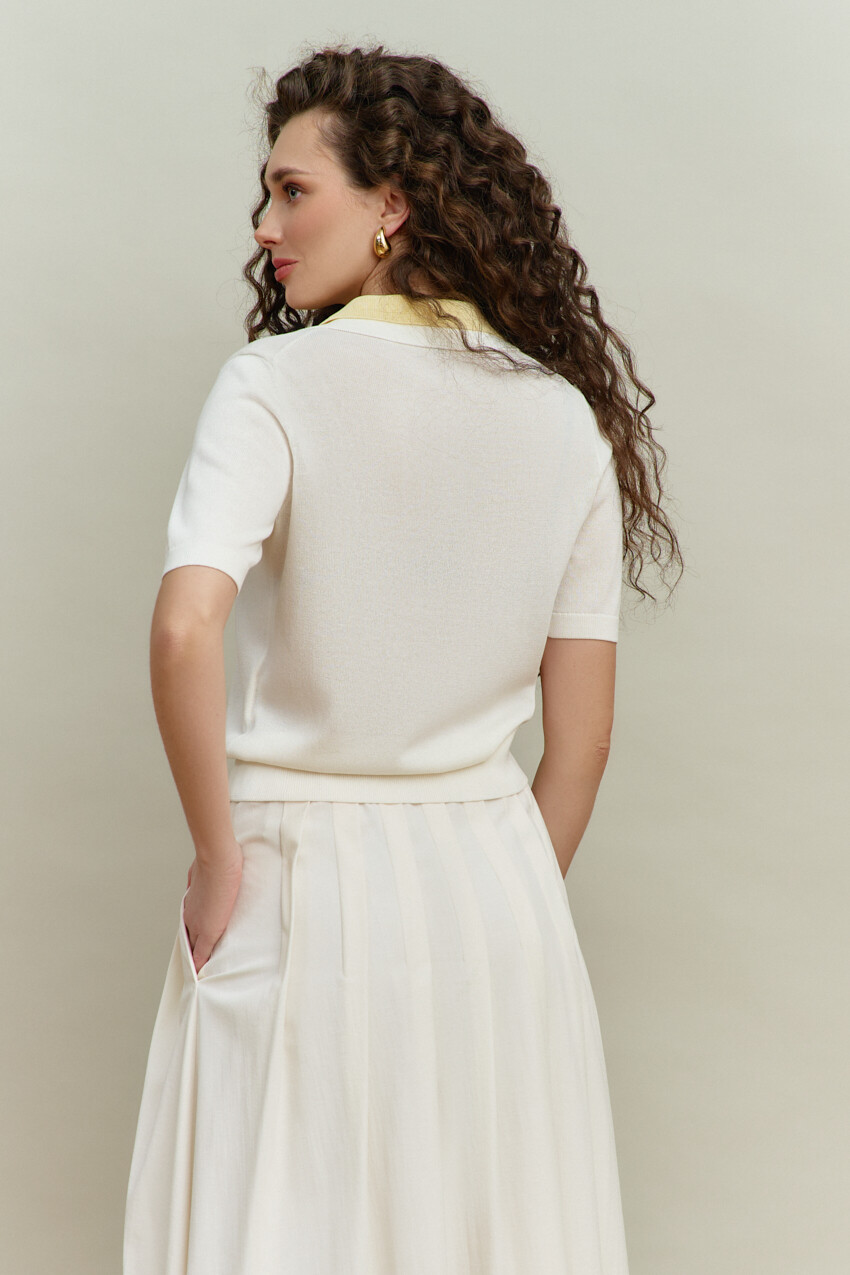 Джемпер прилегающего силуэта выполнен из трикотажного полотна. Модель с планкой на петли и декоративные пуговицы. Особый вид изделию придает отложным двойной разного цвета воротник. Рукава и низ изделия оформлены узкой манжетой в виде резинки. Длина изделия 54 см; длина рукава 27 см.