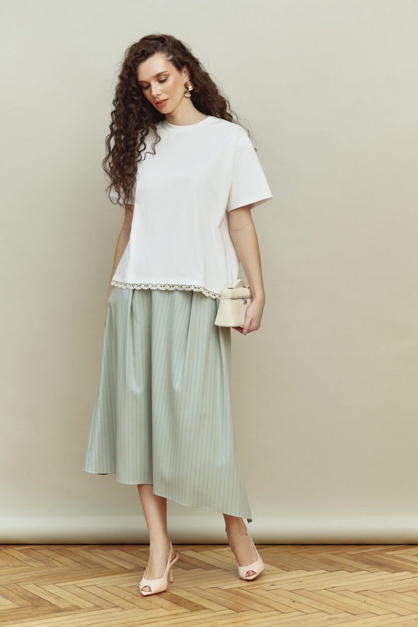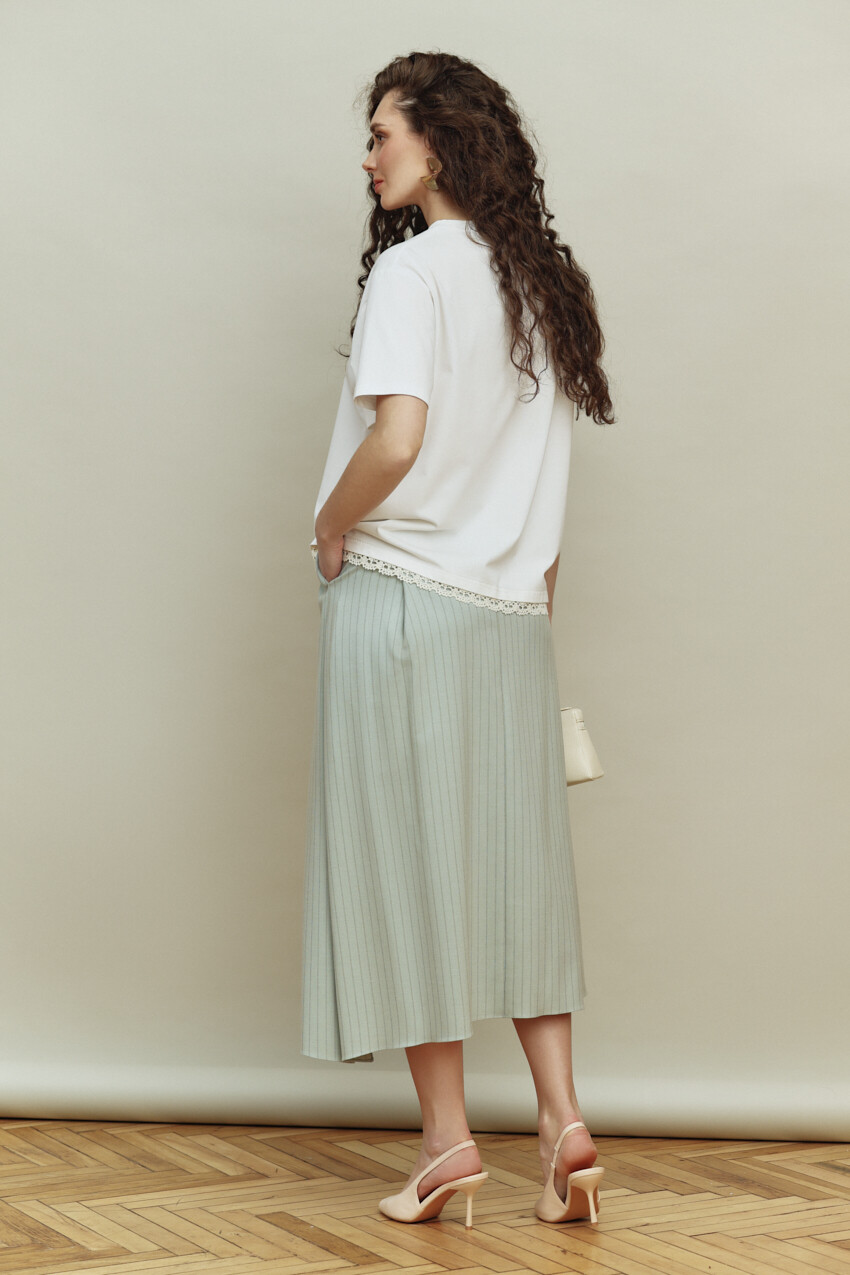 Элегантная юбка на подкладке, выполненная из костюмного полотна с актуальным дизайном, в основе которого лежит полоска "Chalk strip". Модель расширена к низу, с разрезом в левом боковом шве, асимметричным низом и длиной миди. Спереди предусмотрены карманы с отрезным бочком и заложены три односторонние складки. Сзади предусмотрена застёжка на потайную тесьму "молнию"; на левой части юбки заложена и застрочена глубокая односторонняя складка. Длина изделия 84 см.