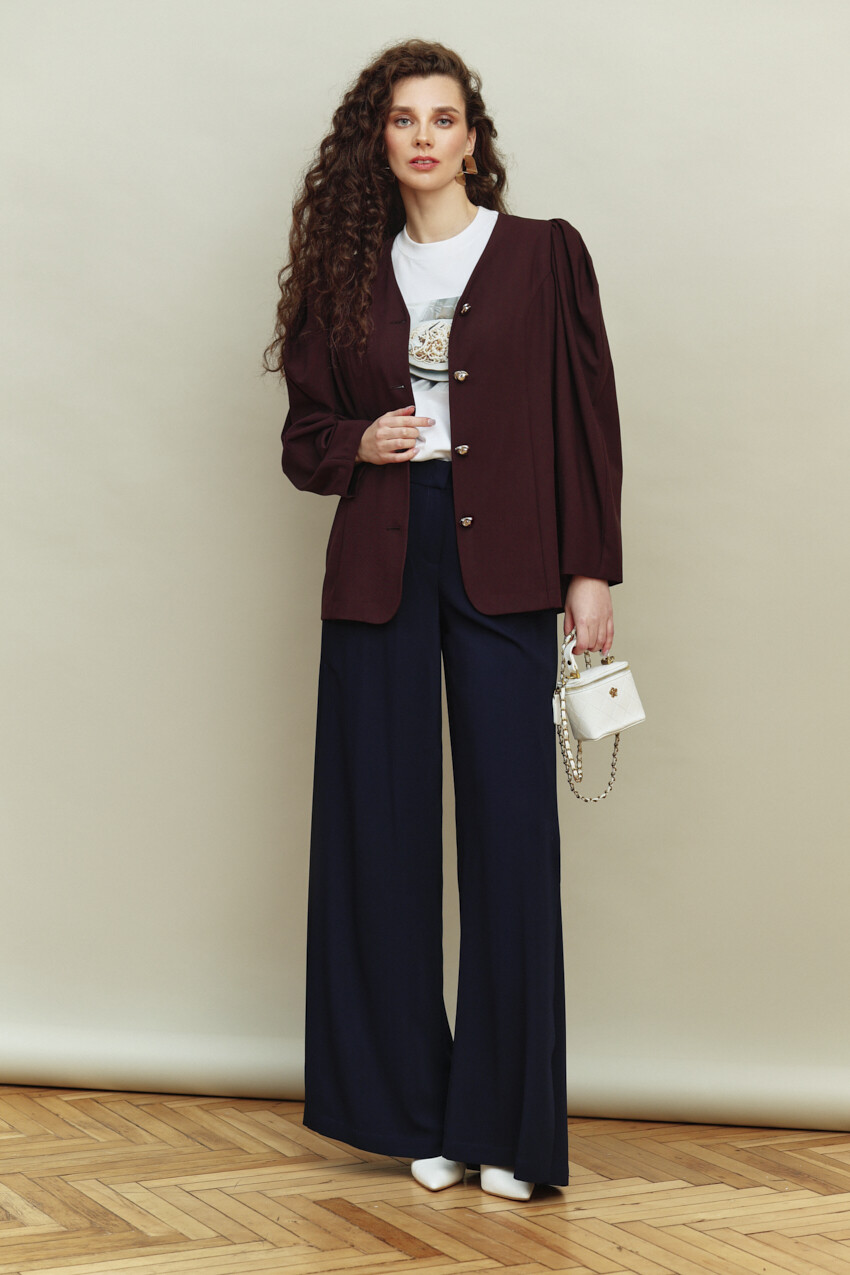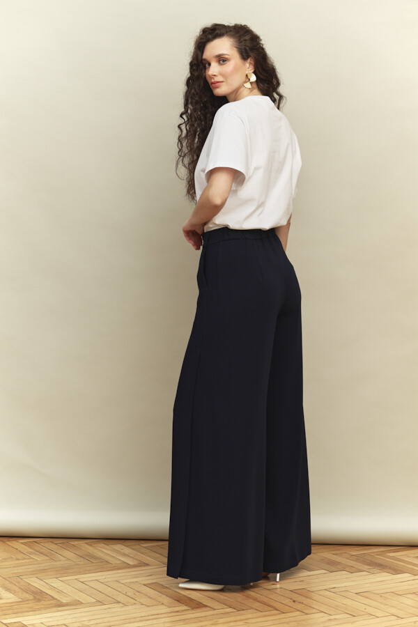 Классические свободные брюки выполнены из струящегося полотна.. Модель с комфортной высокой посадкой; на притачном поясе и эластичной лентой внутри по спинке; застегивающиеся на потайной брючный крючок. Спереди предусмотрены косые боковые карманы и застёжка на тесьму "молнию". Особым декоративным элементом высокие шлицы в швах переда. Длина изделия по боковому шву (с поясом) 112см.