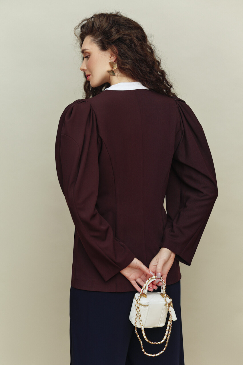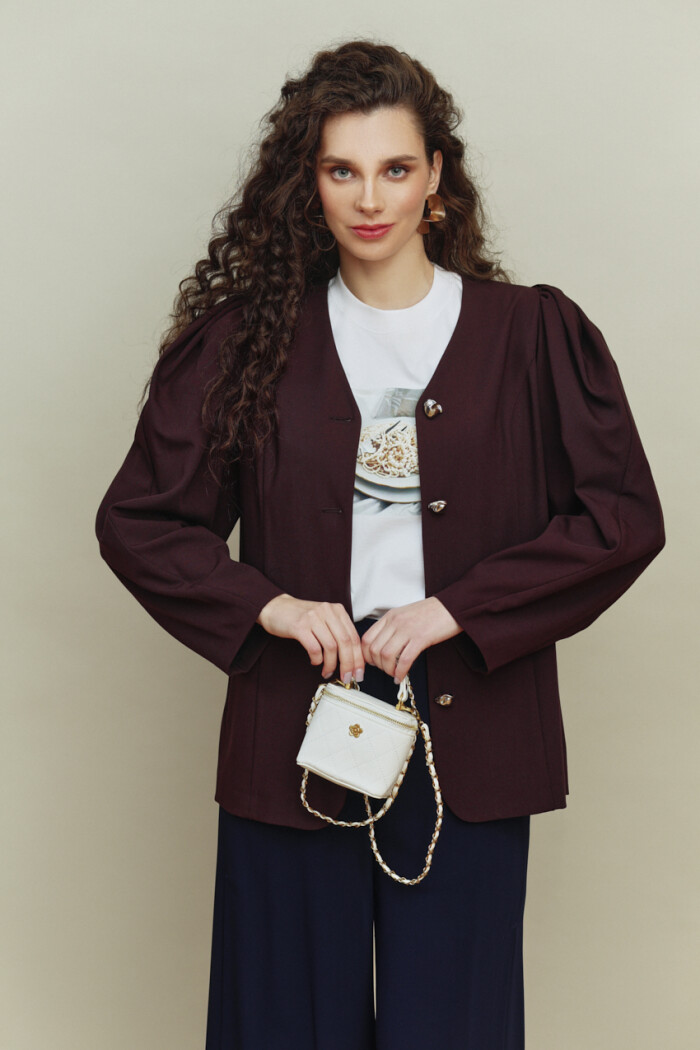 Стильный однобортный жакет без подкладки, выполнен из костюмного полотна. Модель полуприлегающего силуэта с V-образной горловиной и застежкой на четыре декоративные пуговицы и петли. Для удобства в носке спереди расположены карманы "в рамку". Особым декоративным элементом являются объёмные длинные рукава со сборкой и складками по окату. Длина изделия 69 см; длина рукава 65 см.