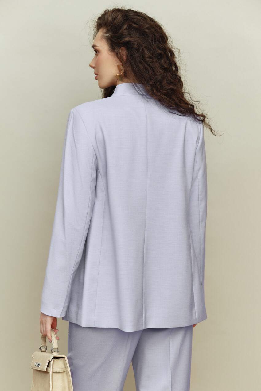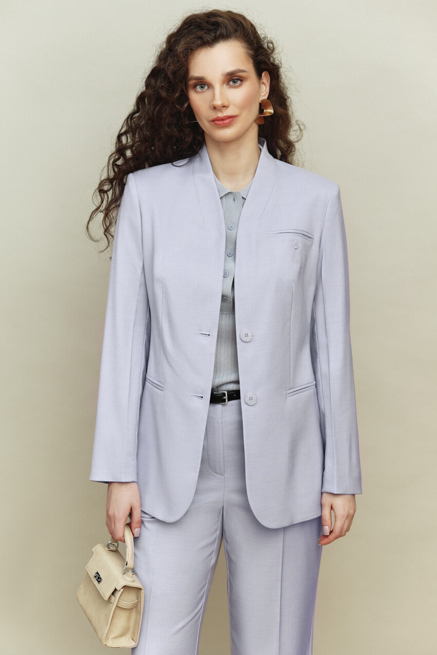 Женственный однобортный жакет на подкладке, выполнен из костюмного полотна. Модель полуприлегающего силуэта с цельнокроеным воротником-стойкой и застежкой на две декоративные пуговицы и петли. Для удобства в носке спереди расположены карманы "в рамку". Левая часть переда дополнена нагрудным карманом "в рамку" с застежкой на декоративную пуговицу и петлю. Рукава длинные со шлицей. Жакет дополняется поясом из основного полотна с застежкой на декоративную пуговицу и петлю. Длина изделия 70см.; длина рукава 61см.