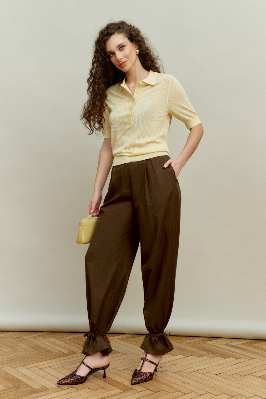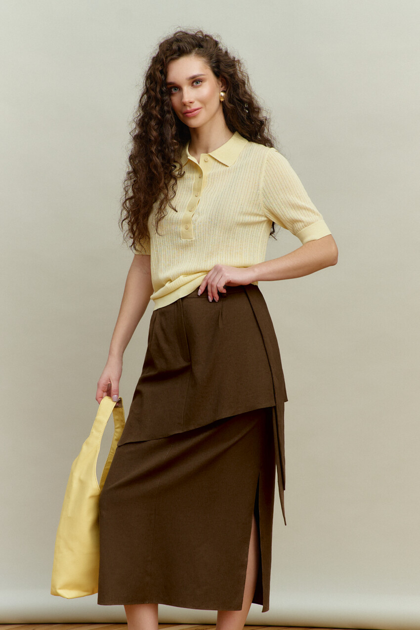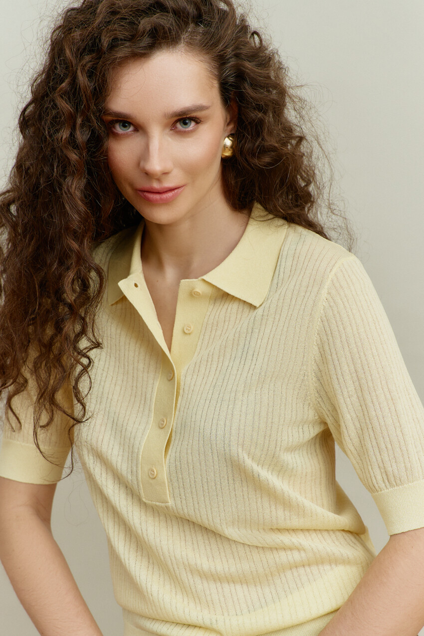 Джемпер прилегающего силуэта выполнен из трикотажного полотна в рубчик. Модель с планкой на петли и декоративные пуговицы и отложным воротником. Рукава и низ изделия оформлены узкой манжетой в виде резинки. Длина изделия 60 см; длина рукава 30 см.
