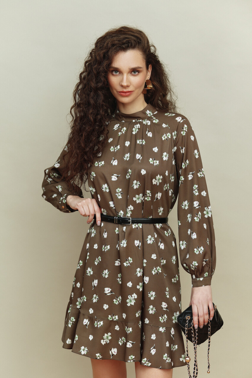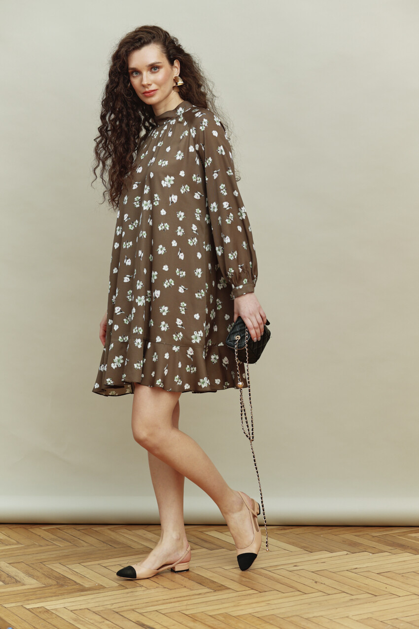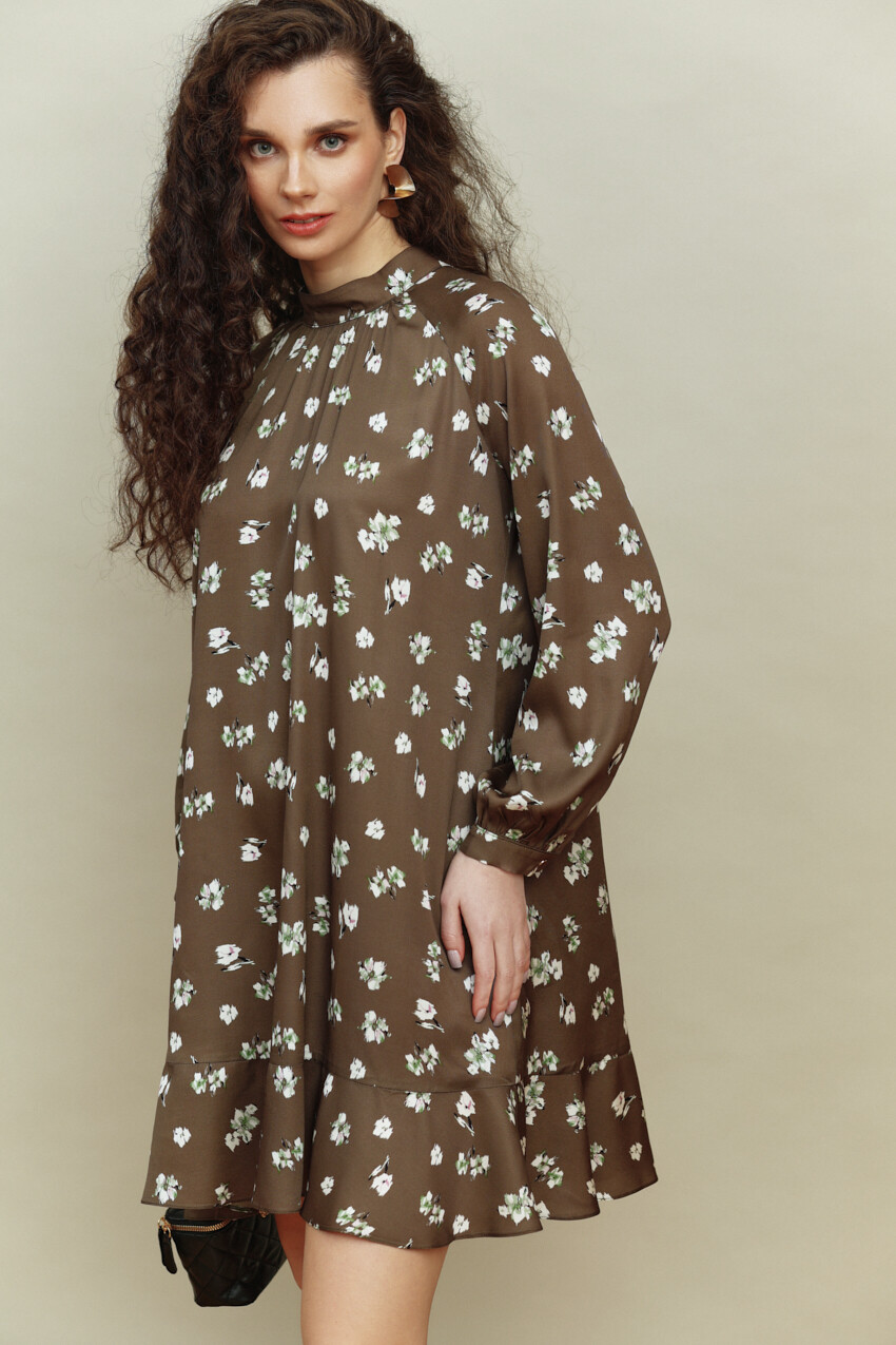 Платье выполнено из вискозного полотна с оригинальным дизайнерским принтом. Модель А-образного силуэта. Горловина стойка со сборкой на центральной части переда и спинки. Низ изделия оформлен рюшей со сборкой. Рукава-реглан длинные на притачной манжете. Длина изделия 92 см; длина рукава (от горловины) 72 см.