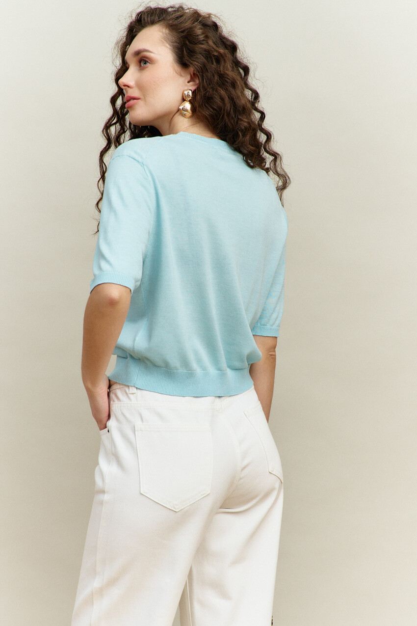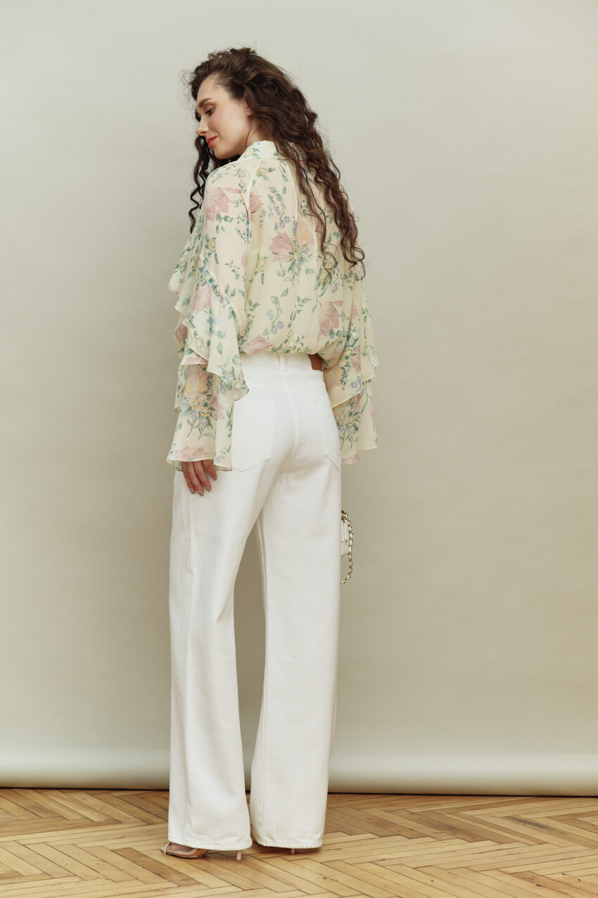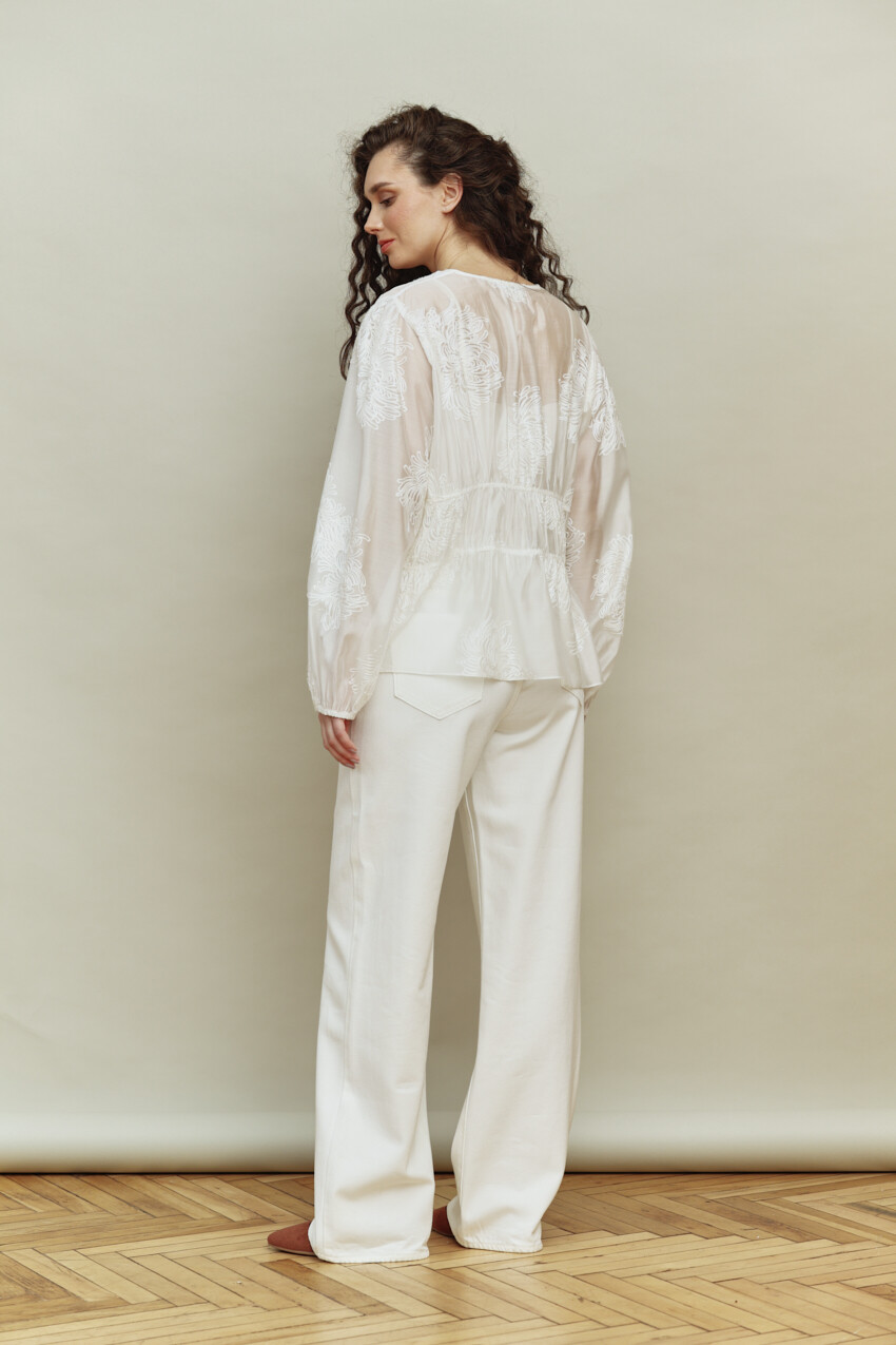 Брюки в стиле smart casual выполнены из хлопкового джинсового полотна. Модель с комфортной высокой посадкой на притачном поясе со шлёвками и застёгивающемся на декоративную пуговицу. Спереди предусмотрены карманы с отрезным бочком и застёжка на "молнию", сзади накладные карманы. Модель декорирована наличием отделочных строчек. Длина изделия по боковому шву (с поясом) 108 см.