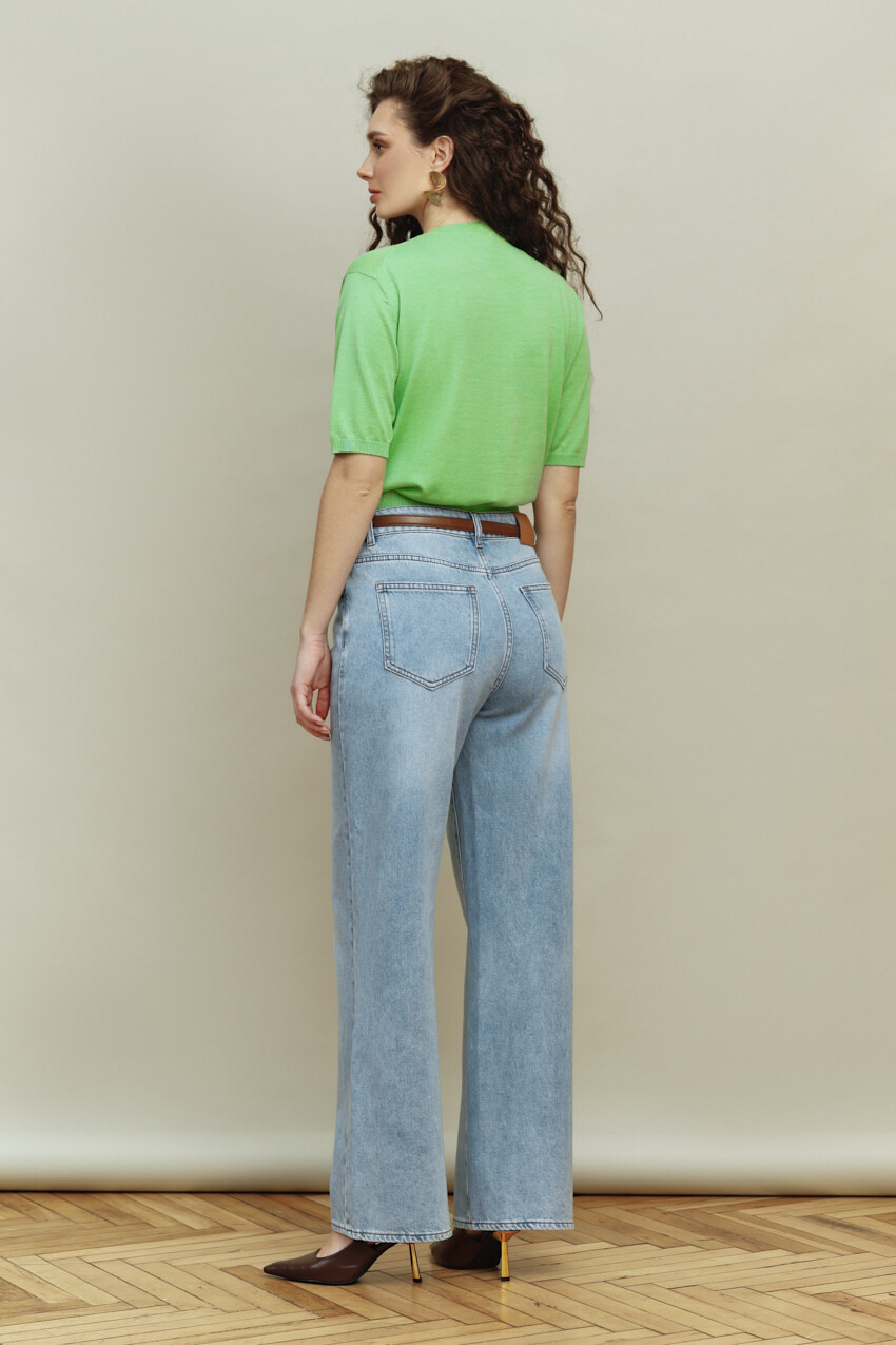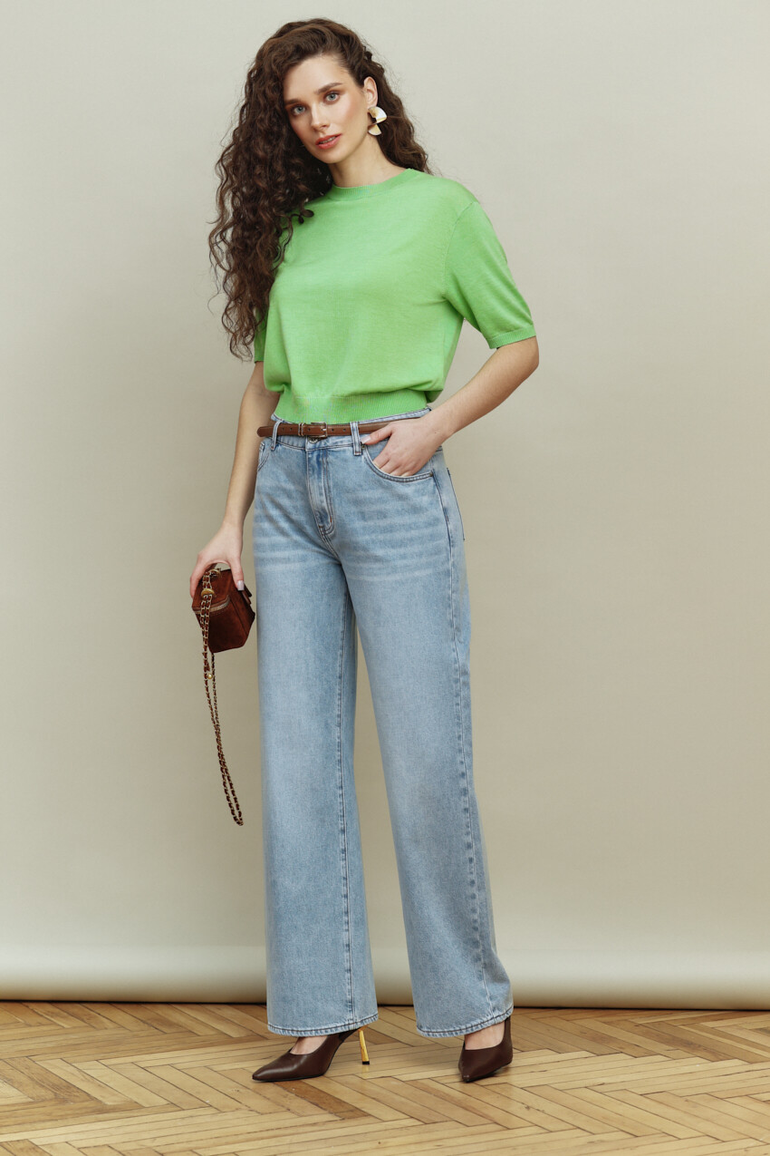 Брюки в стиле smart casual выполнены из хлопкового джинсового полотна. Модель с комфортной высокой посадкой на притачном поясе со шлёвками и застёгивающемся на декоративную пуговицу. Спереди предусмотрены карманы с отрезным бочком и застёжка на "молнию", сзади накладные карманы. Модель декорирована наличием отделочных строчек. Длина изделия по боковому шву (с поясом) 108 см.