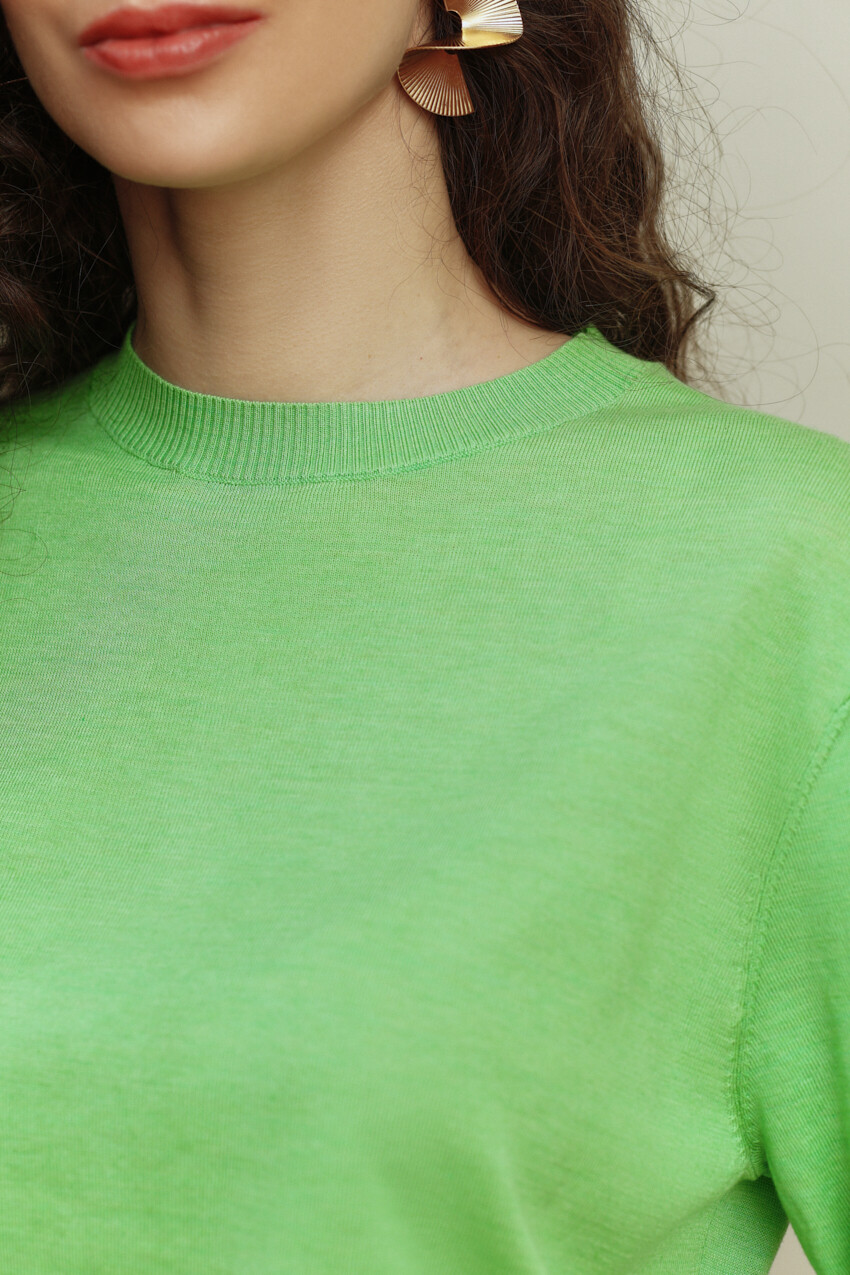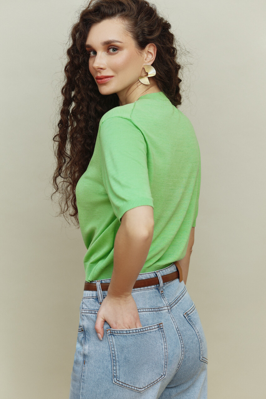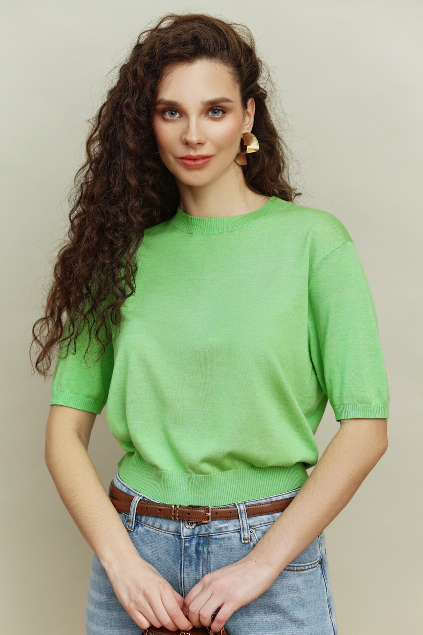 Джемпер вязаный полуприлегающего силуэта вязки "лицевая гладь". Модель длиной выше линии бедер. Круглый вырез горловины. Укороченный рукав. Низ изделия и рукава оформлен манжетой. Базовая модель, подойдет к любому типу гардероба. Длина изделия 53 см; длина рукава 26 см.