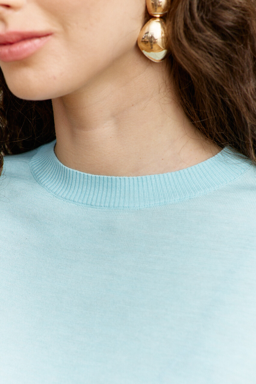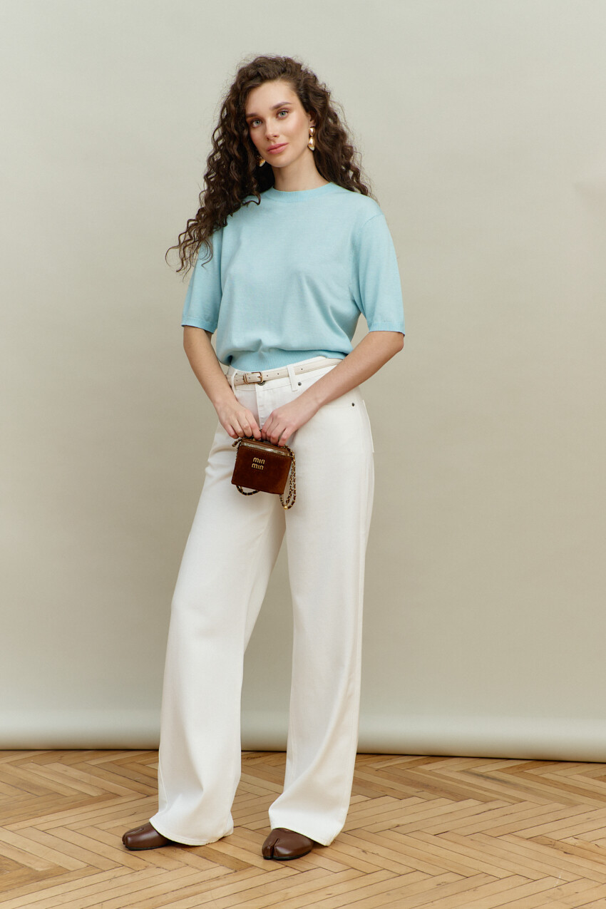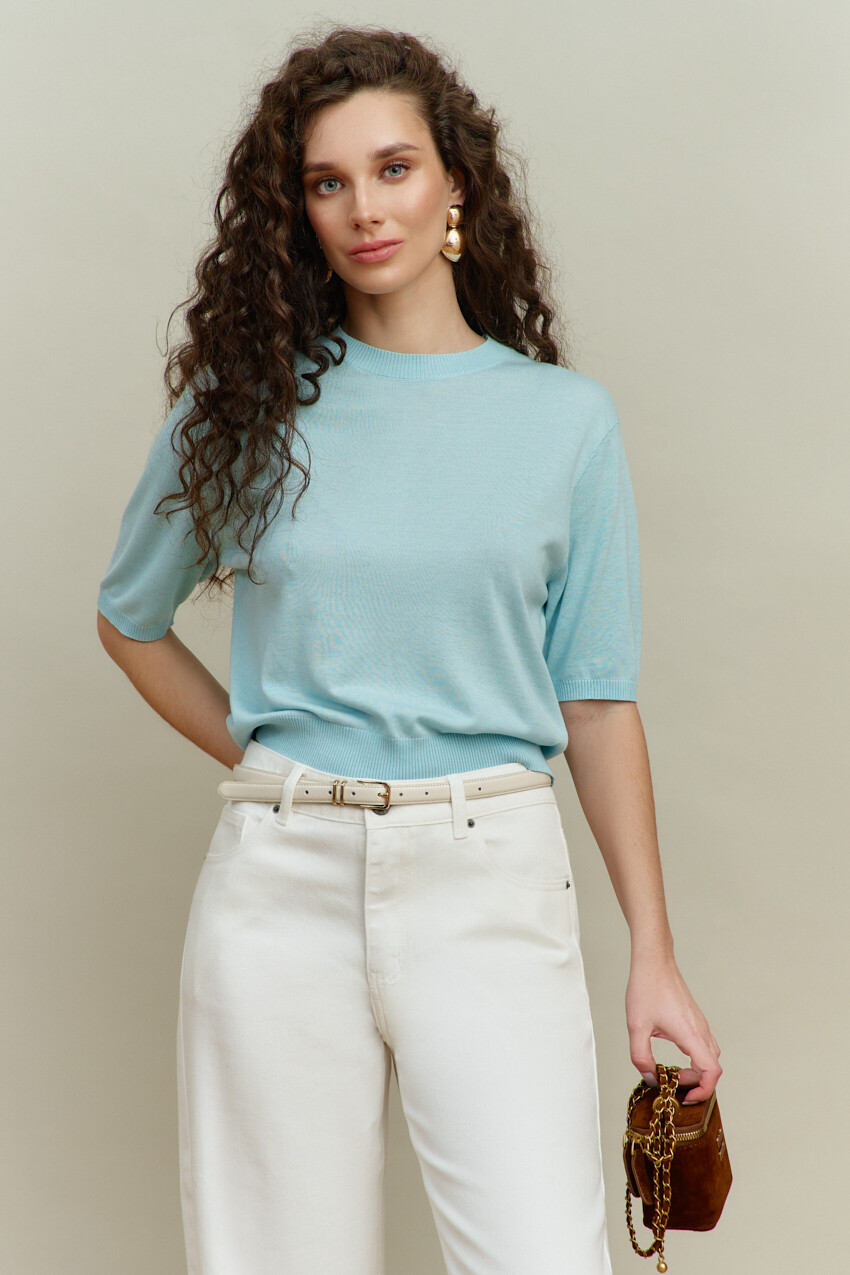 Джемпер вязаный полуприлегающего силуэта вязки "лицевая гладь". Модель длиной выше линии бедер. Круглый вырез горловины. Укороченный рукав. Низ изделия и рукава оформлен манжетой. Базовая модель, подойдет к любому типу гардероба. Длина изделия 53 см; длина рукава 26 см.