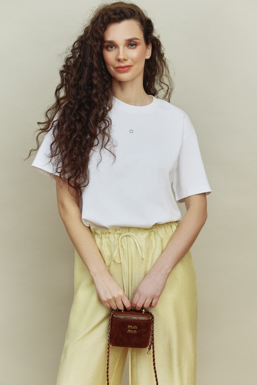 Джемпер выполнен из хлопкового трикотажного полотна высокого качества, обладающего рядом положительных свойств: мягкость, эластичность и устойчивость к деформации. Модель свободного кроя, со спущенной линией плеча и коротким рукавом. Горловина обработана узкой бейкой, а по спинке усилена тесьмой с целью предотвращения ее деформации. Особый вид изделию придает декоративная печать. Длина по спинке 66 см; длина рукава (от горловины) 39,5 см.