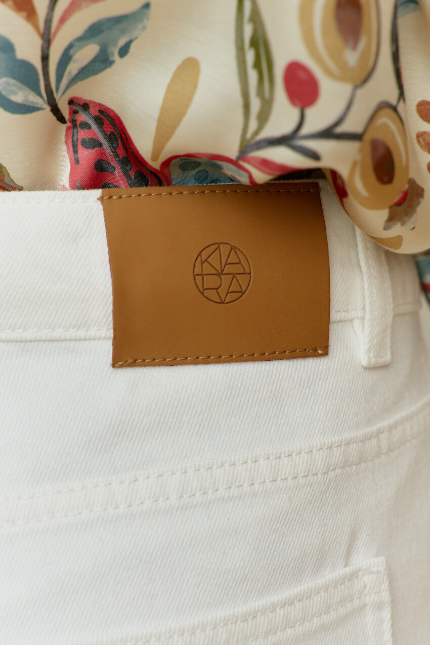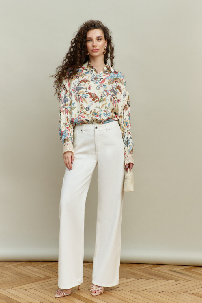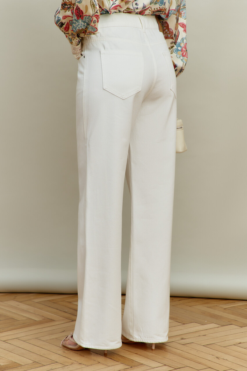 Брюки в стиле smart casual выполнены из хлопкового джинсового полотна. Модель с комфортной высокой посадкой на притачном поясе со шлёвками и застёгивающемся на декоративную пуговицу. Спереди предусмотрены карманы с отрезным бочком и застёжка на "молнию", сзади накладные карманы. Модель декорирована наличием отделочных строчек. Длина изделия по боковому шву (с поясом) 108 см.
