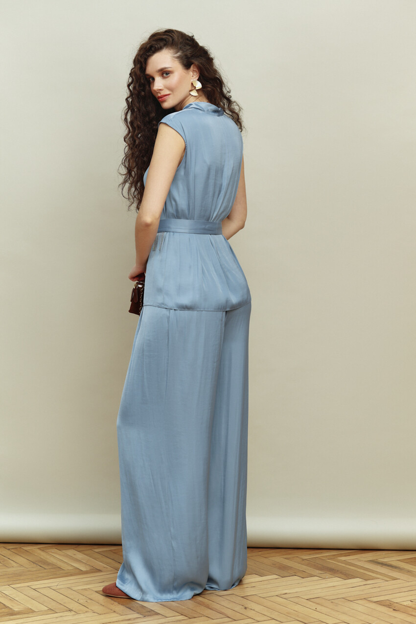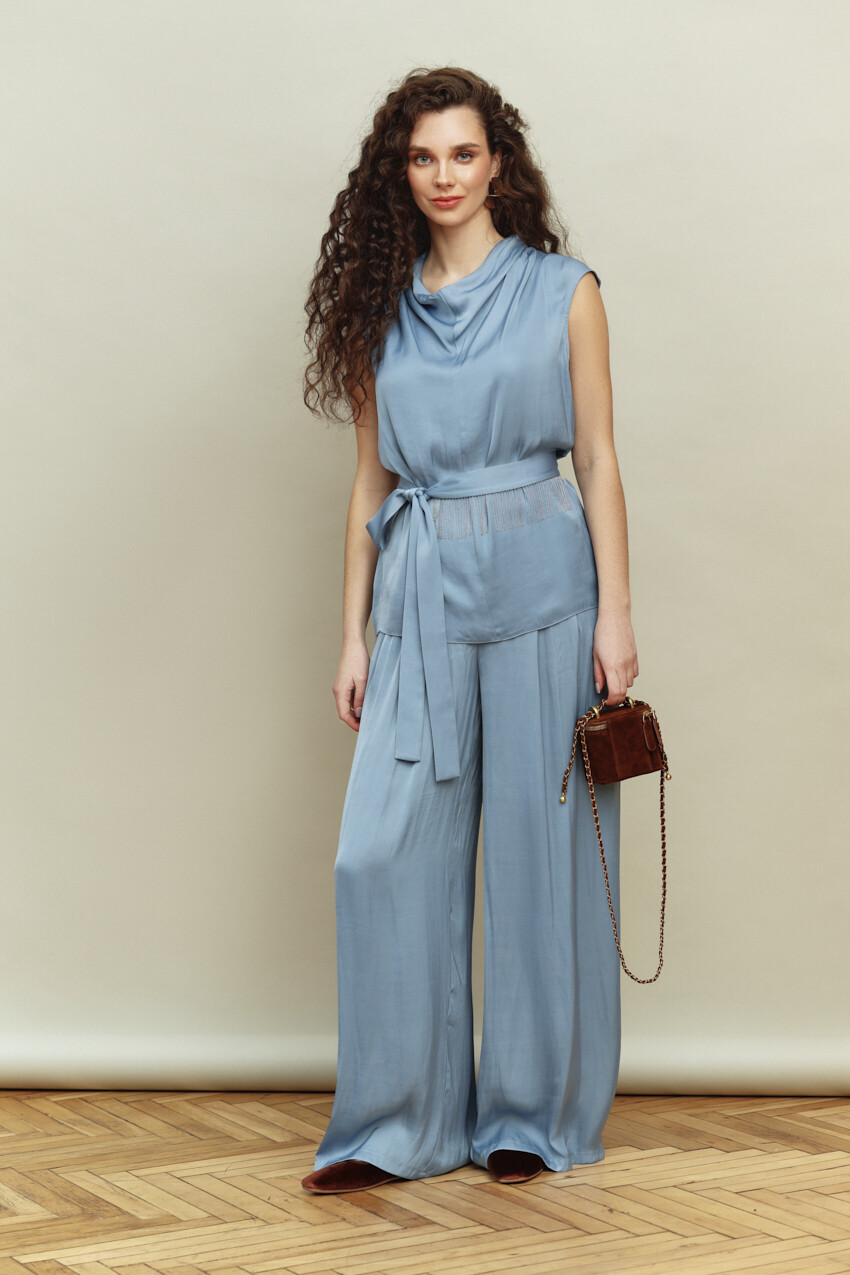 Свободные брюки в стиле city chic выполнены из сатинового полотна с лёгким блеском. Модель с комфортной средней посадкой, на притачном поясе и эластичной тесьмой по спинке со шлевками. Спереди предусмотрены карманы с отрезным бочком и складками. Длина изделия (с поясом) 113 см.