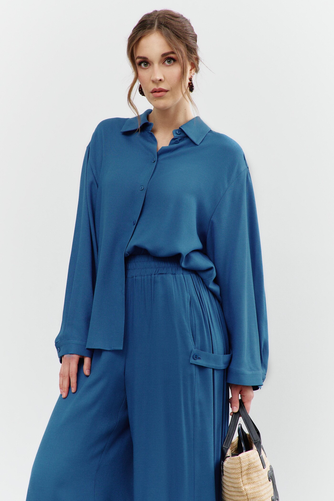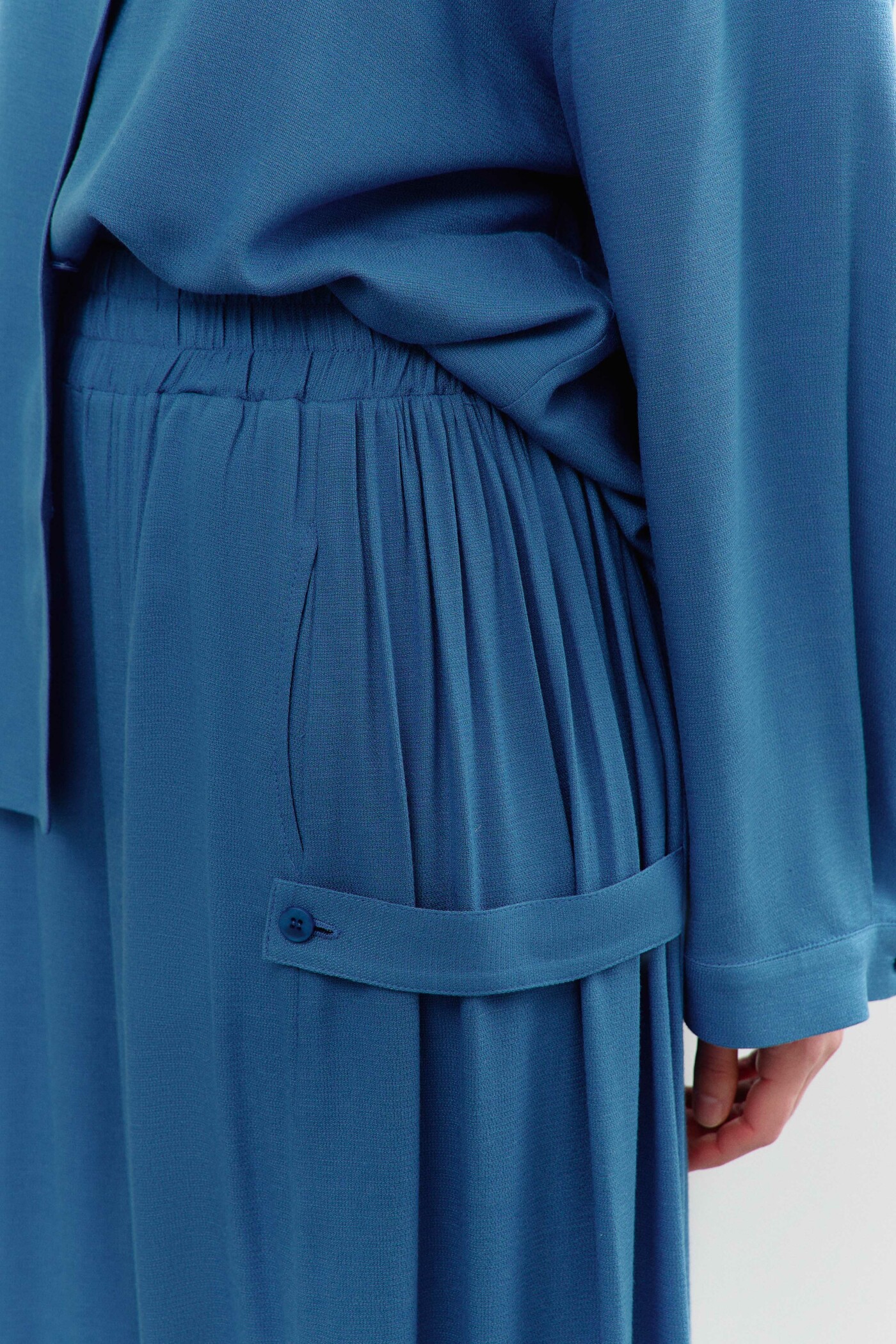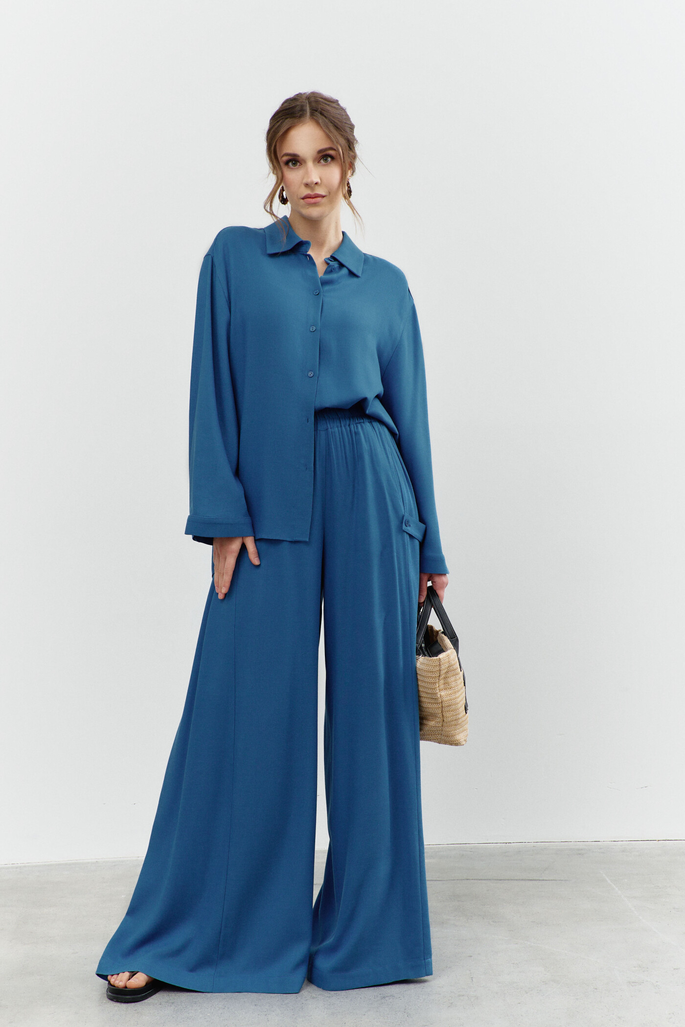 Широкие брюки-палаццо выполнены из хлопкового полотна. Модель полуприлегающего силуэта с комфортной высокой посадкой, на притачном поясе с эластичной тесьмой между слоями. Особым декоративным элементом являются широкие вставки (присборенными по верхнему срезу) по боковым швам и с притачными застёгивающимися патами на петлю и декоративную пуговицу. Для удобства в носке предусмотрены спереди карманы в швах. Длина изделия (с поясом) 114 см.
