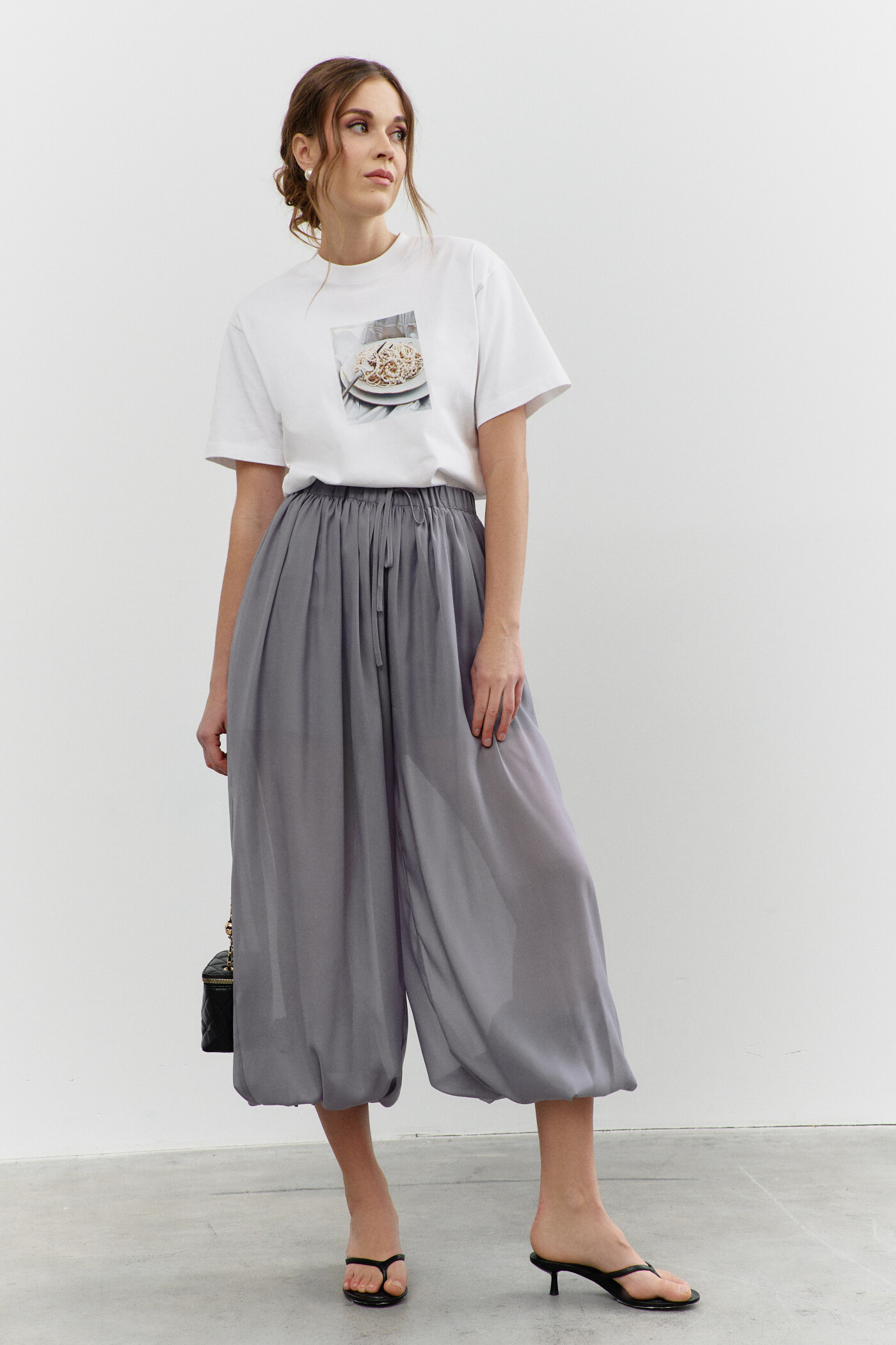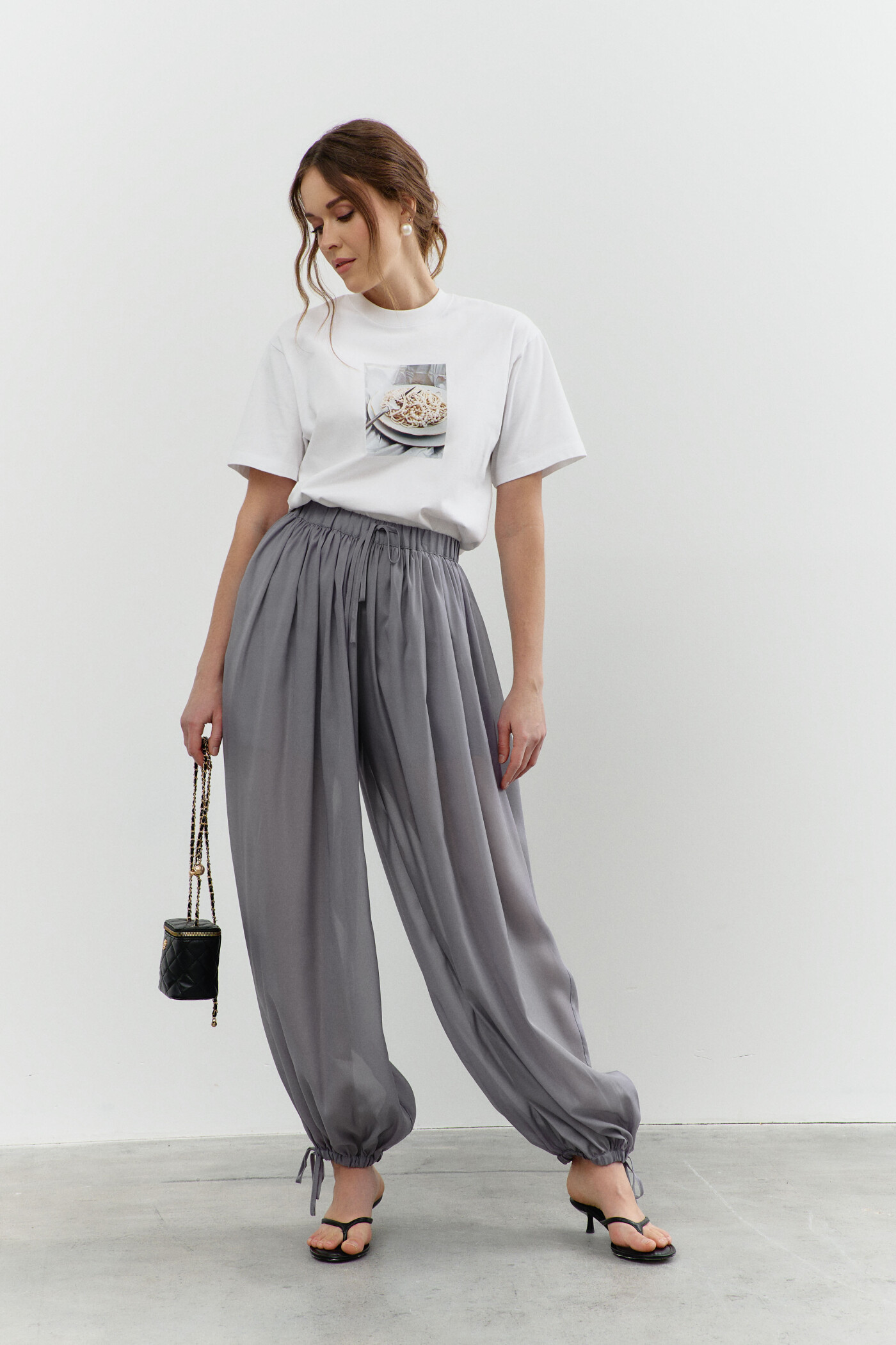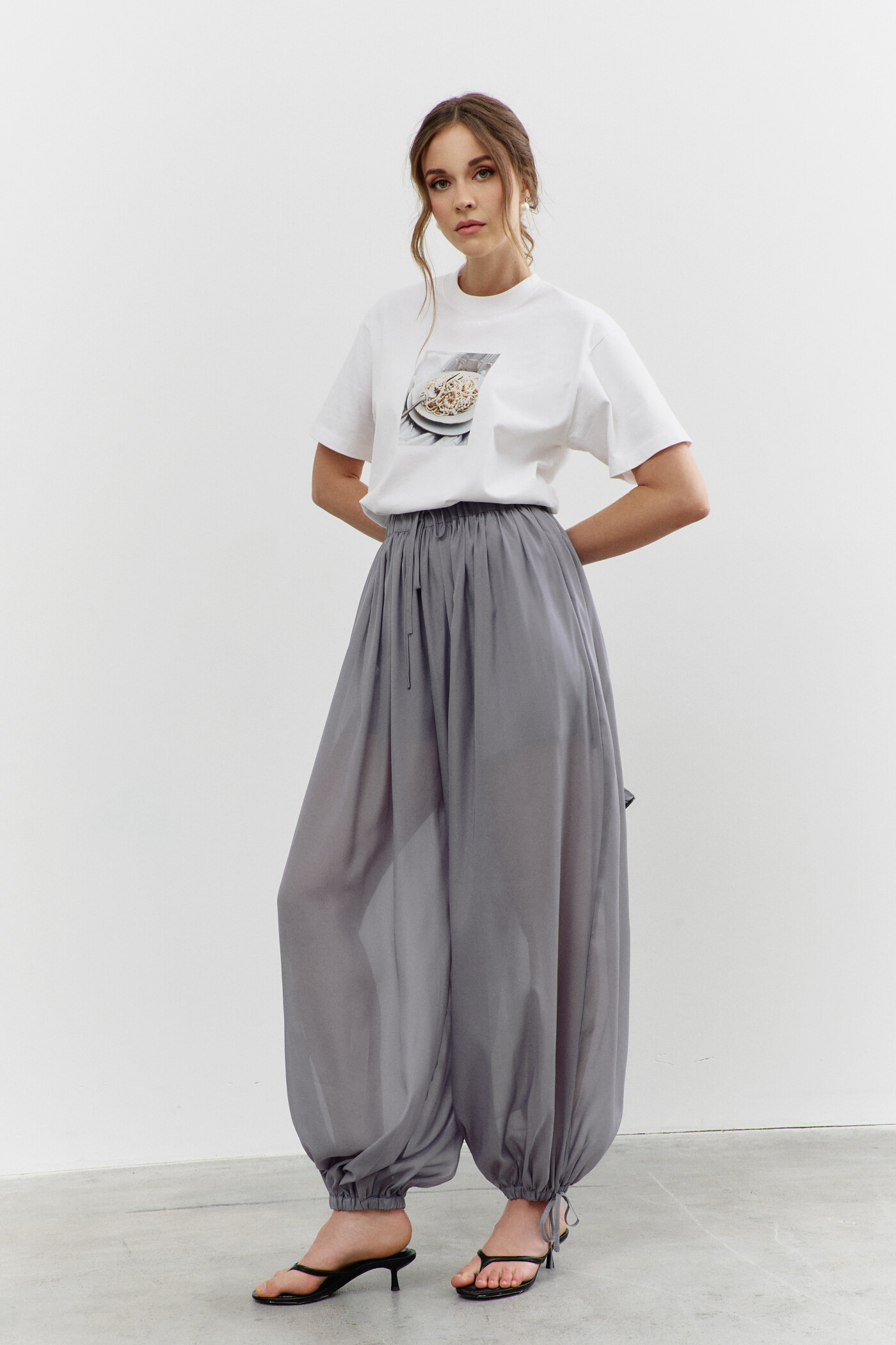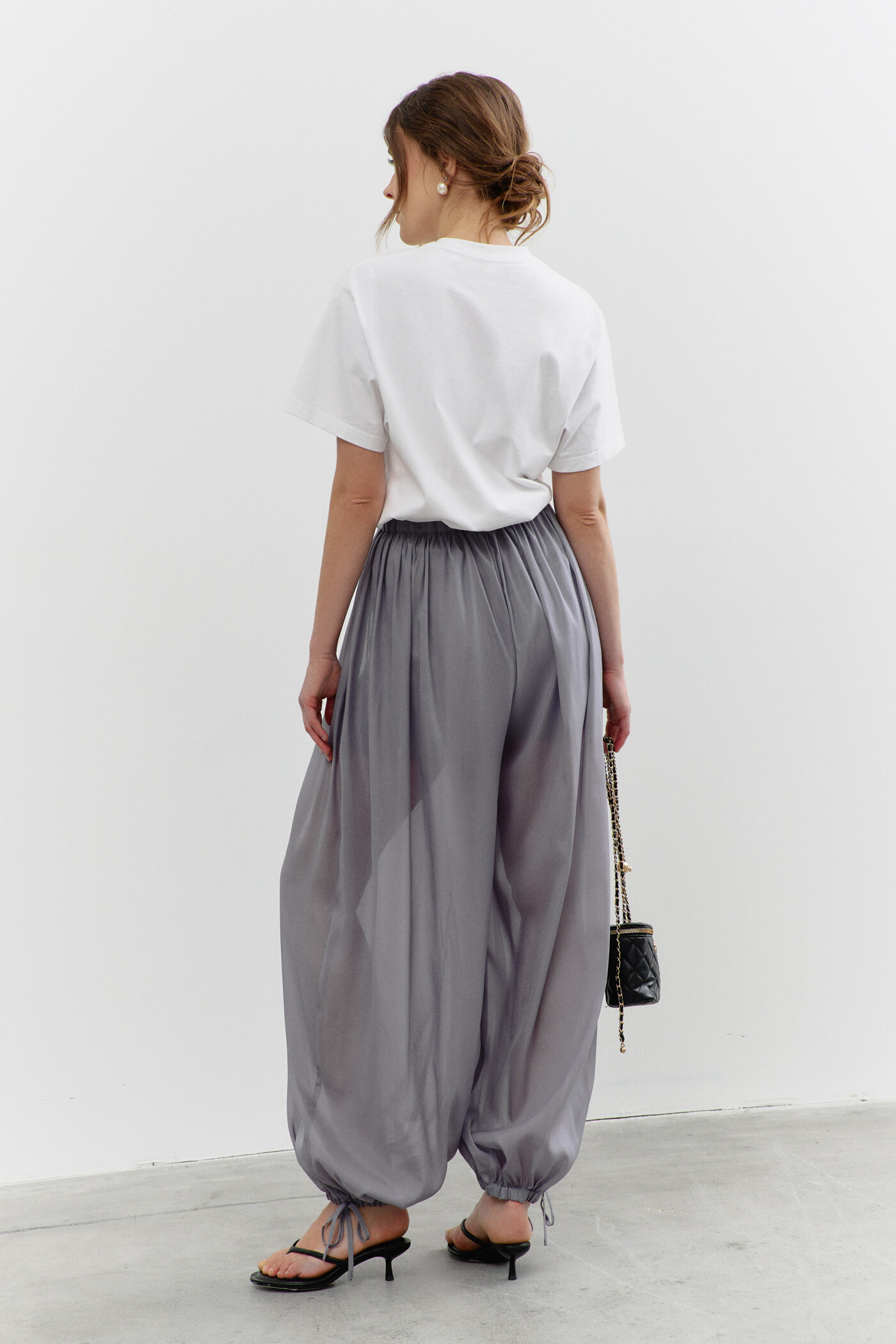 Свободные брюки в стиле city chic выполнены из полупрозрачного шифона с лёгким блеском на подкладке из вискозного полотна. Модель с комфортной средней посадкой на притачном поясе с декоративным завязывающимся узким пояском и эластичной тесьмой между слоями. Брюки со сборкой по линии притачивания пояса и манжетами, создающими эффект воздушности и легкости. Манжеты с декоративными завязками и эластичной тесьмой. Длина изделия (с поясом) 109 см.