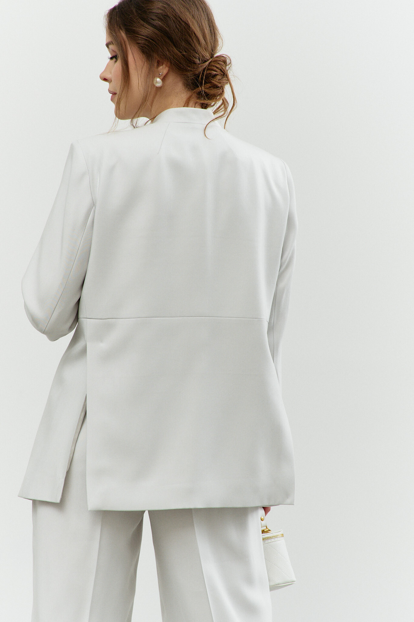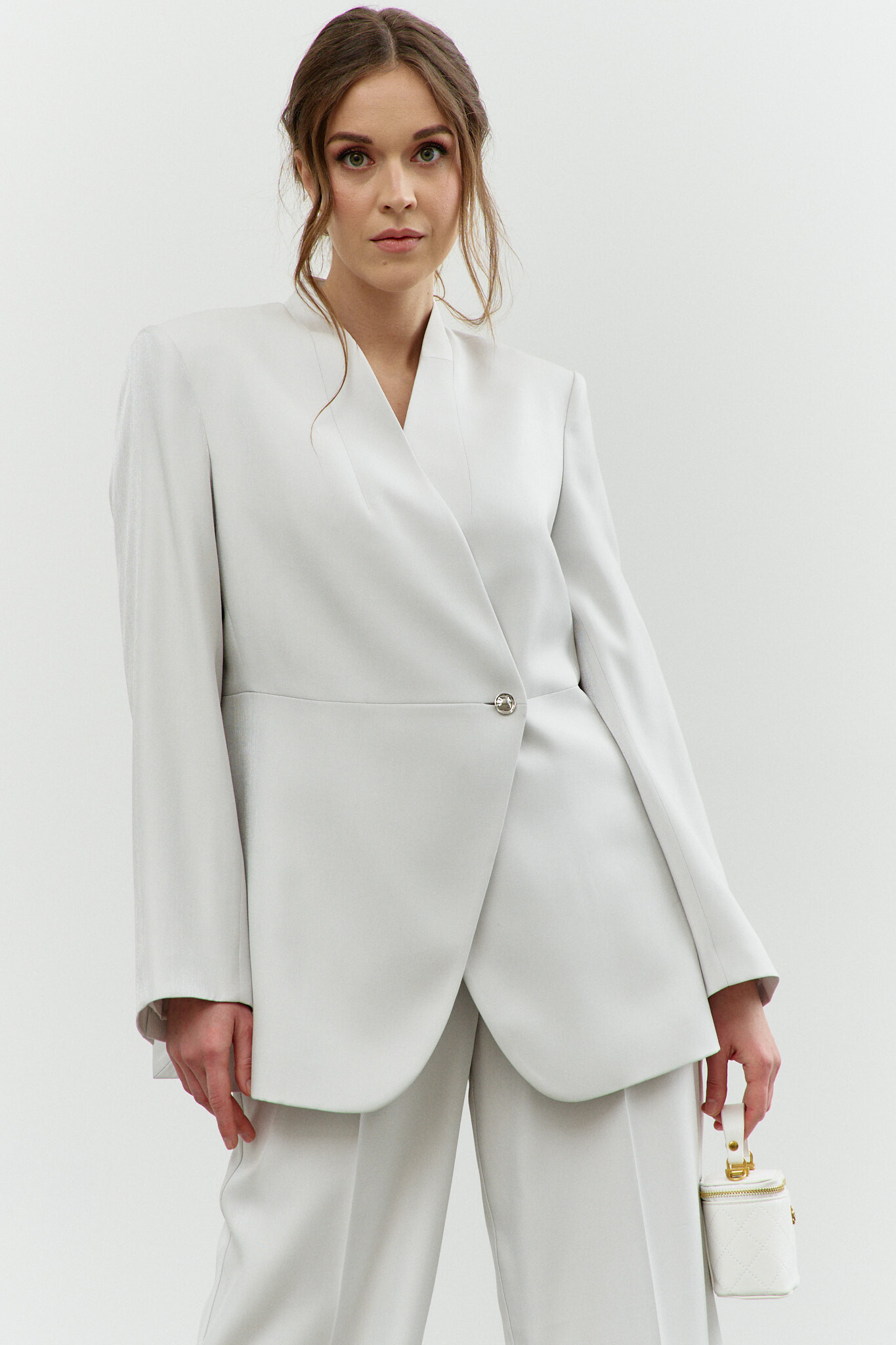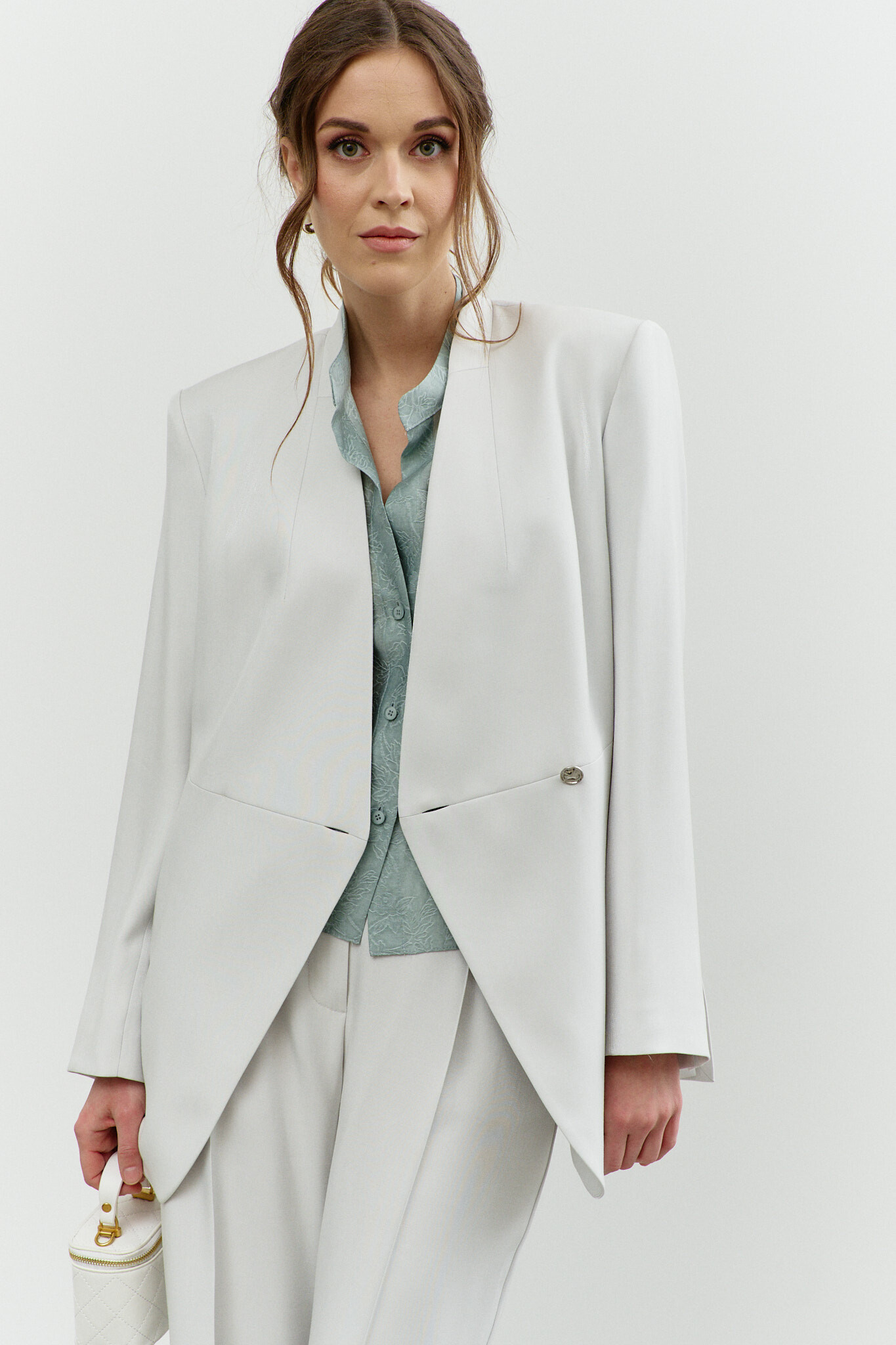 Элегантный двубортный жакет в стиле city chiс выполнен из костюмного полотна. Модель прямого силуэта, на подкладке. Горловина V-образной формы, с воротником-стойкой со стороны спинки. По переду и спинке подрез на линии талии. Спинка жакета с отлетными высокими шлицами от подреза до низа жакета. Рукава втачные, длинные со шлицей. Длина изделия 72 см, длина рукава 62 см.