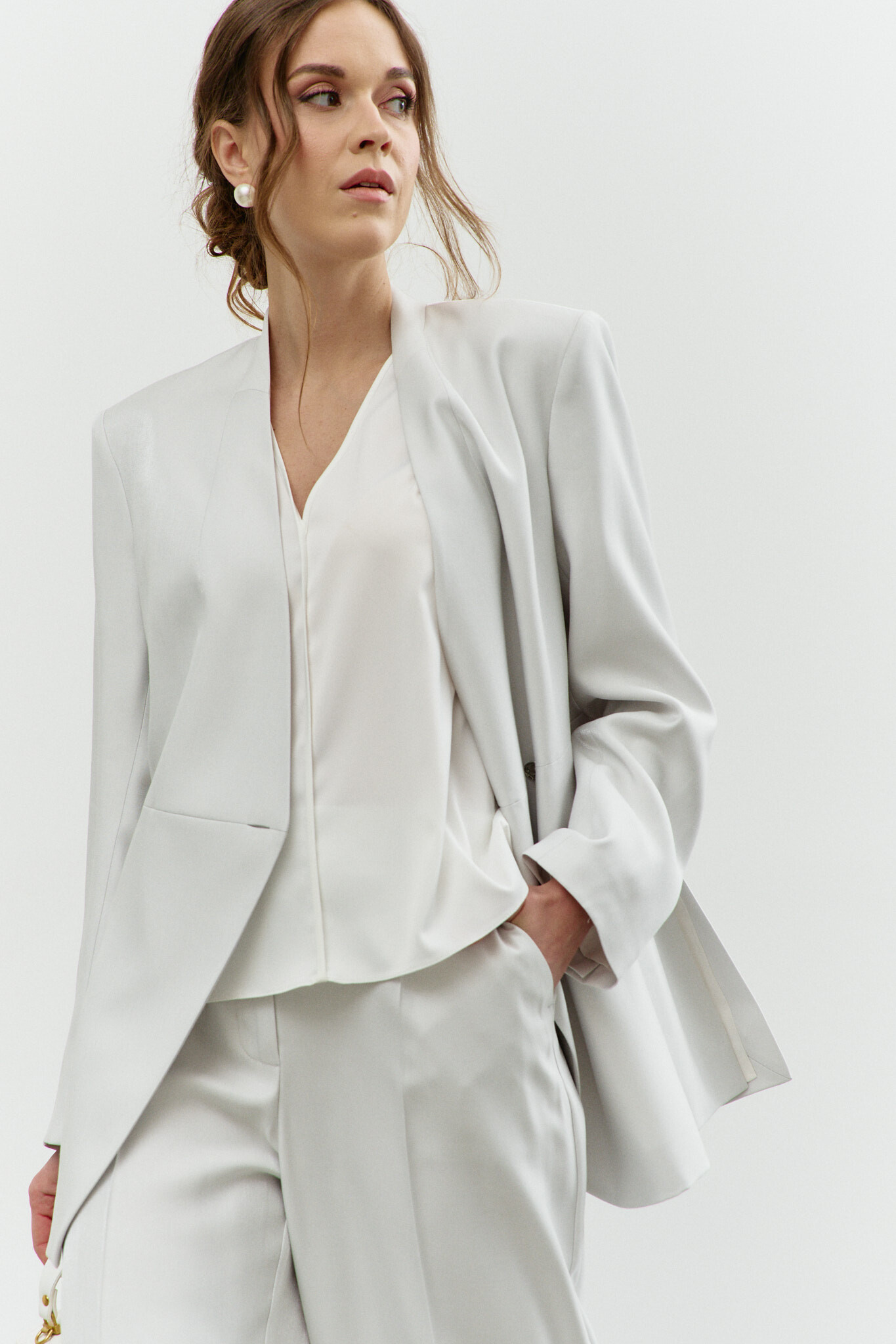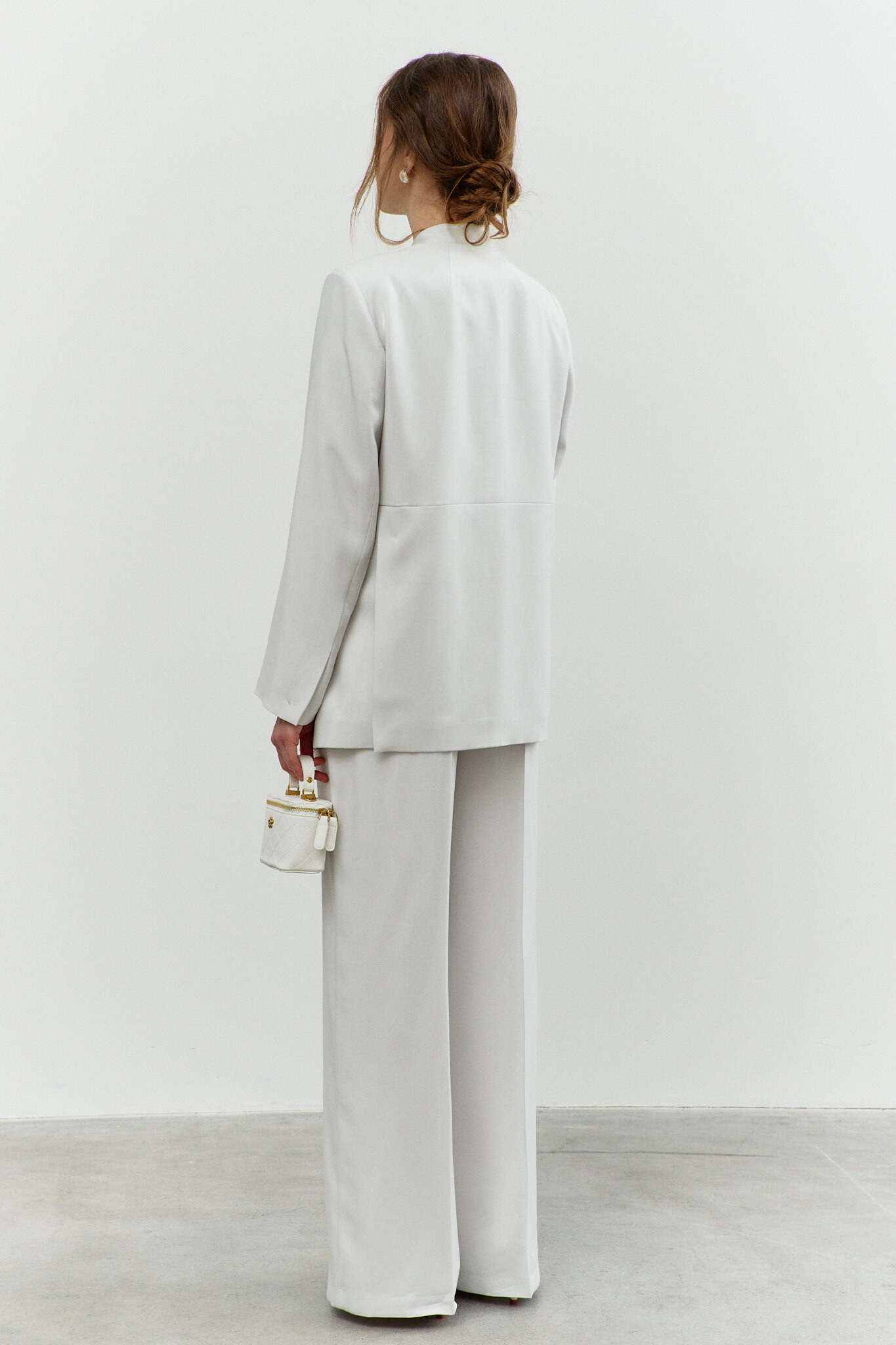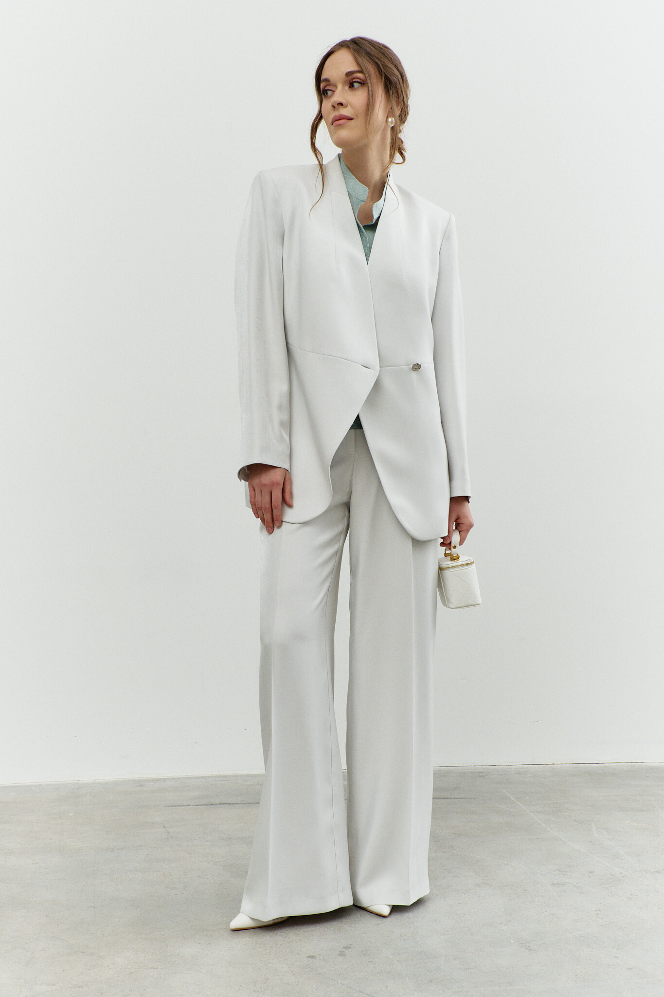 Элегантный двубортный жакет в стиле city chiс выполнен из костюмного полотна. Модель прямого силуэта, на подкладке. Горловина V-образной формы, с воротником-стойкой со стороны спинки. По переду и спинке подрез на линии талии. Спинка жакета с отлетными высокими шлицами от подреза до низа жакета. Рукава втачные, длинные со шлицей. Длина изделия 72 см, длина рукава 62 см.