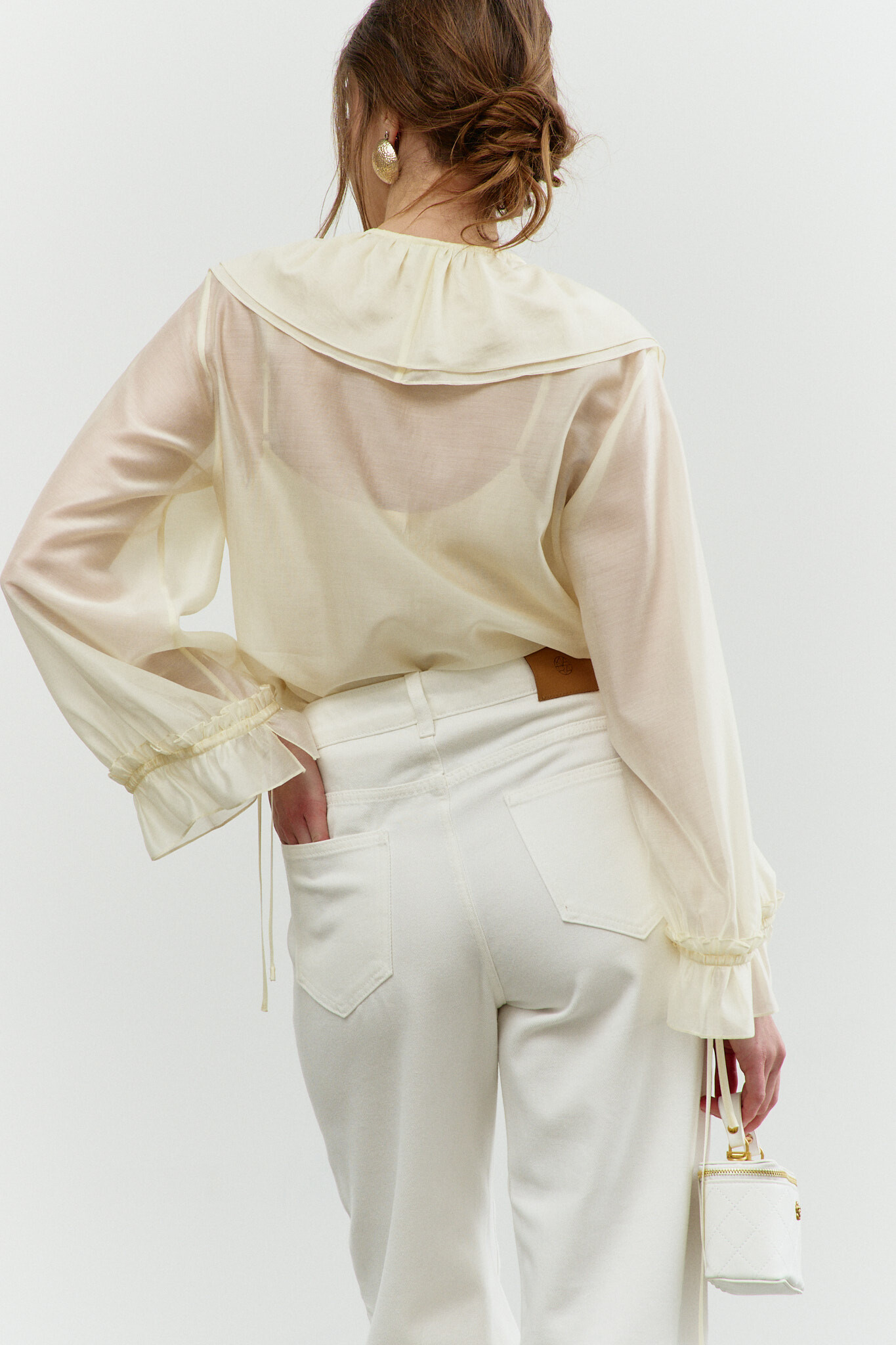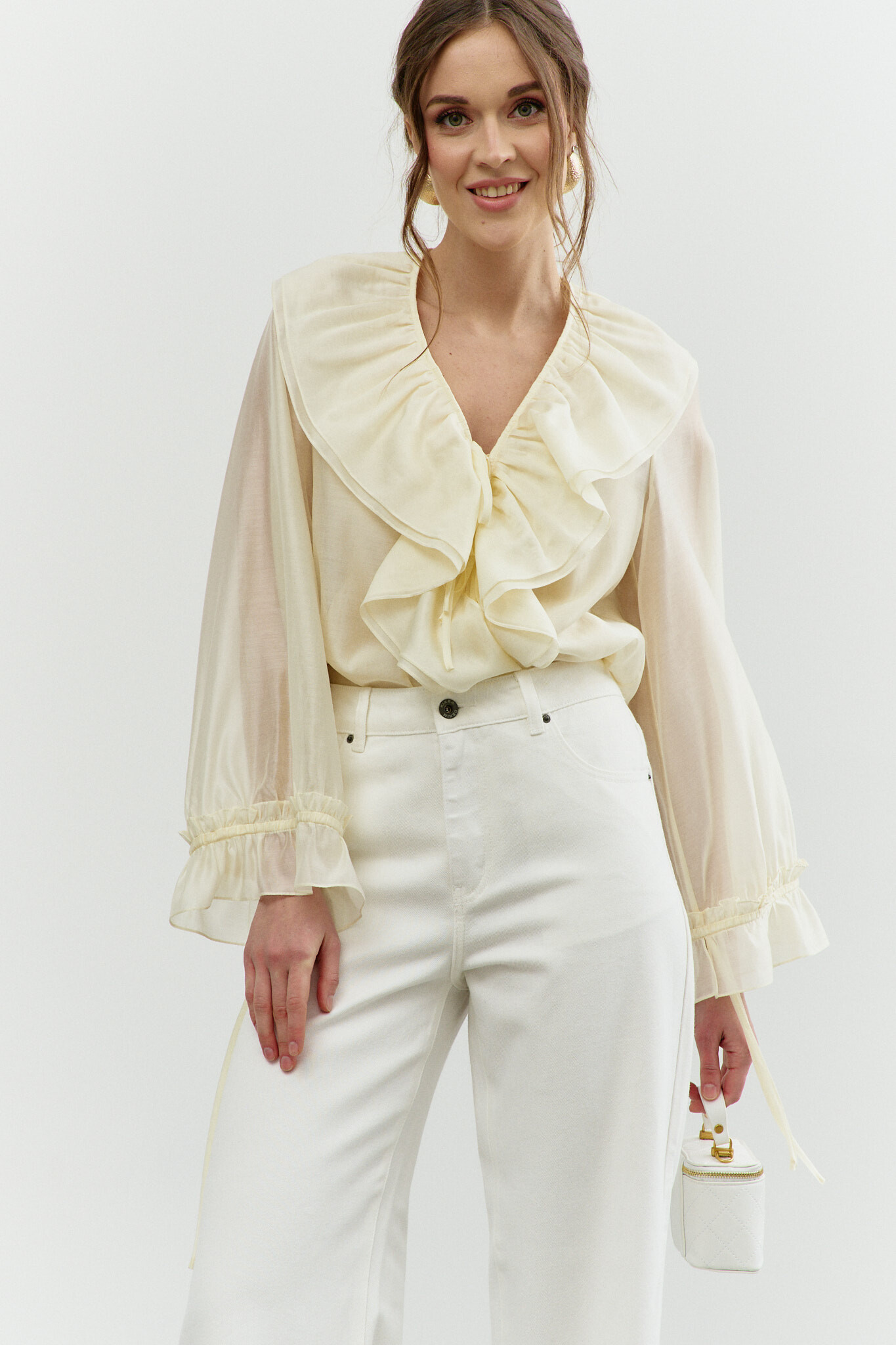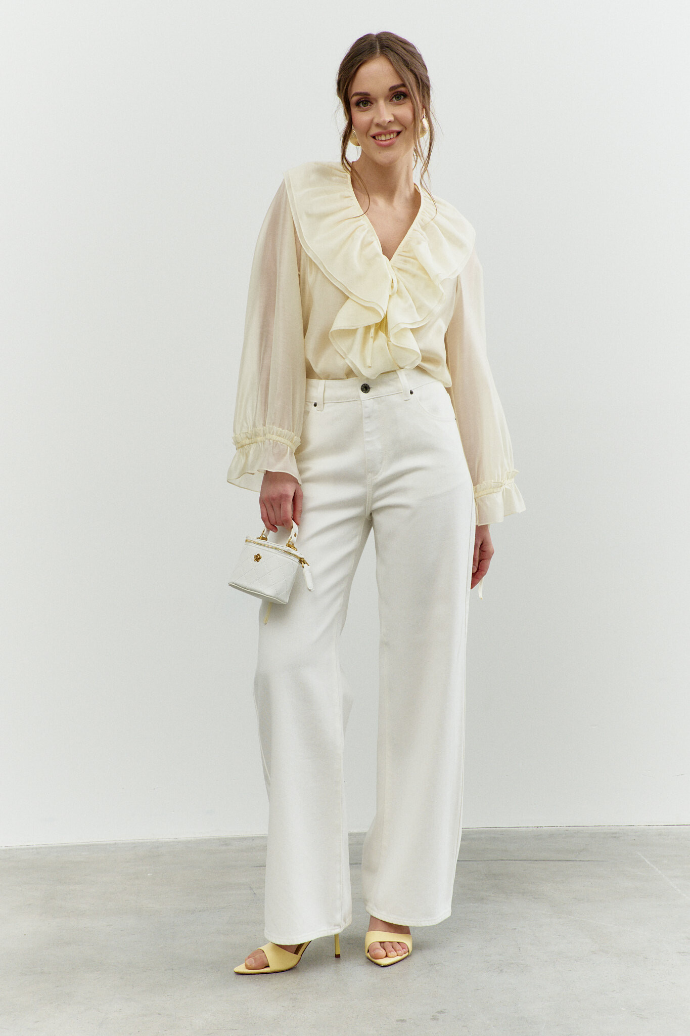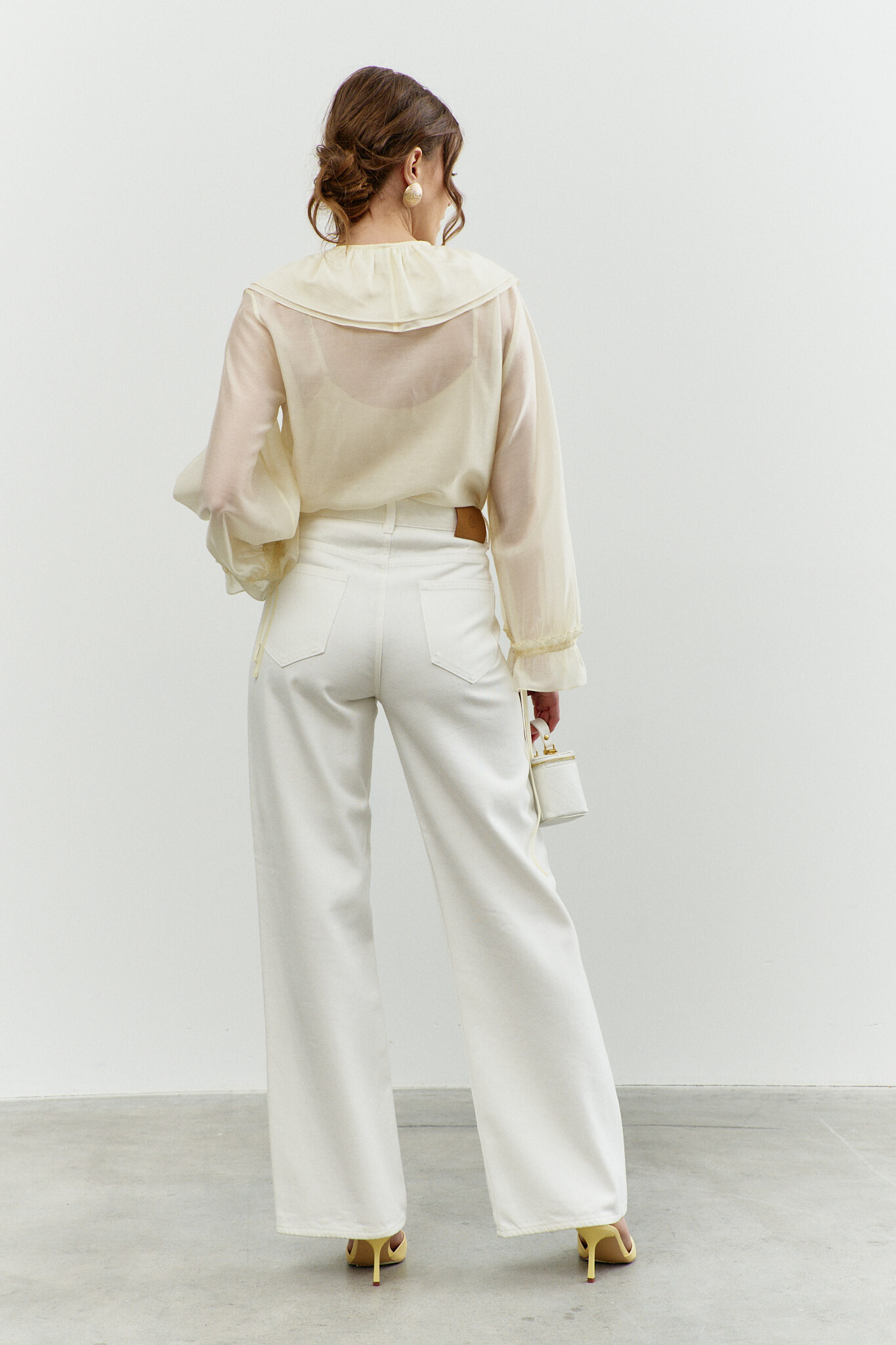 Брюки в стиле smart casual выполнены из хлопкового джинсового полотна. Модель с комфортной высокой посадкой на притачном поясе со шлёвками и застёгивающемся на декоративную пуговицу. Спереди предусмотрены карманы с отрезным бочком и застёжка на "молнию", сзади накладные карманы. Модель декорирована наличием отделочных строчек. Длина изделия по боковому шву (с поясом) 108 см.