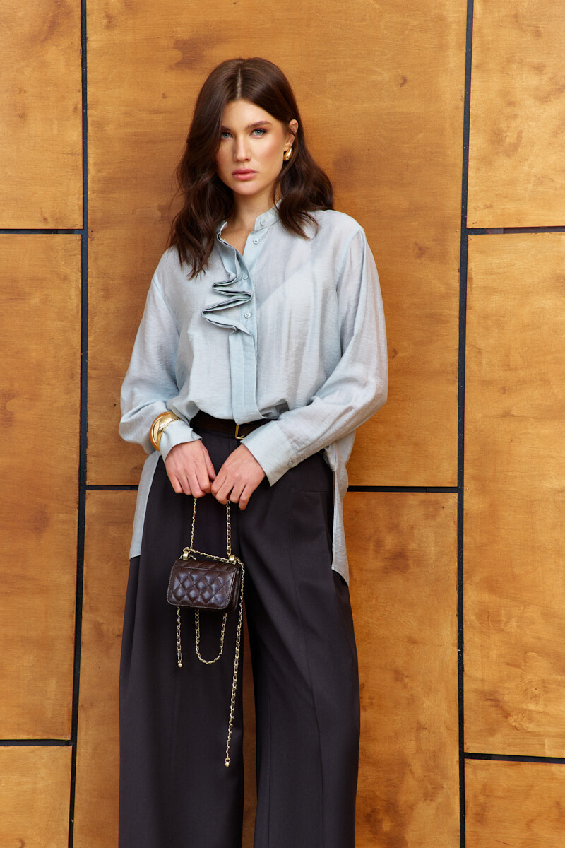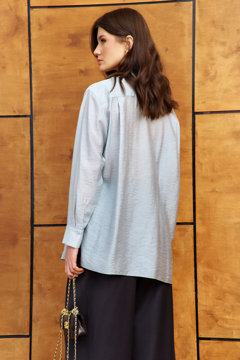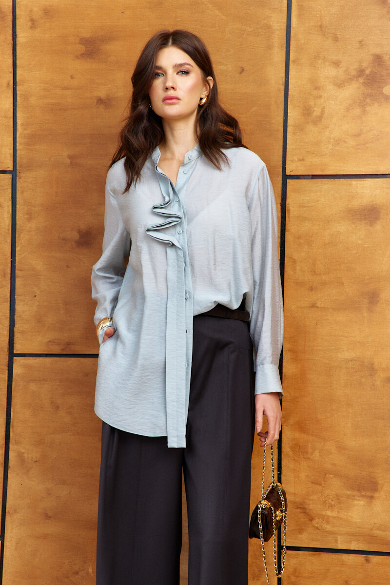 Блузка в стиле city chic выполнена из платьево-блузочного полотна. Модель прямого силуэта с разрезами по боковым швам. Горловина – стойка. По центру переда цельнокроеная планка на петли и декоративные пуговицы. По спинке две складки, направленные от кокетки. В качестве декора на правую часть переда настрочен и зафиксирован отлетной декоративный элемент в виде планки. Рукава втачные длинные со складками вдоль застёгивающейся манжеты. Модель комплектуется топом из вискозного полотна на регулируемых по длине бретелях. Длина изделия 76 см, длина рукава 58 см.