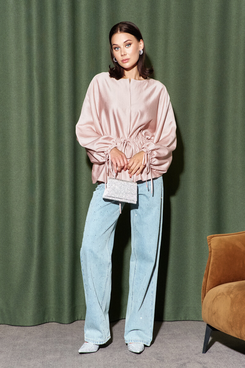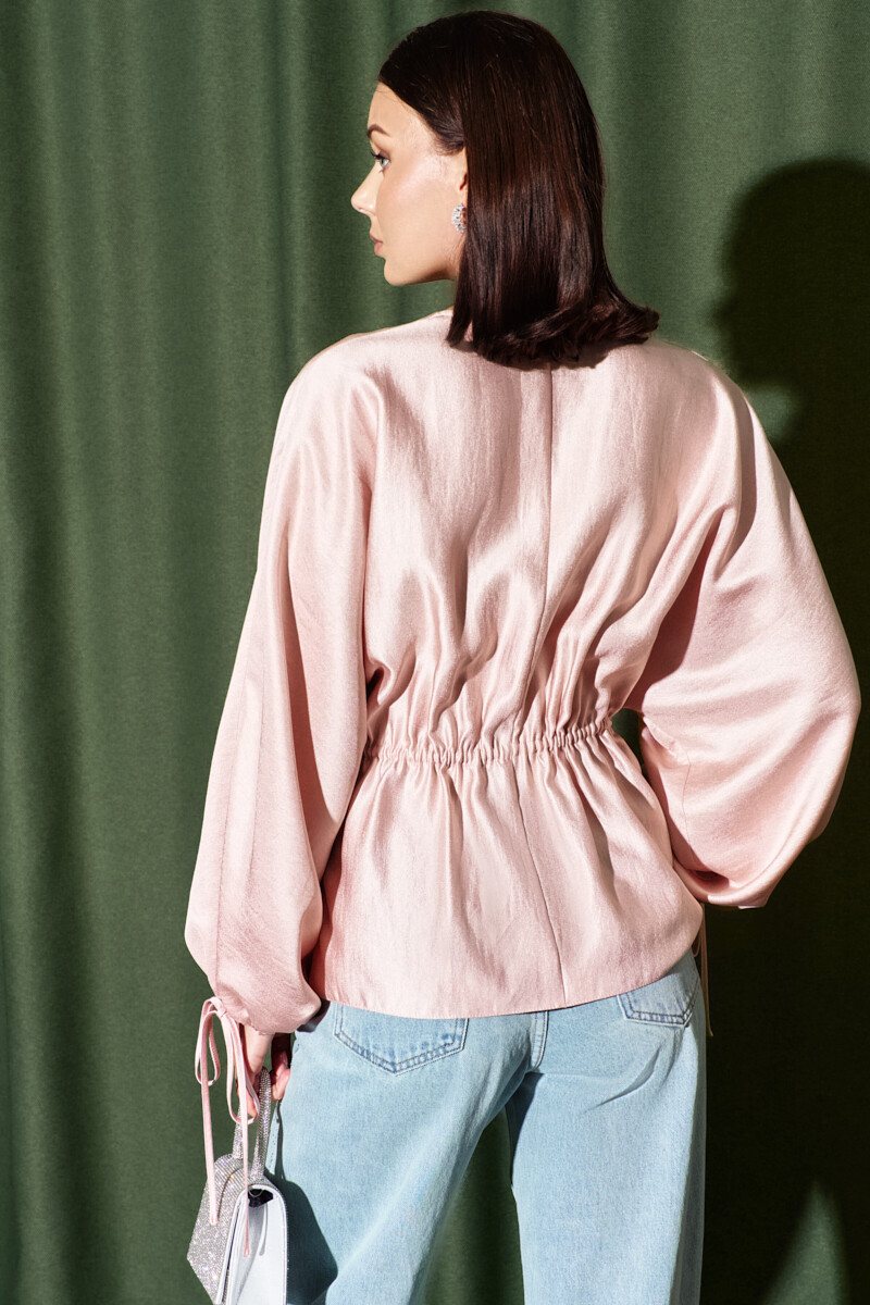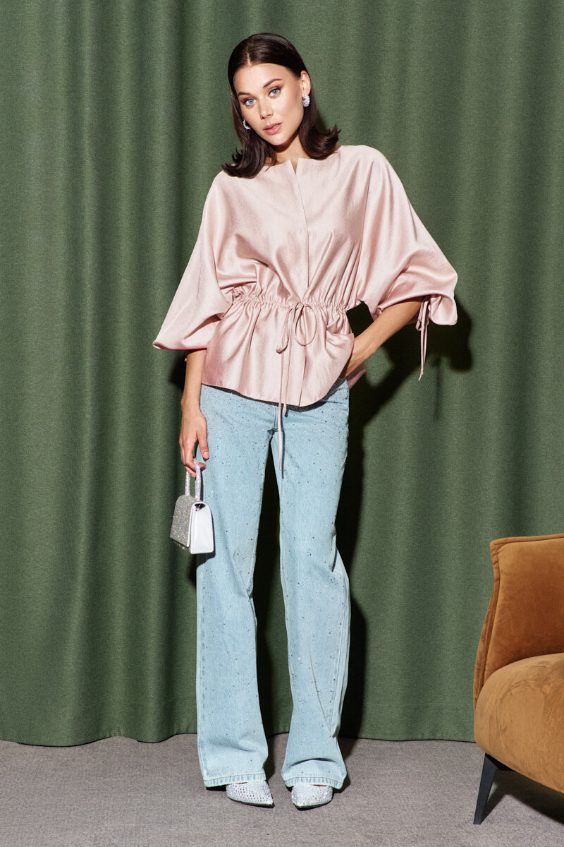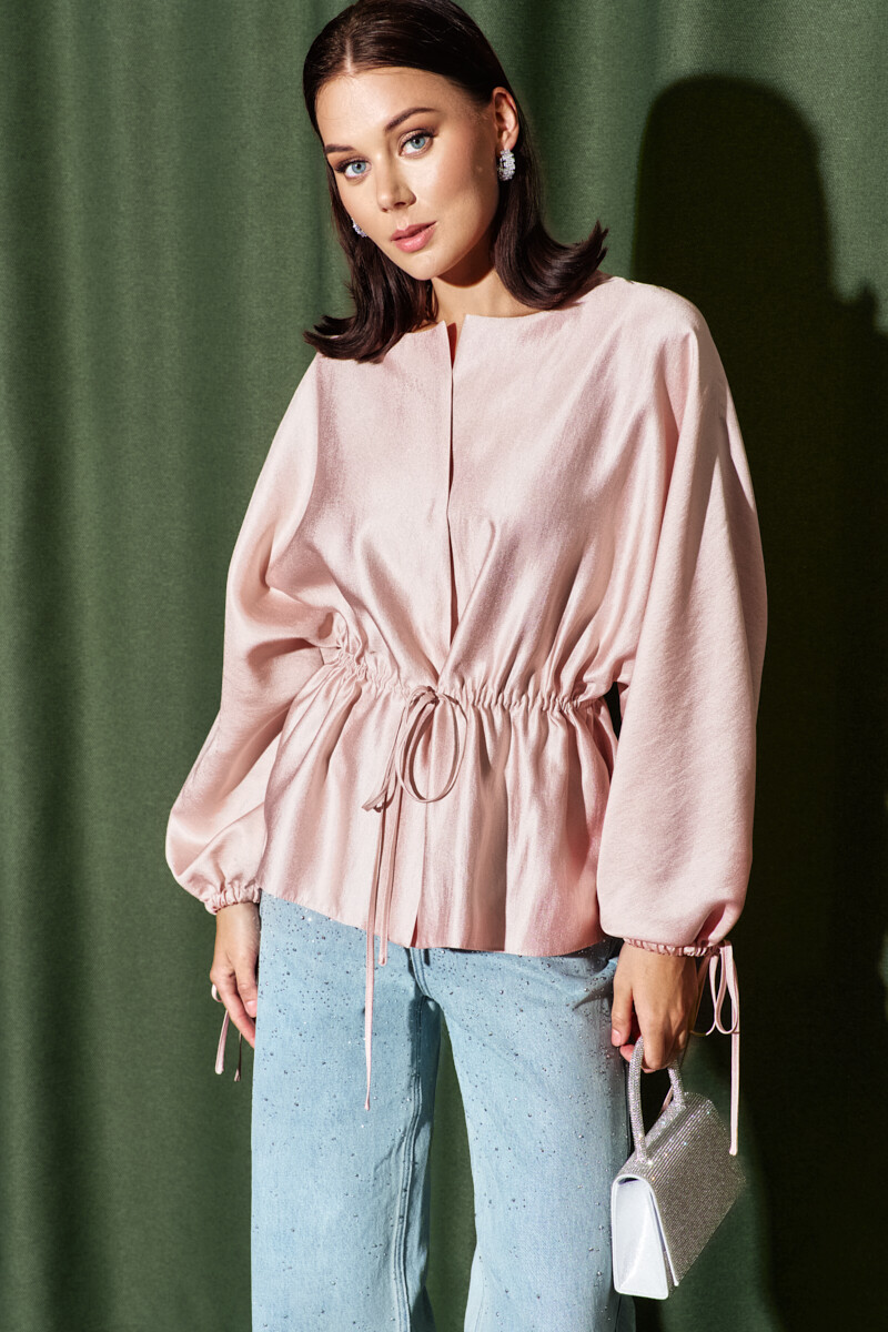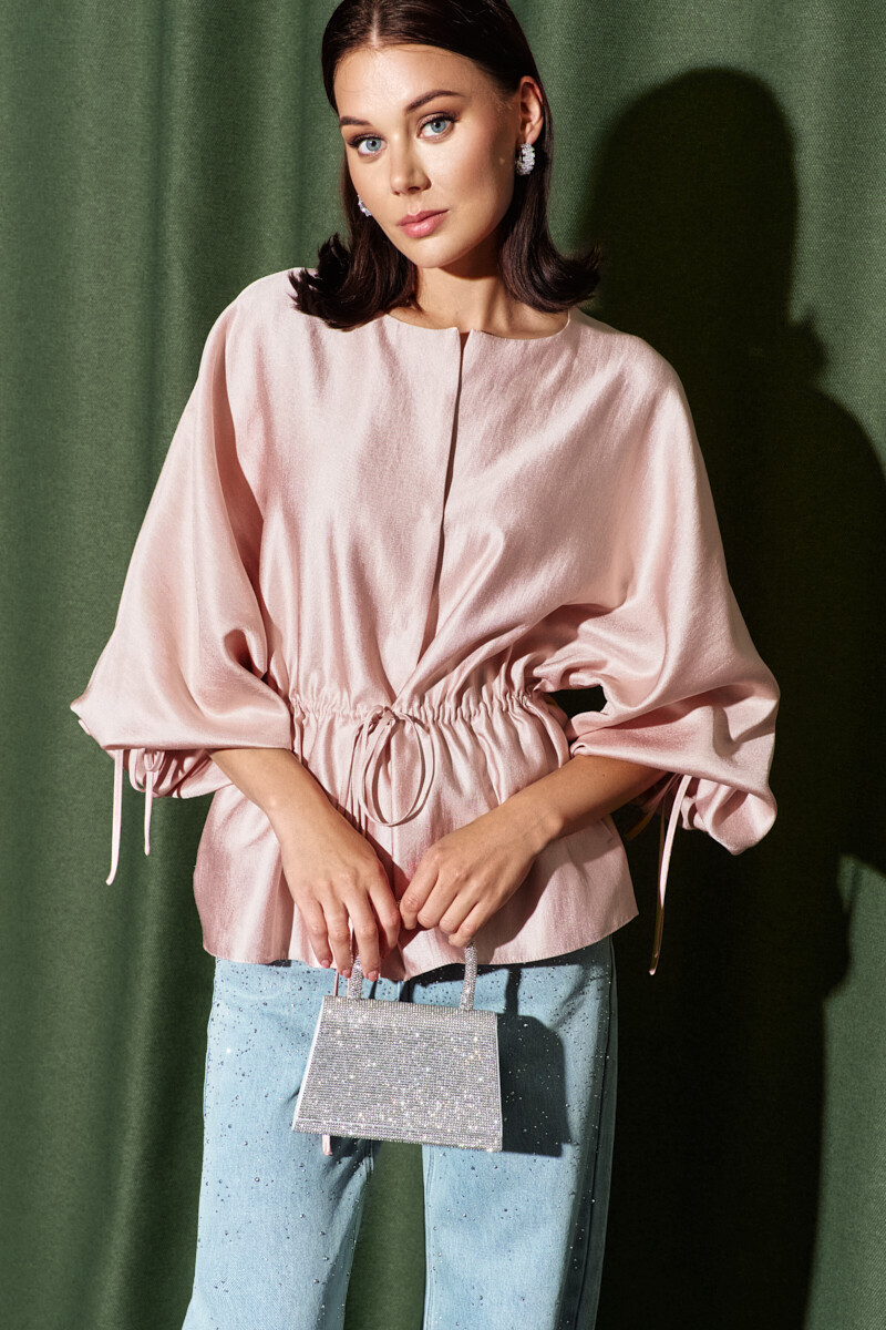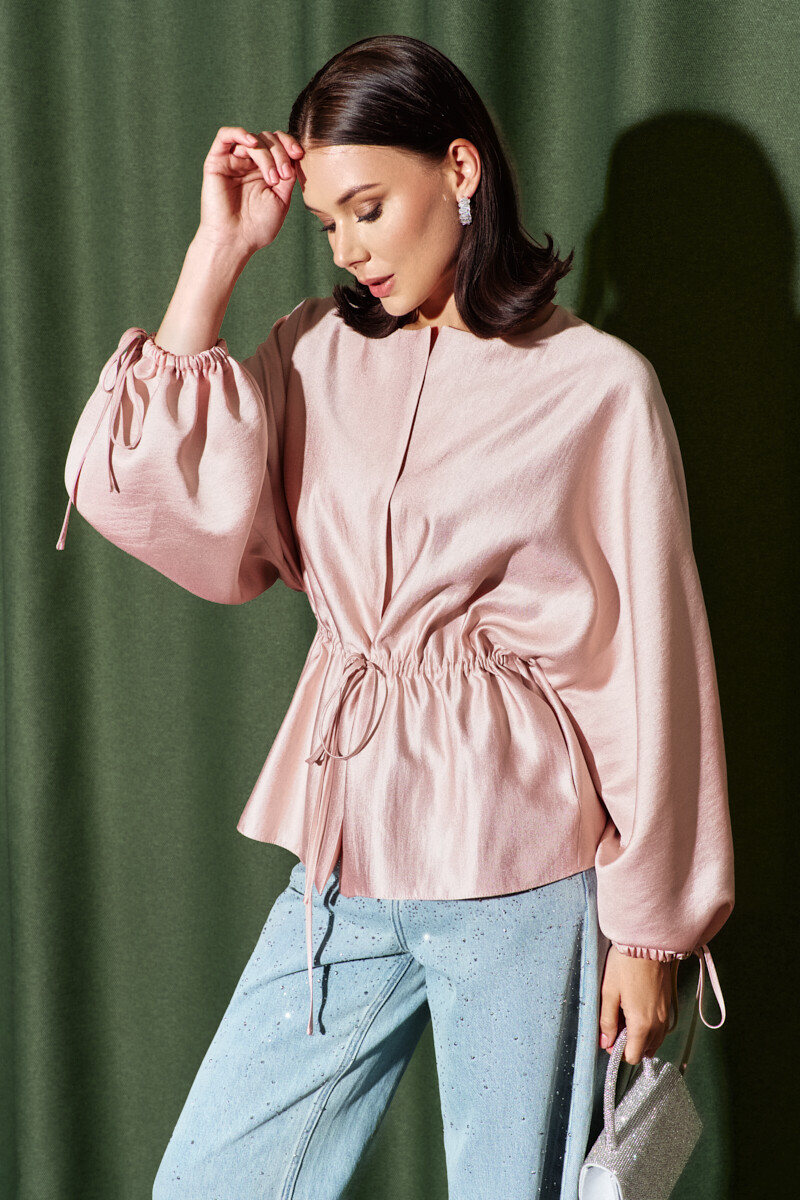 Блузка в стиле city chic выполнена из плательного полотна с благородным блеском. Модель прямого силуэта с кулисой на линии талии и с завязывающимся узким пояском из основного полотна. Горловина круглая. Спереди расположена застежка на пришивные кнопки от талии до линии чуть выше груди. Спинка выполнена со средним швом. Для удобства в носке предусмотрены карманы в боковых швах. Рукава цельнокроеные, объемные, с кулисой по низу и узким пояском. Длина изделия 64 см, длина рукава (от горловины) 70 см.