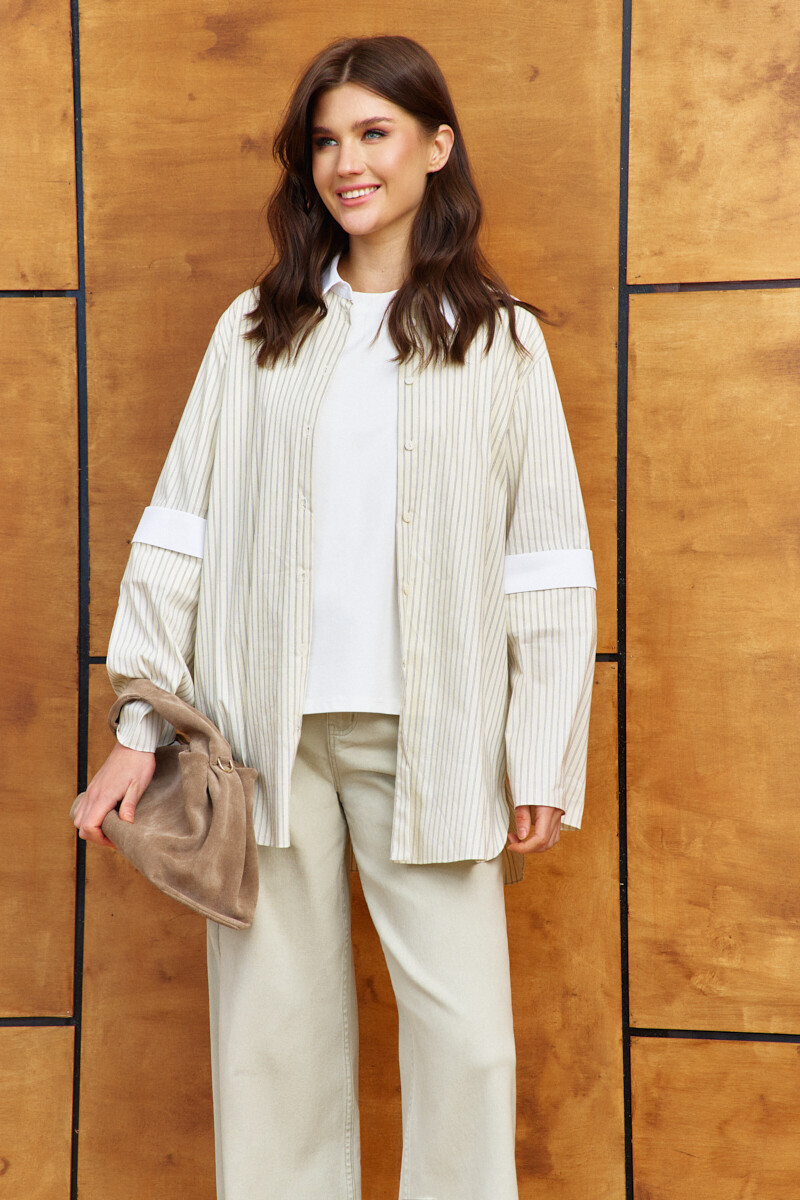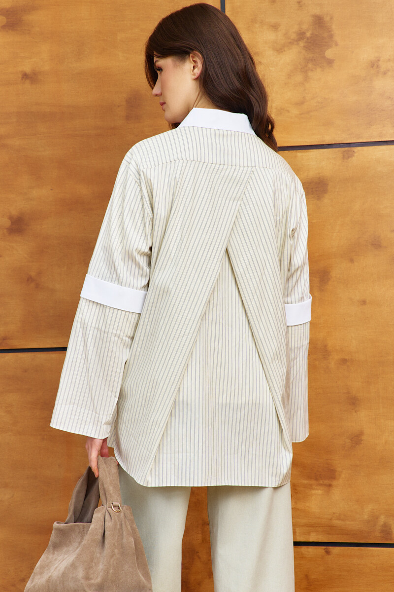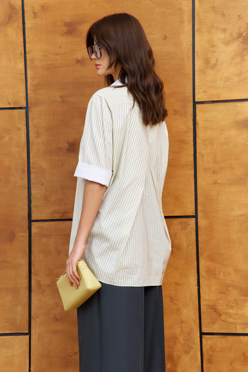 Блузка-рубашка выполнена из хлопкового полотна в полоску. Модель свободного силуэта со спущенной линией плеча. Воротник отложной на стойке из отделочного контрастного полотна. Спереди предусмотрена застежка на декоративные пуговицы. По спинке - глубокие модельные складки, направленные от кокетки. Особым декоративным элементом является рукава с пристегивающейся нижней частью на петли и пуговицы, по середине - на манжету из отделочного полотна, что дает возможность носить изделие с длинным рукавом и коротким. Длина изделия - 78 см. длина рукава - 58 см.