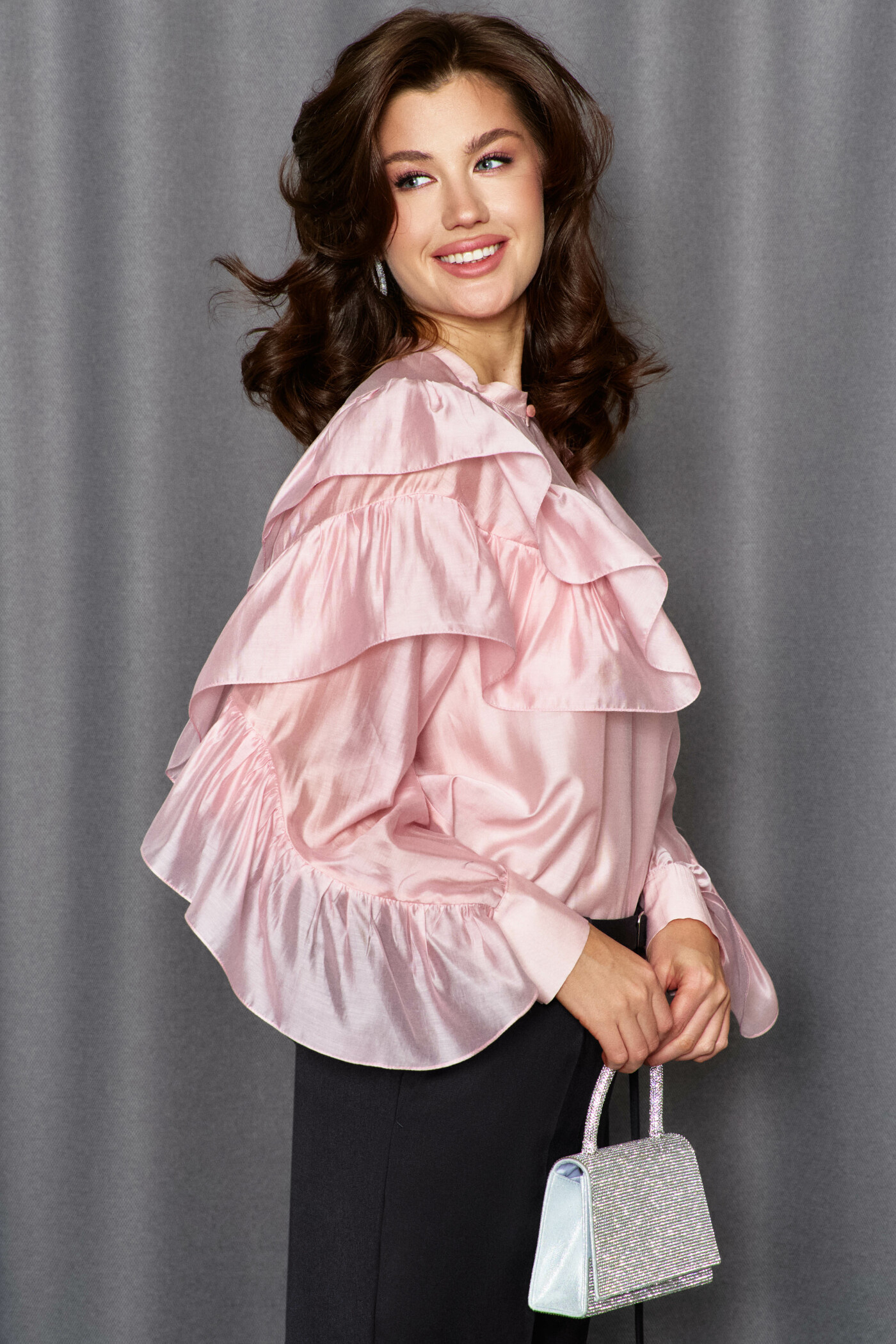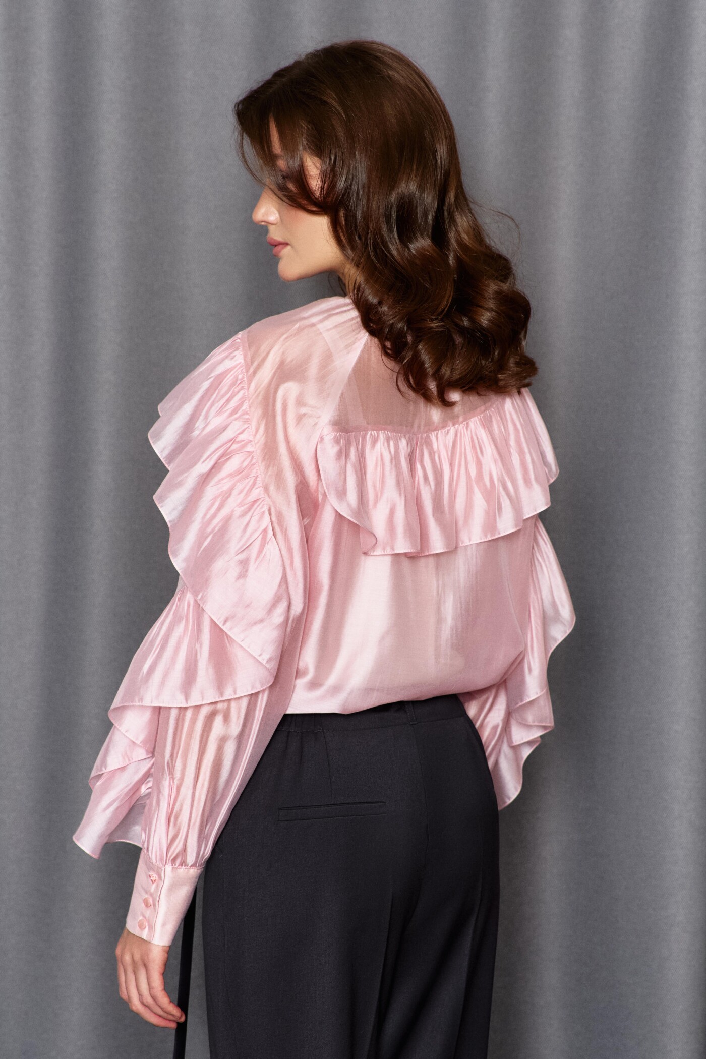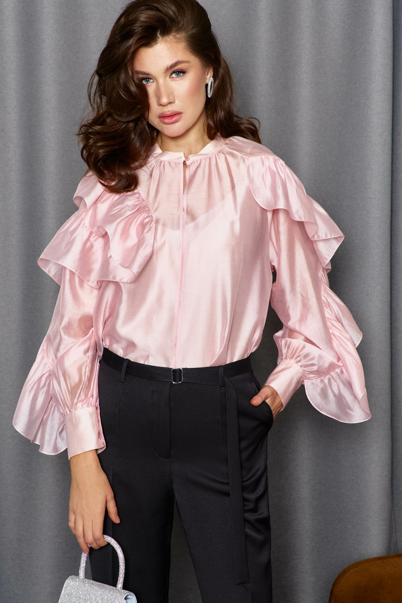 Блузка в стиле city chic выполнена из платьево-блузочного полотна. Модель расширенного силуэта. Горловина – стойка. Перед блузки со средним швом, в котором от горловины выполнен вертикальный разрез. На левом рукаве блузки выполнен фигурный рельеф от плеча до низа, в который вставлена присборенная рюша. Правая часть переда и правый рукав блузки также с фигурными рельефами, в которые вставляется присборенная рюша, переходящая в подрез на спинке блузки. Рукава — длинные реглан со сборкой вдоль застегивающейся манжеты. Модель комплектуется топом из вискозного полотна на регулируемых по длине бретелях. Длина изделия 63 см, длина рукава(от горловины) 77 см.