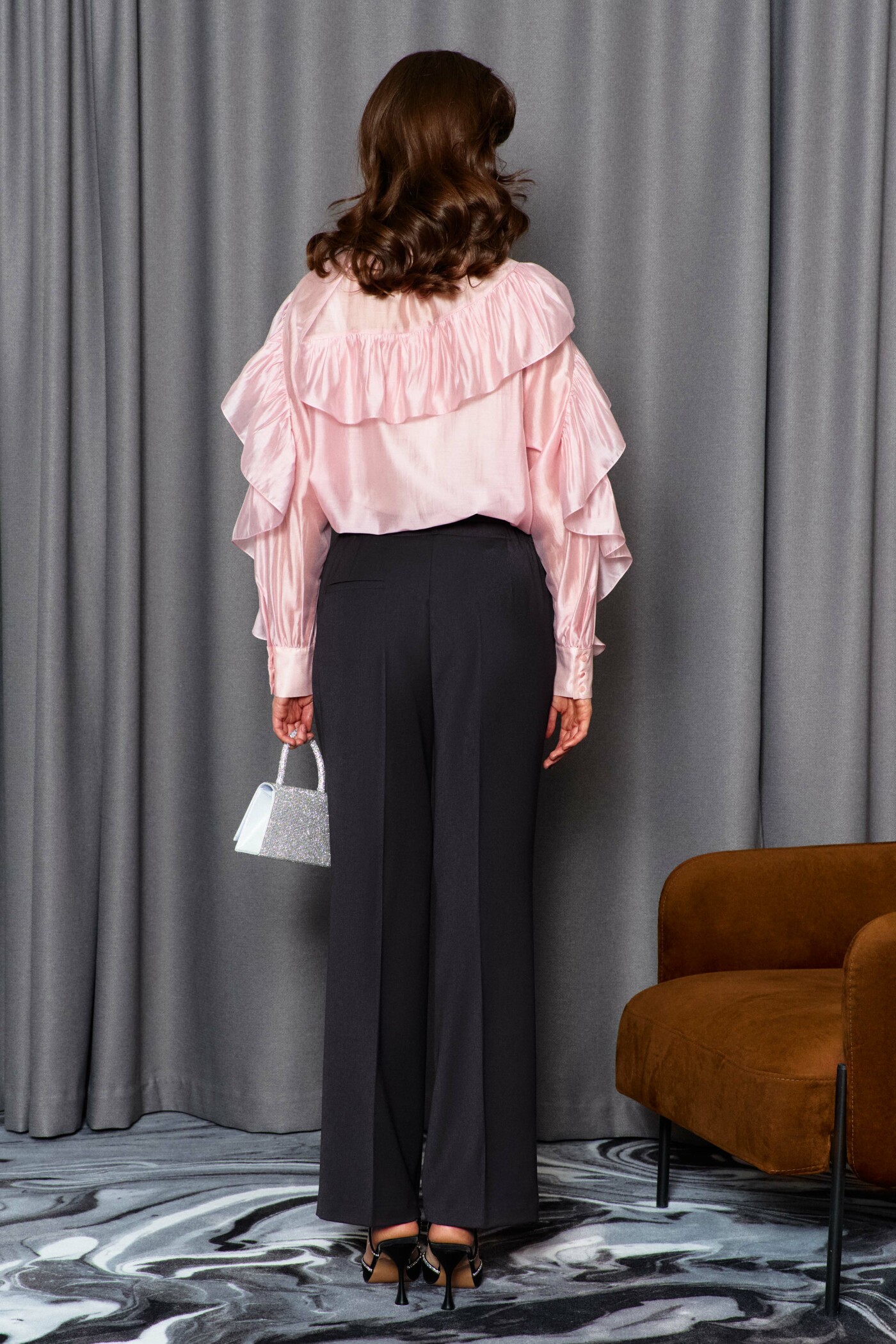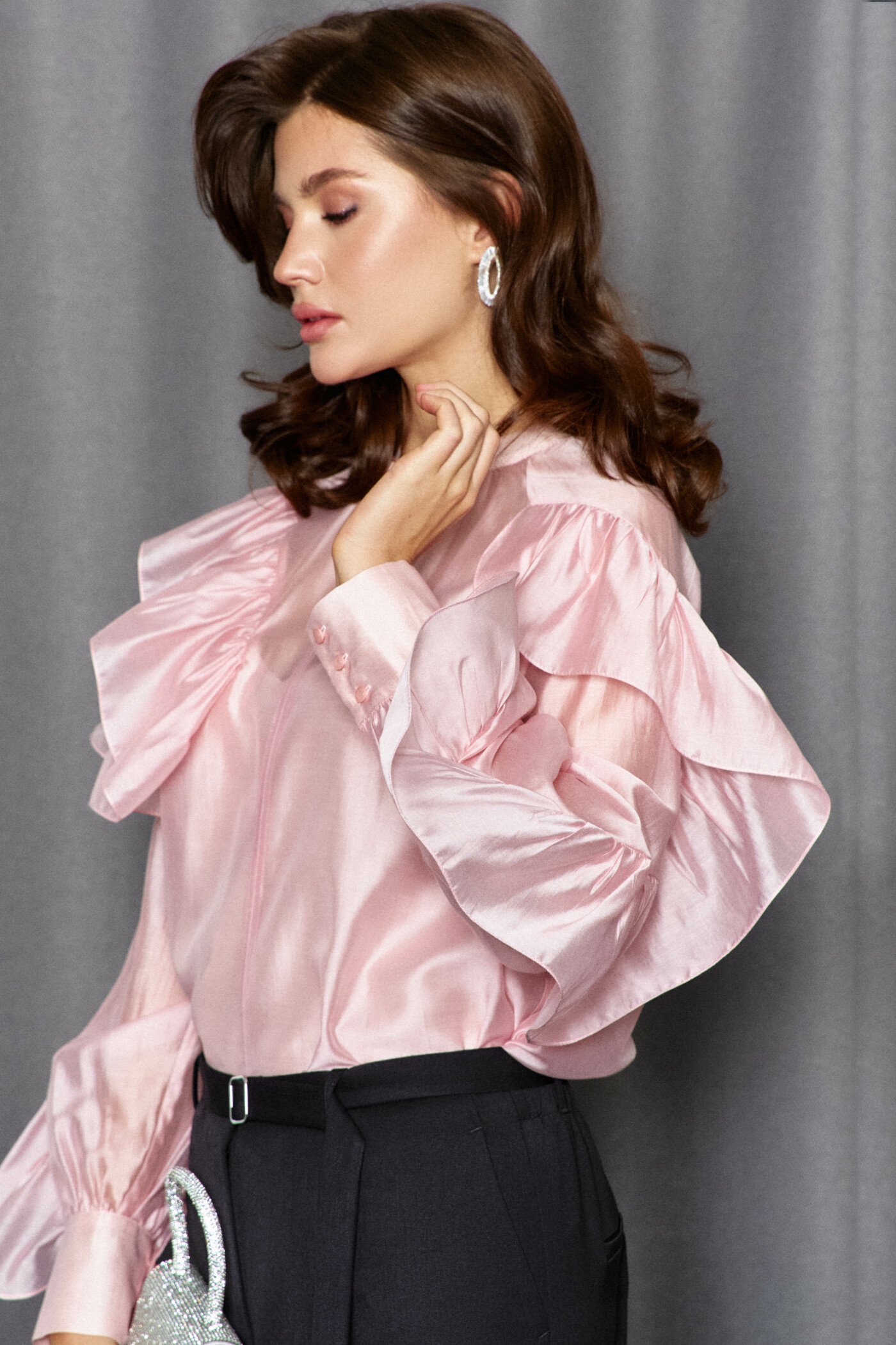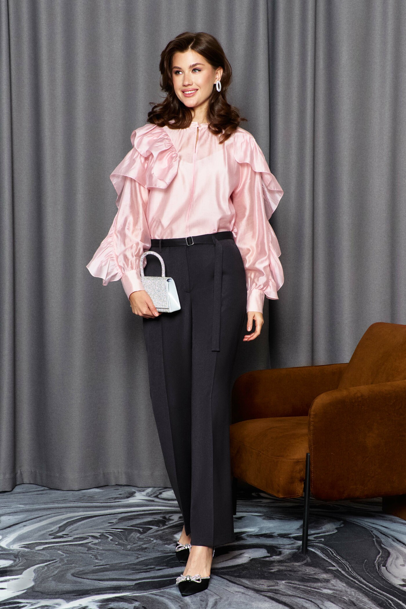 Блузка в стиле city chic выполнена из платьево-блузочного полотна. Модель расширенного силуэта. Горловина – стойка. Перед блузки со средним швом, в котором от горловины выполнен вертикальный разрез. На левом рукаве блузки выполнен фигурный рельеф от плеча до низа, в который вставлена присборенная рюша. Правая часть переда и правый рукав блузки также с фигурными рельефами, в которые вставляется присборенная рюша, переходящая в подрез на спинке блузки. Рукава — длинные реглан со сборкой вдоль застегивающейся манжеты. Модель комплектуется топом из вискозного полотна на регулируемых по длине бретелях. Длина изделия 63 см, длина рукава(от горловины) 77 см.