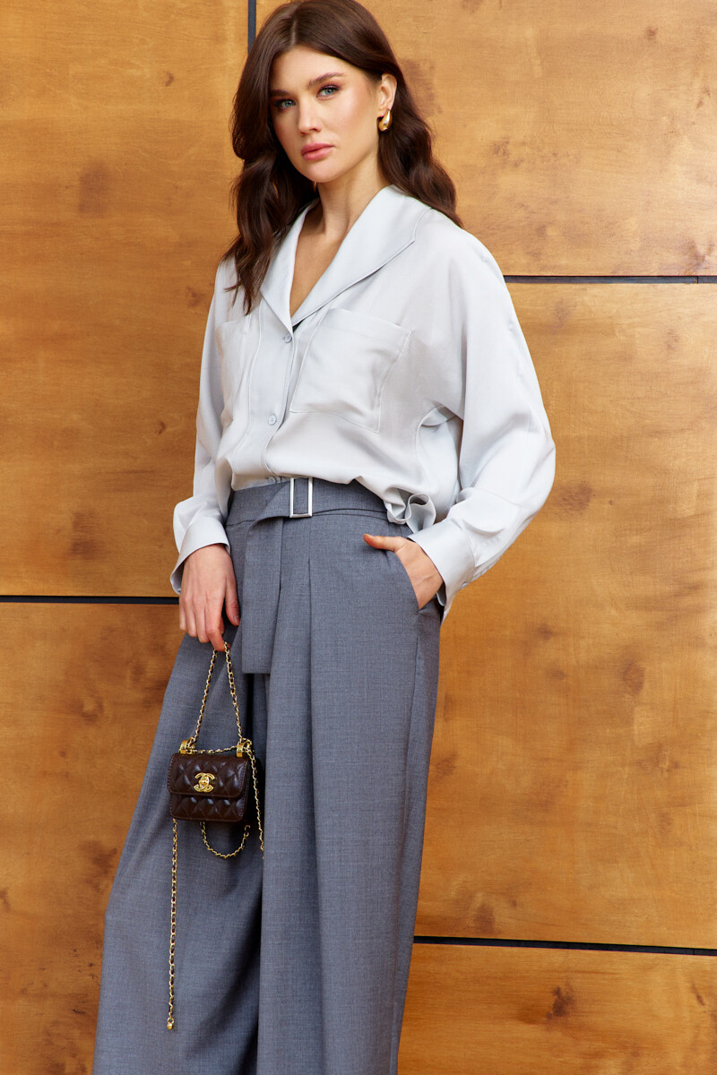 Элегантная блузка в стиле city chic выполнена из платьево-блузочного полотна. Модель прямого силуэта. Воротник отложной фантазийной формы. Спереди предусмотрена застёжка на петли и декоративные пуговицы, и накладные карманы. По спинке оформлена декоративная планка с разрезом по низу. Рукава цельнокроеные длинные со складками вдоль застёгивающейся манжеты. Длина изделия 66 см, длина рукава (от горловины) 70 см.