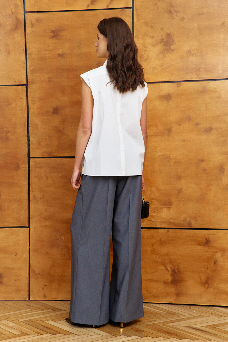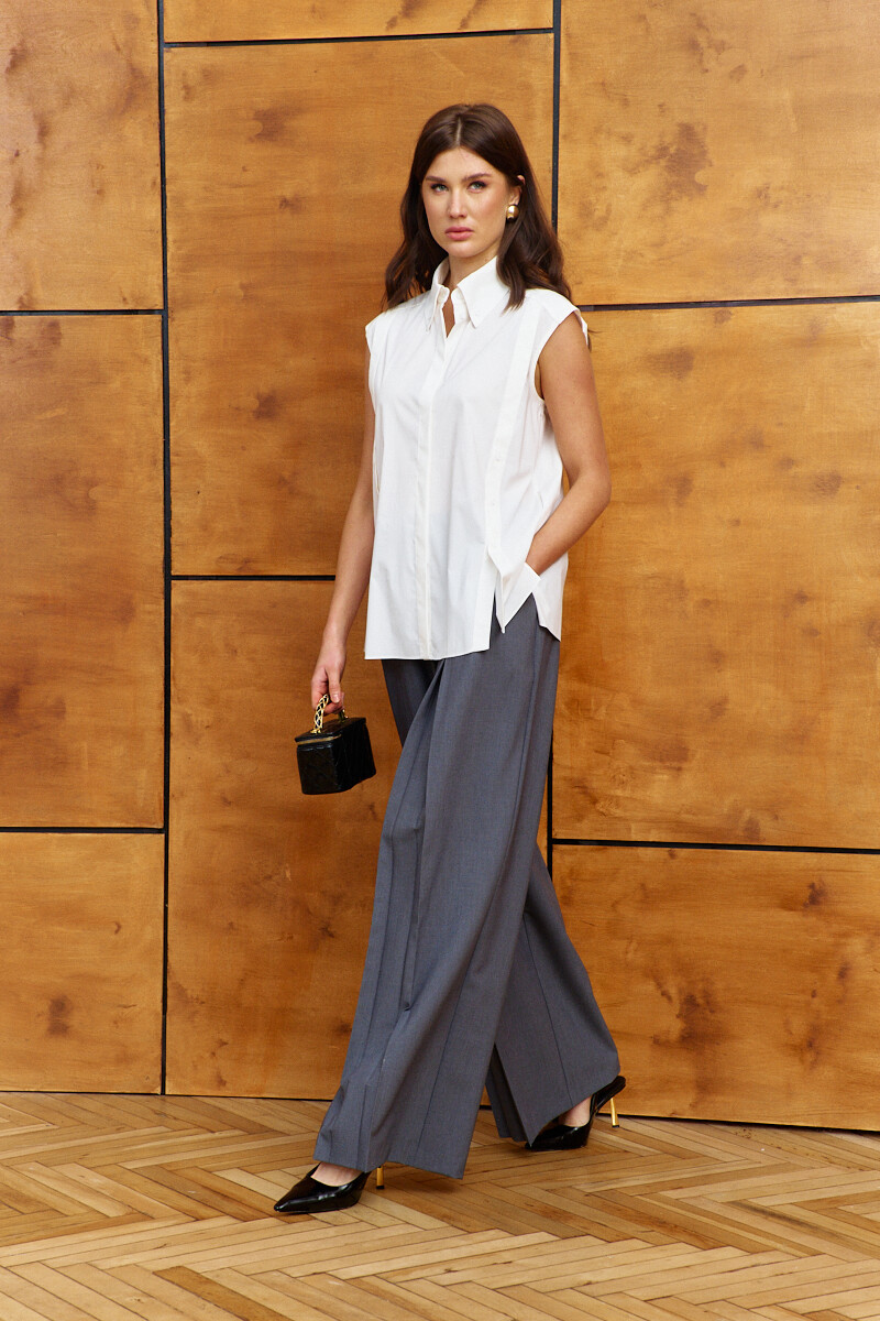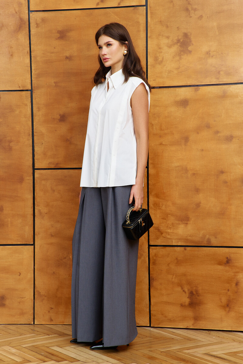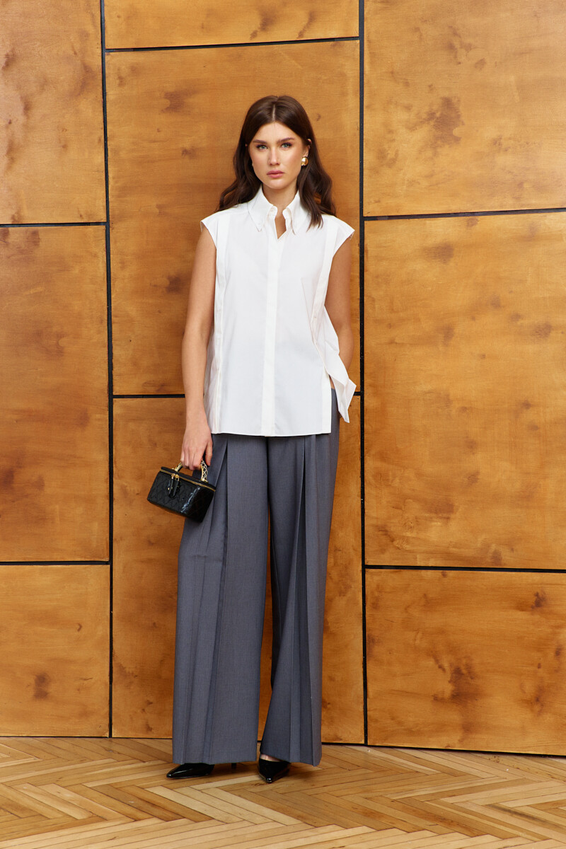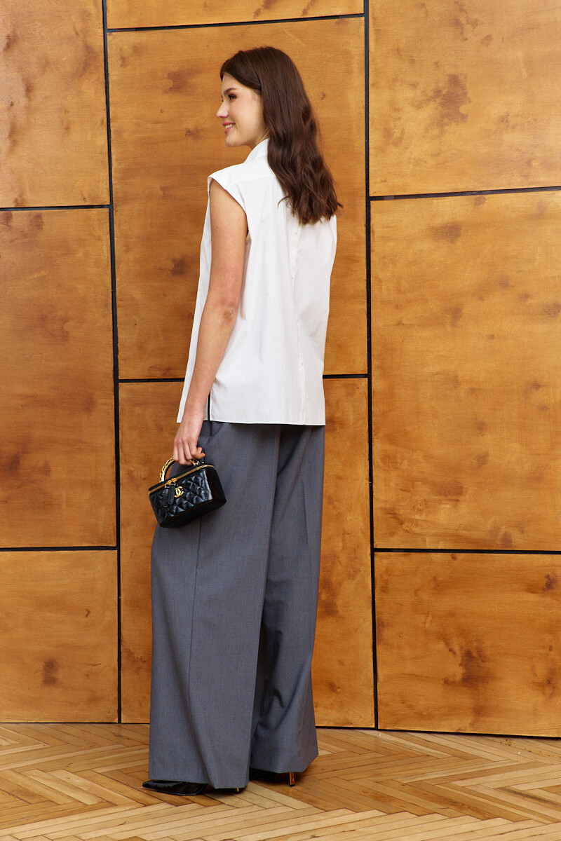 Блузка в стиле smart casual выполнена из хлопкового полотна. Модель прямого силуэта без рукава. Воротник отложной на стойке. Особый вид изделию придают декоративные не функциональные планки на петли и пуговицы по переду и спинке направленные от кокетки, а также центру переда цельнокроеная потайная планка на петли и пуговицы. Длина изделия 68 см.