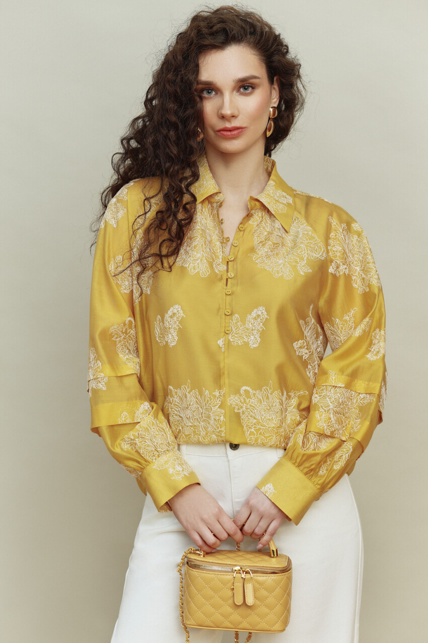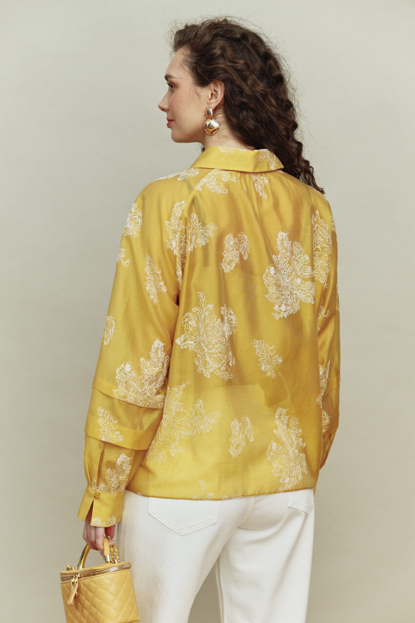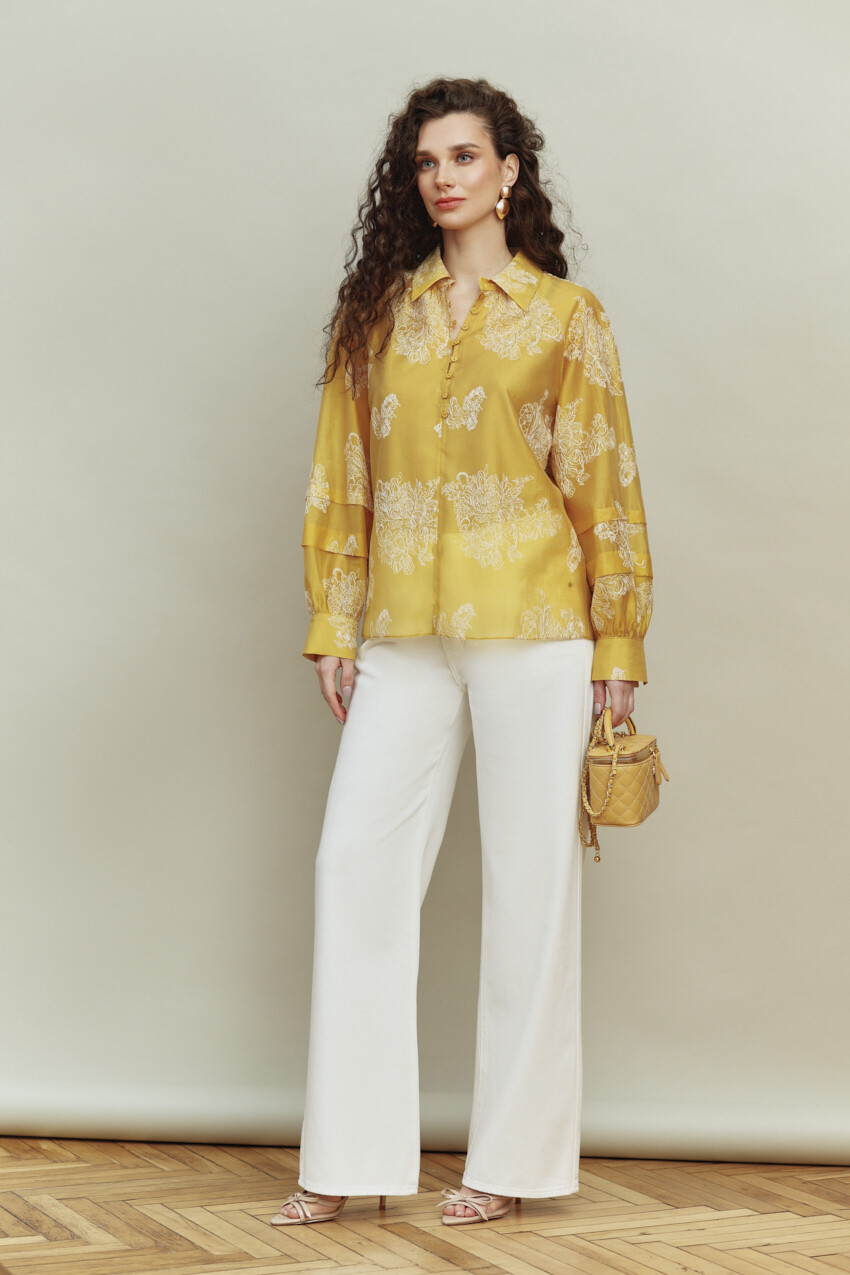 Блузка в стиле city chic выполнена из полупрозрачной вуали с объёмной вышивкой. Модель прямого силуэта. Воротник отложной на стойке. На переде до линии талии расположена застёжка на навесные петельки и декоративные пуговицы. По спинке сборка направлена от горловины. Рукава длинные реглан со сборкой вдоль застёгивающейся манжеты на навесную петельку и пуговицу. Особый вид изделию придают складки разной ширины поперёк рукава. Модель комплектуется топом из вискозного полотна на регулируемых по длине бретелях. Длина изделия 63 см; длина рукава (от горловины) 74 см.