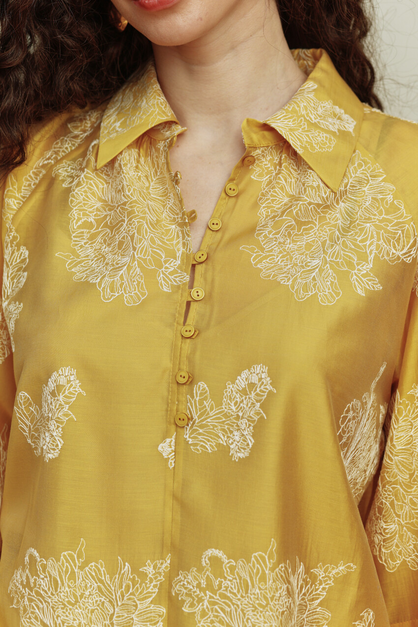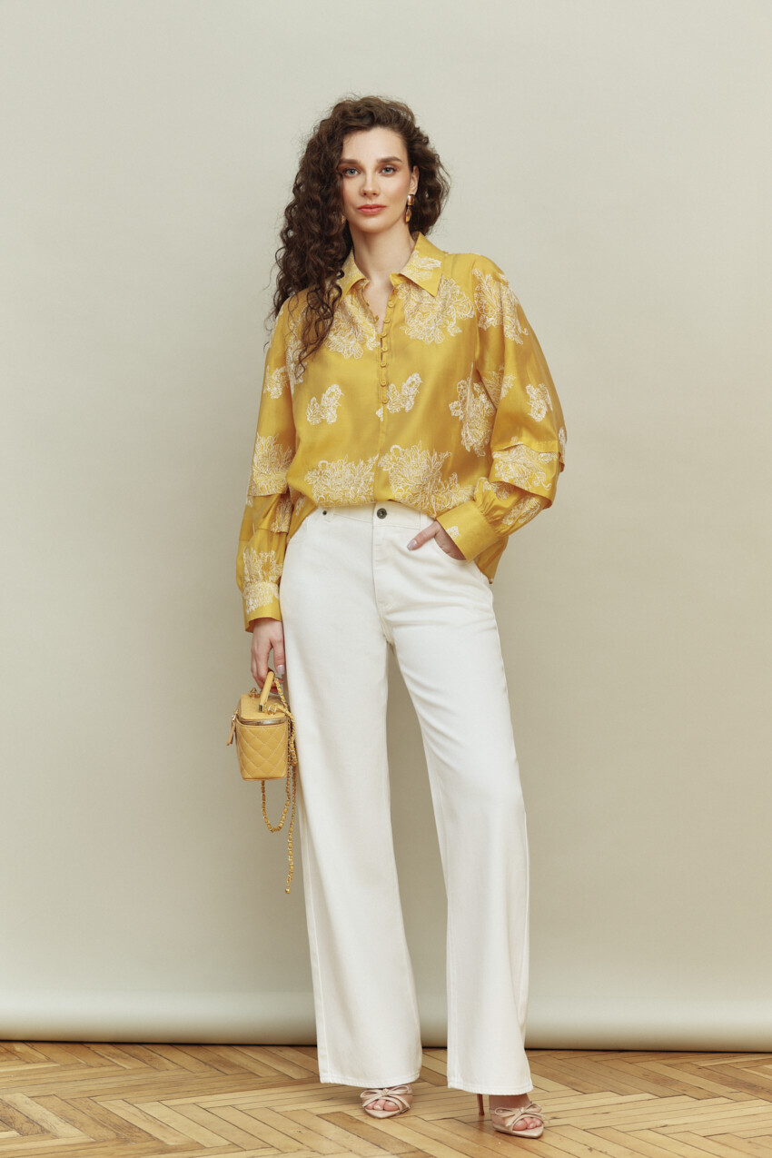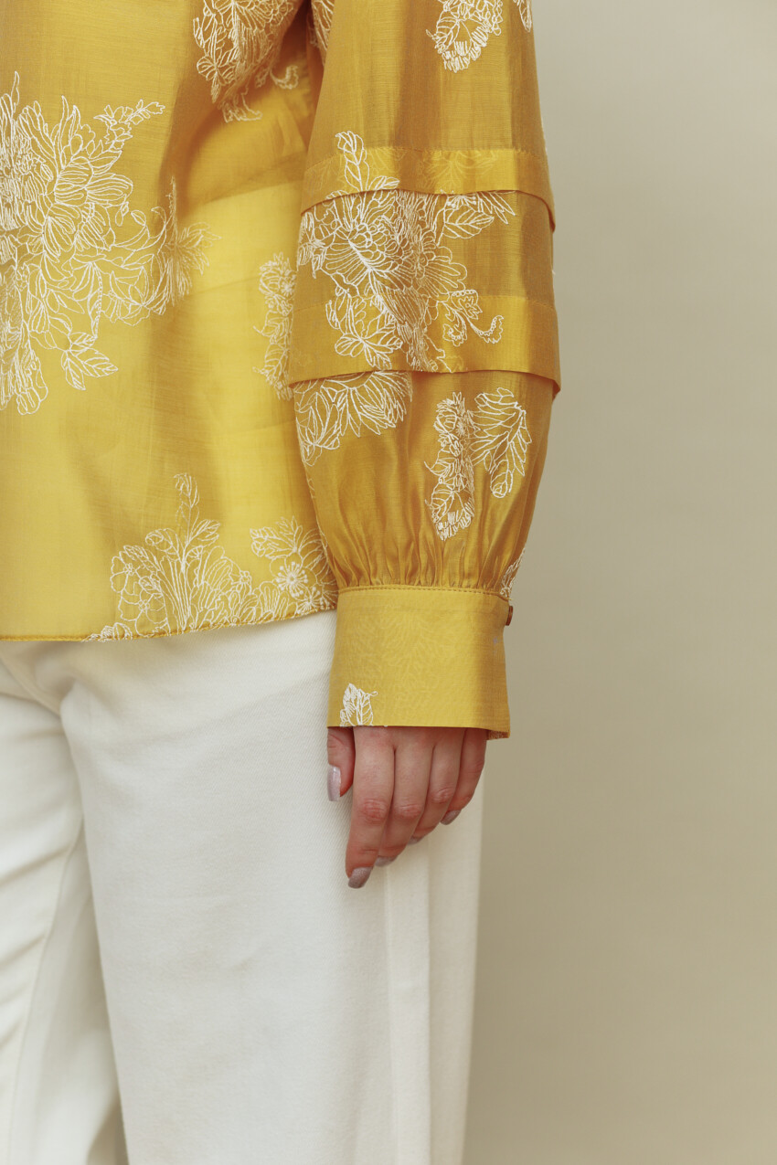Блузка в стиле city chic выполнена из полупрозрачной вуали с объёмной вышивкой. Модель прямого силуэта. Воротник отложной на стойке. На переде до линии талии расположена застёжка на навесные петельки и декоративные пуговицы. По спинке сборка направлена от горловины. Рукава длинные реглан со сборкой вдоль застёгивающейся манжеты на навесную петельку и пуговицу. Особый вид изделию придают складки разной ширины поперёк рукава. Модель комплектуется топом из вискозного полотна на регулируемых по длине бретелях. Длина изделия 63 см; длина рукава (от горловины) 74 см.