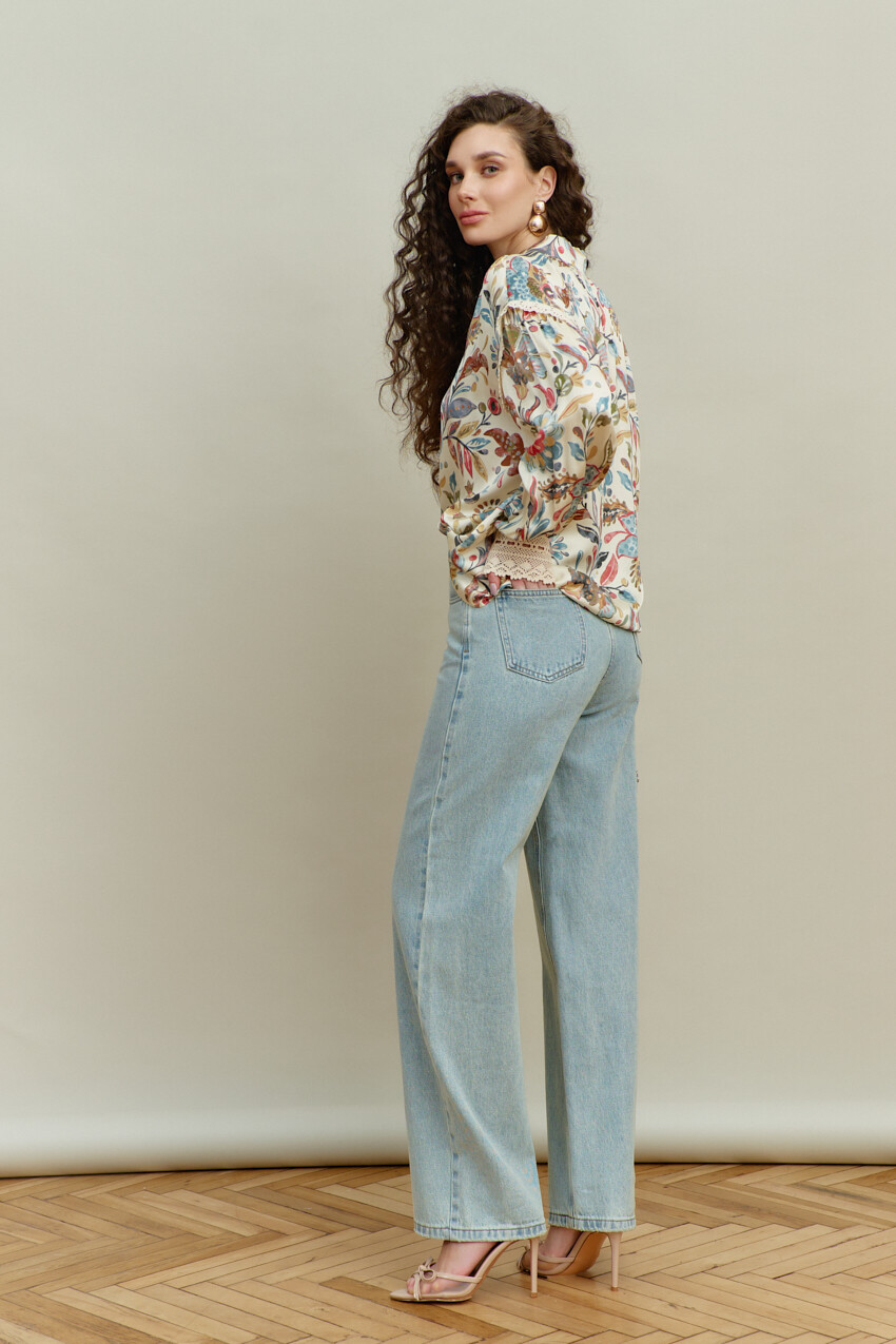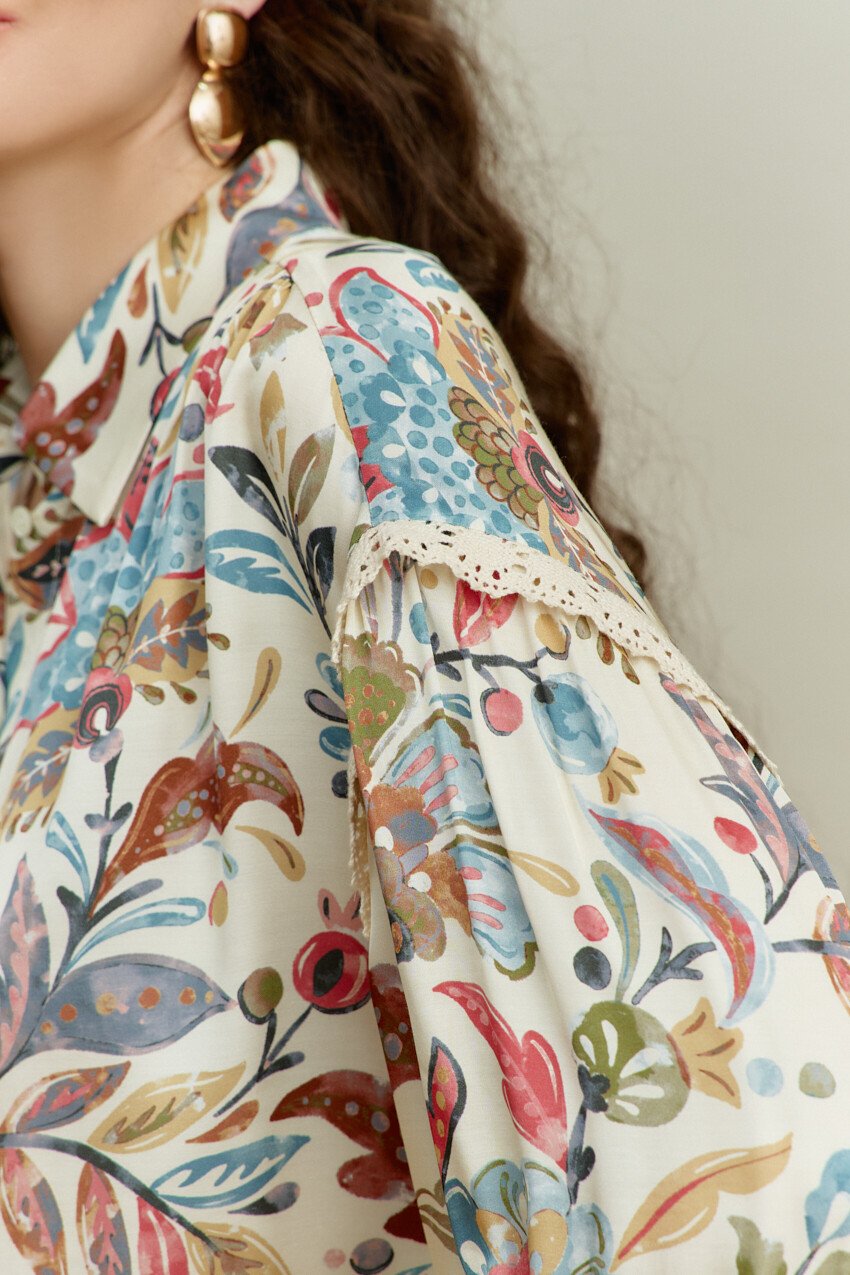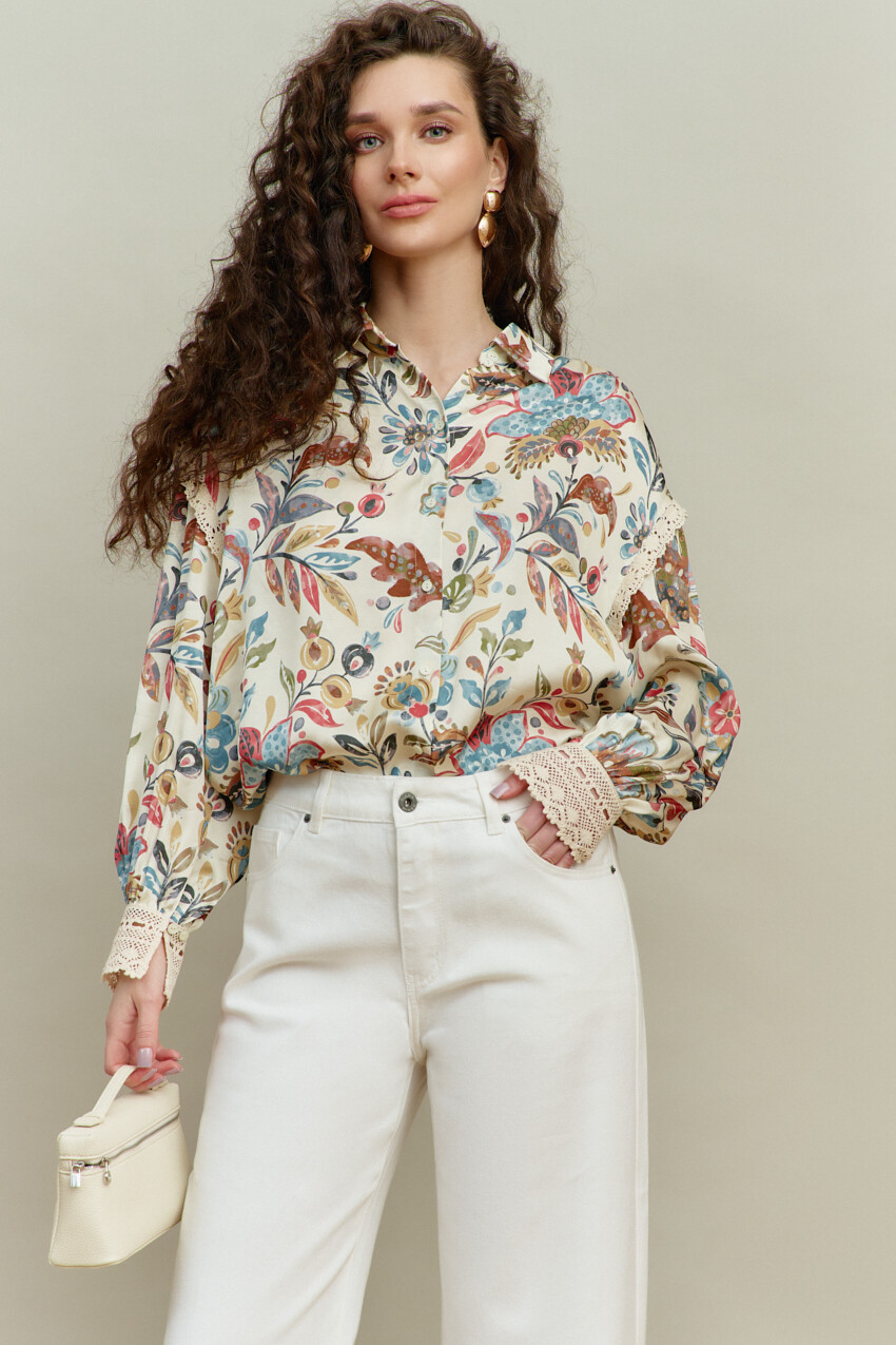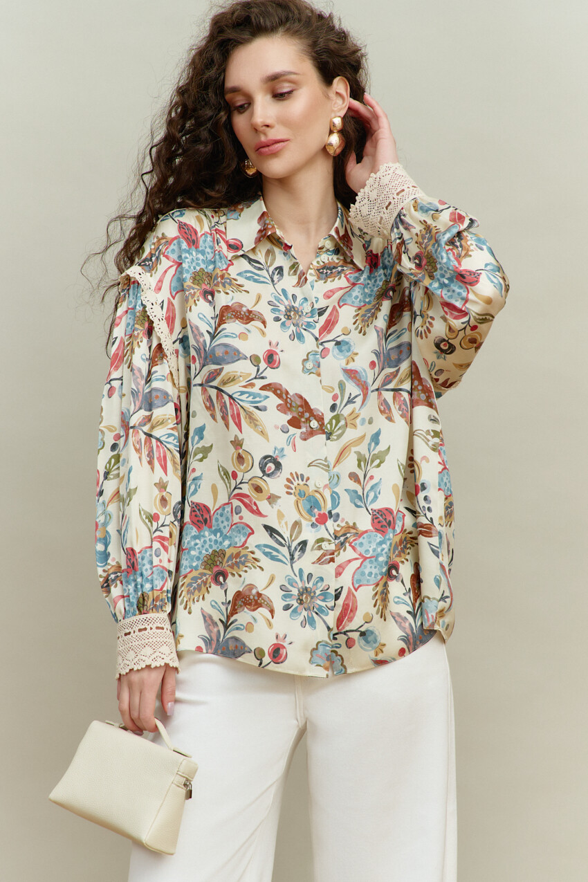 Блузка-рубашка в стиле smart casual выполнена из итальянского полотна с анималистическим принтом. Модель свободного кроя, со спущенной линией плеча. Воротник отложной на стойке. Спереди предусмотрена застёжка на петли и декоративные пуговицы. По спинке сборка направлена от горловины. Рукава втачные, длинные, с лёгкой сборкой по окату и декоративной тесьмой. Особый вид изделию придаёт манжета из декоративной широкой тесьмы, застёгивающаяся на навесную петлю, направленная от присобранного низа рукава. Длина по спинке — 66 см; длина рукава (от горловины) — 75 см.