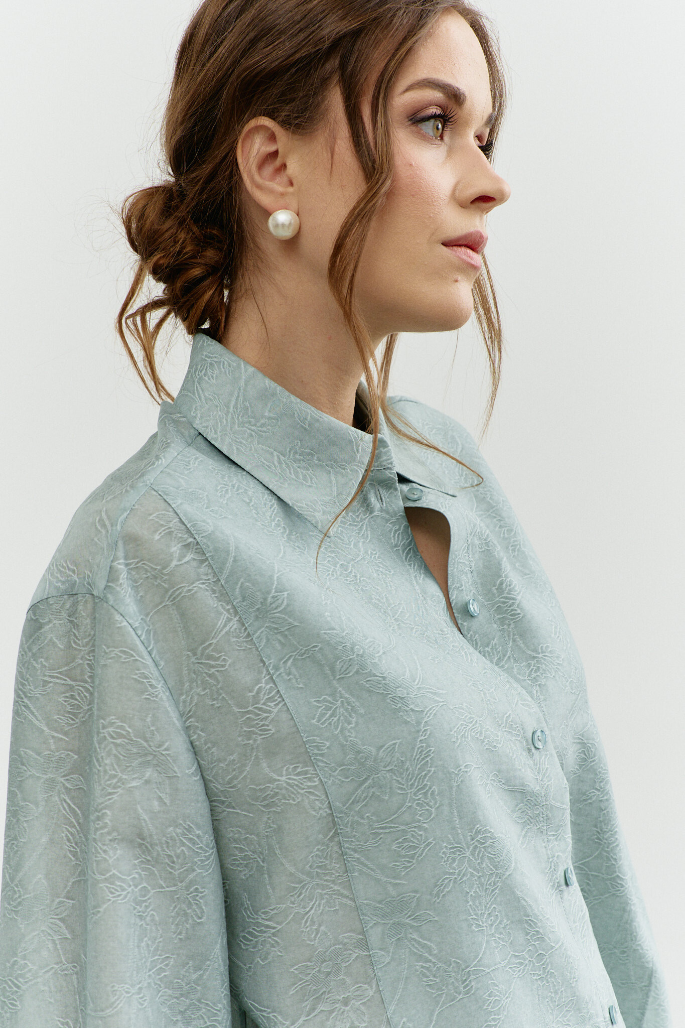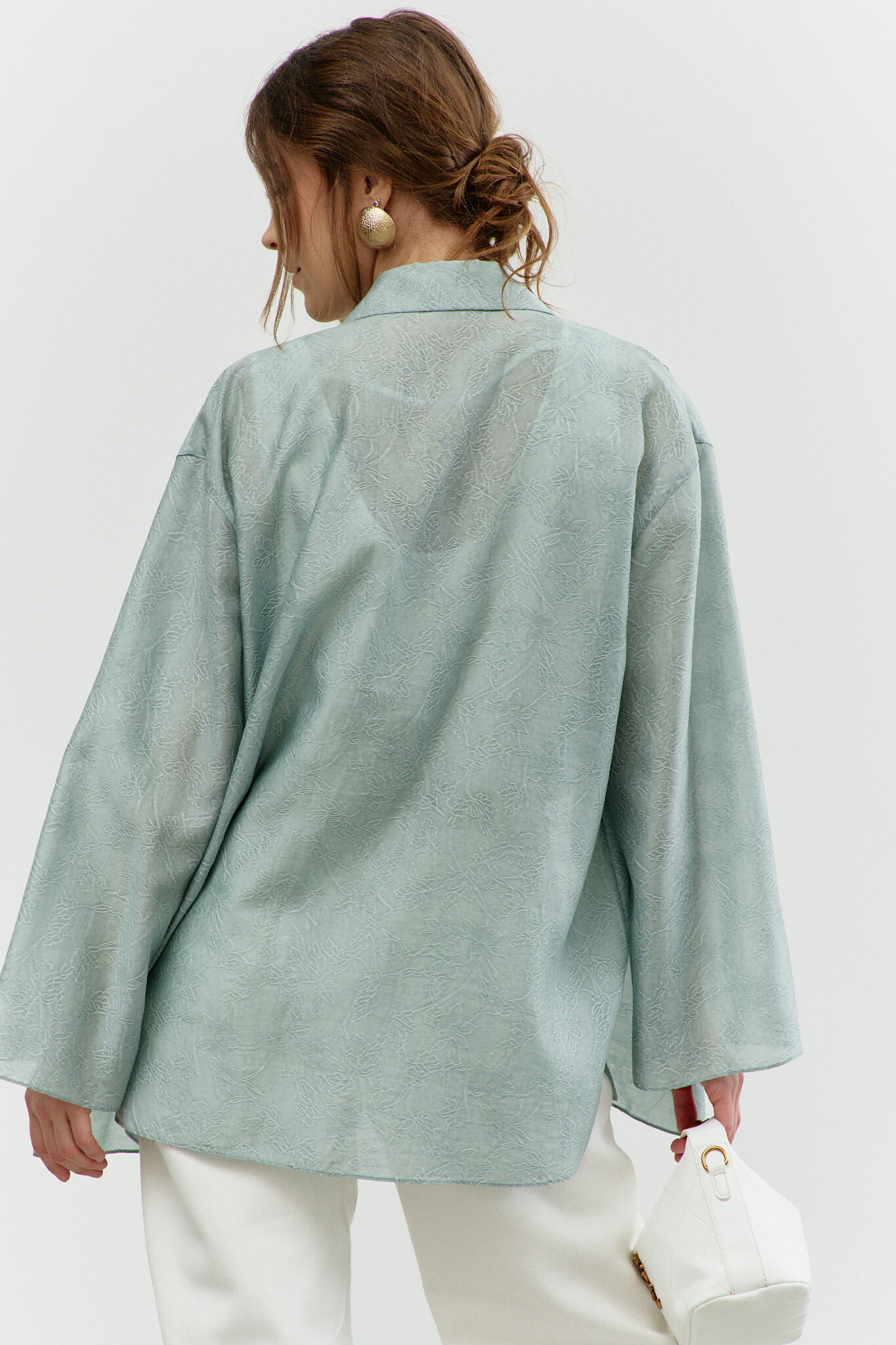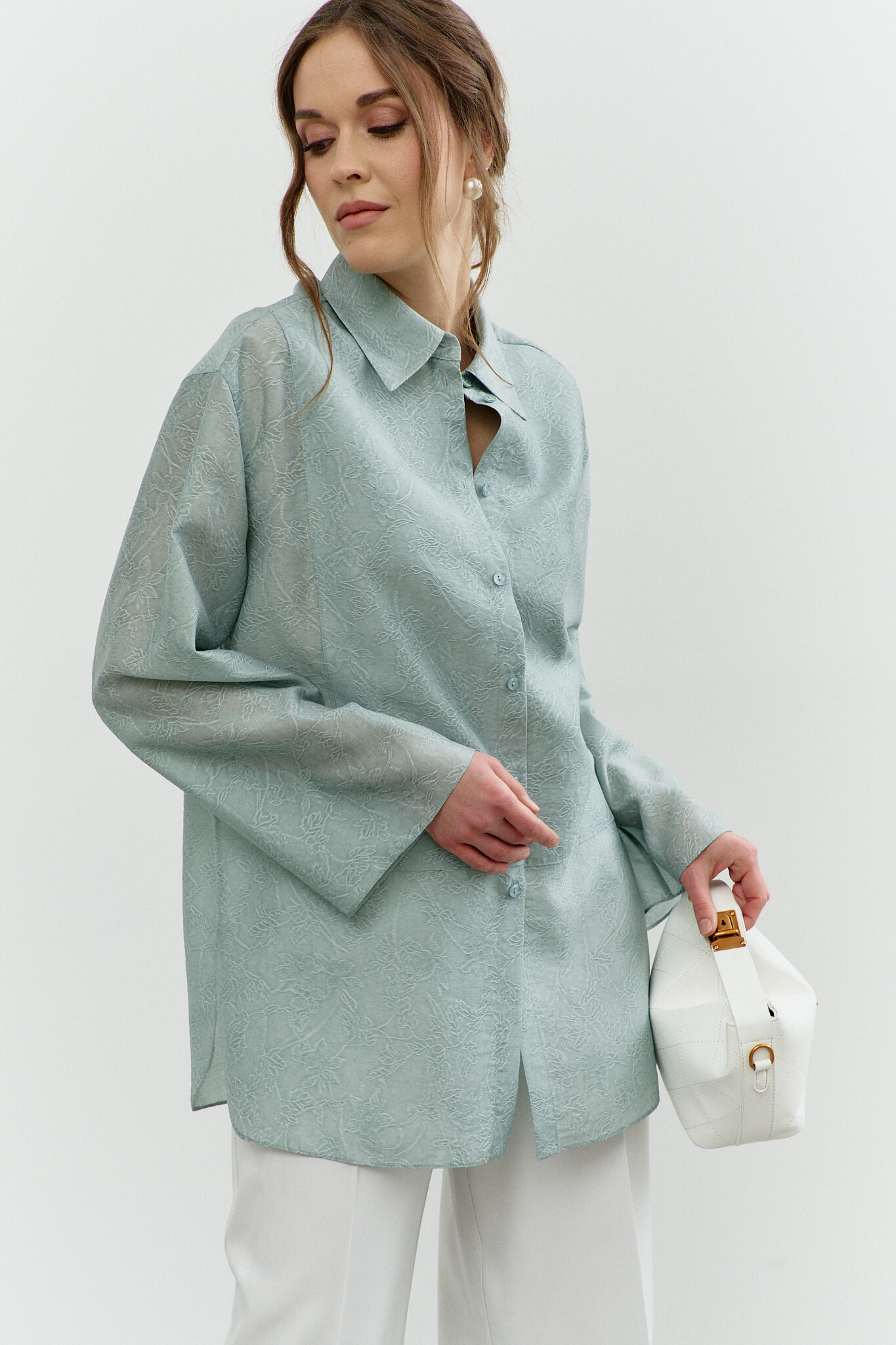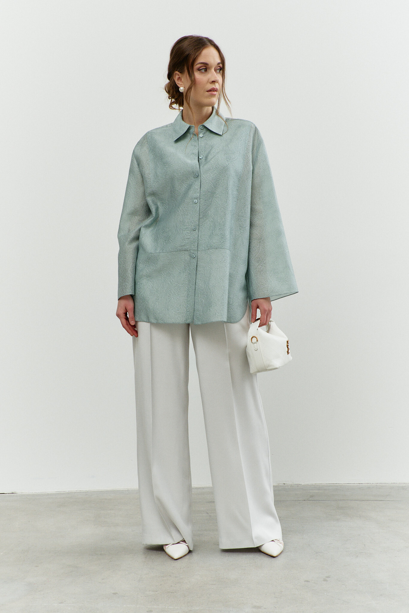 Блузка в стиле city chic выполнена из полупрозрачного шифонового полотна с оригинальным дизайном. Модель прямого силуэта со спущенной линией плеча и закруглённым к боковым швам низом. Воротник отложной на стойке. По центру переда застёжка на цельнокроеную планку на петли и декоративные пуговицы. Особый вид изделию придает отделочная фигурная кокетка по переду. Рукава втачные длинные. Длина изделия 77 см, длина рукава (от горловины) 76 см.