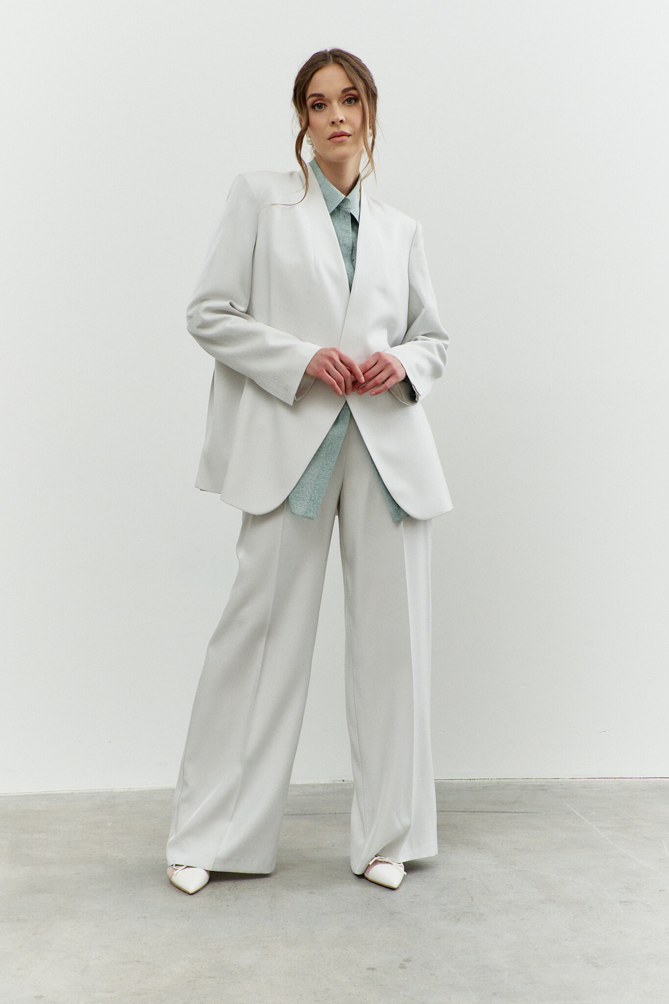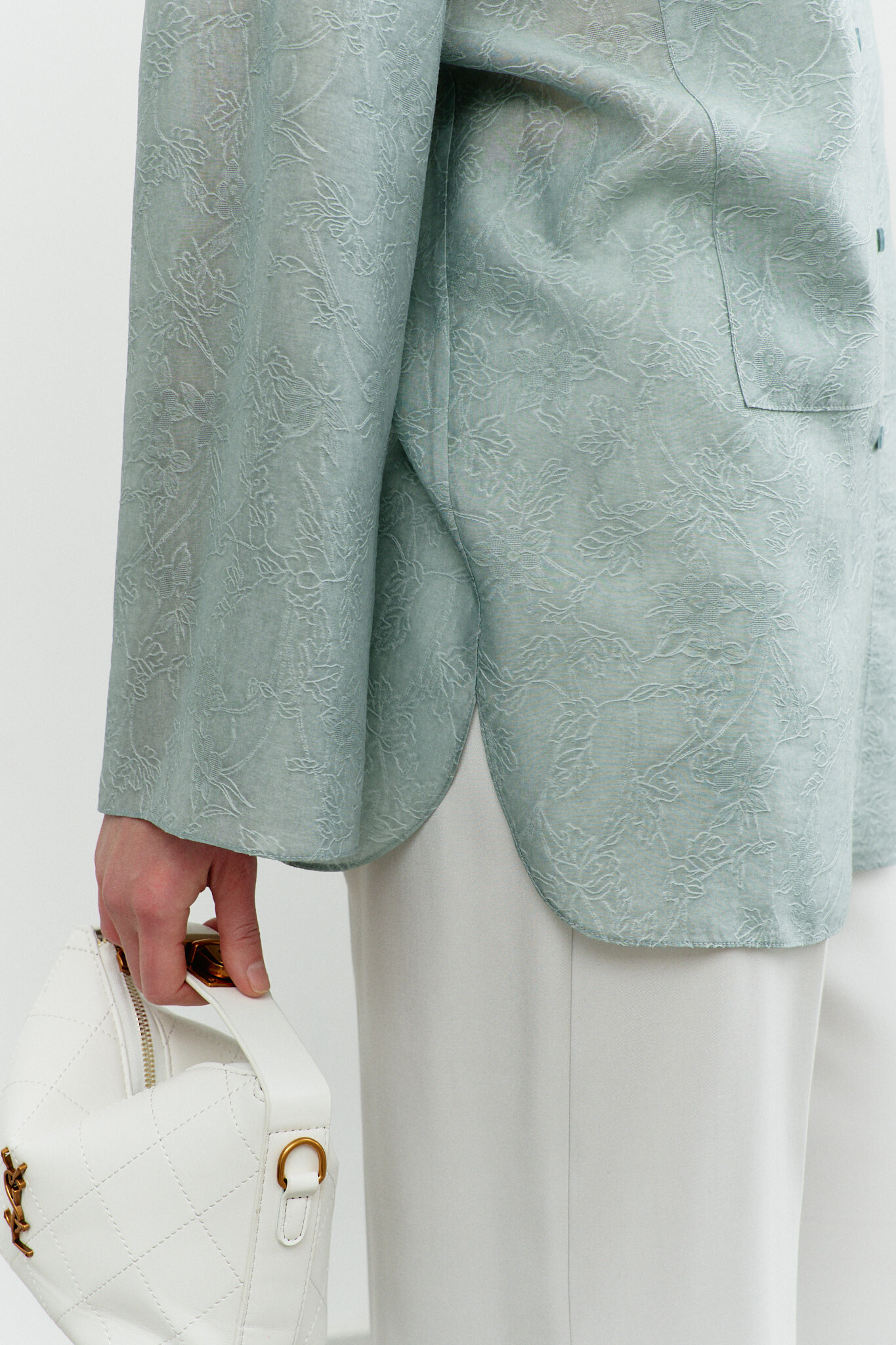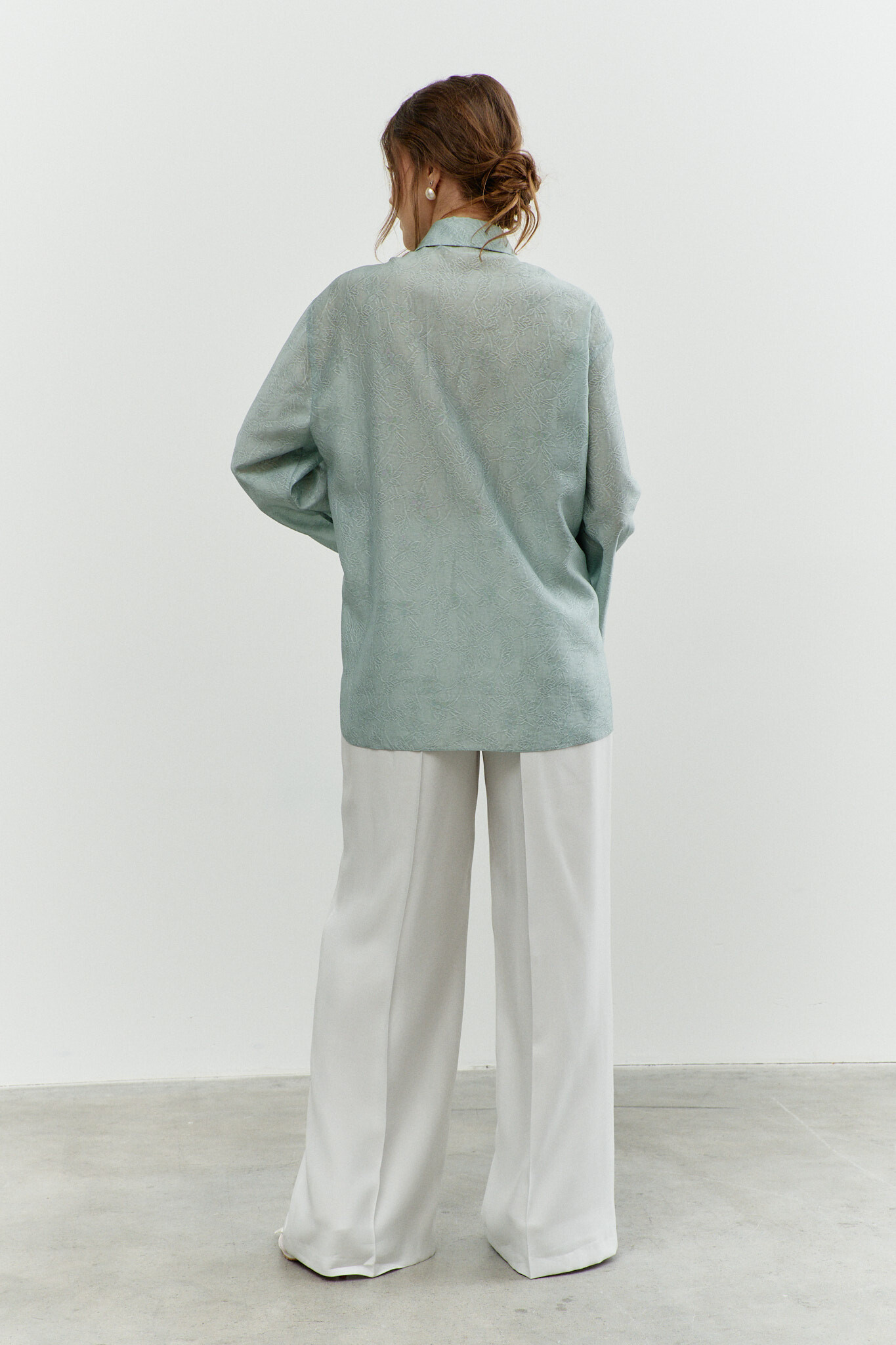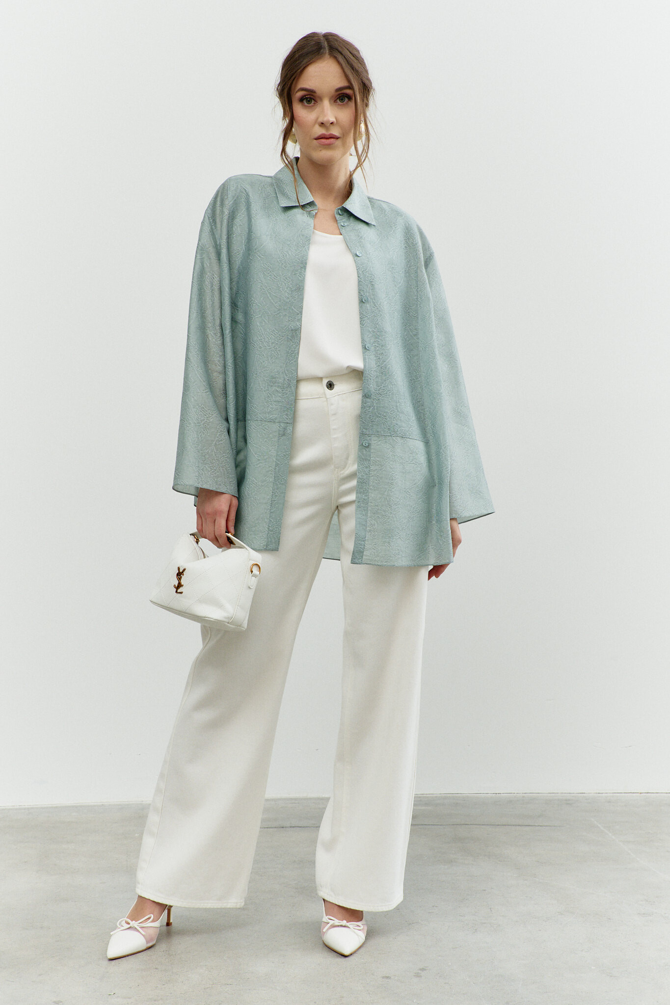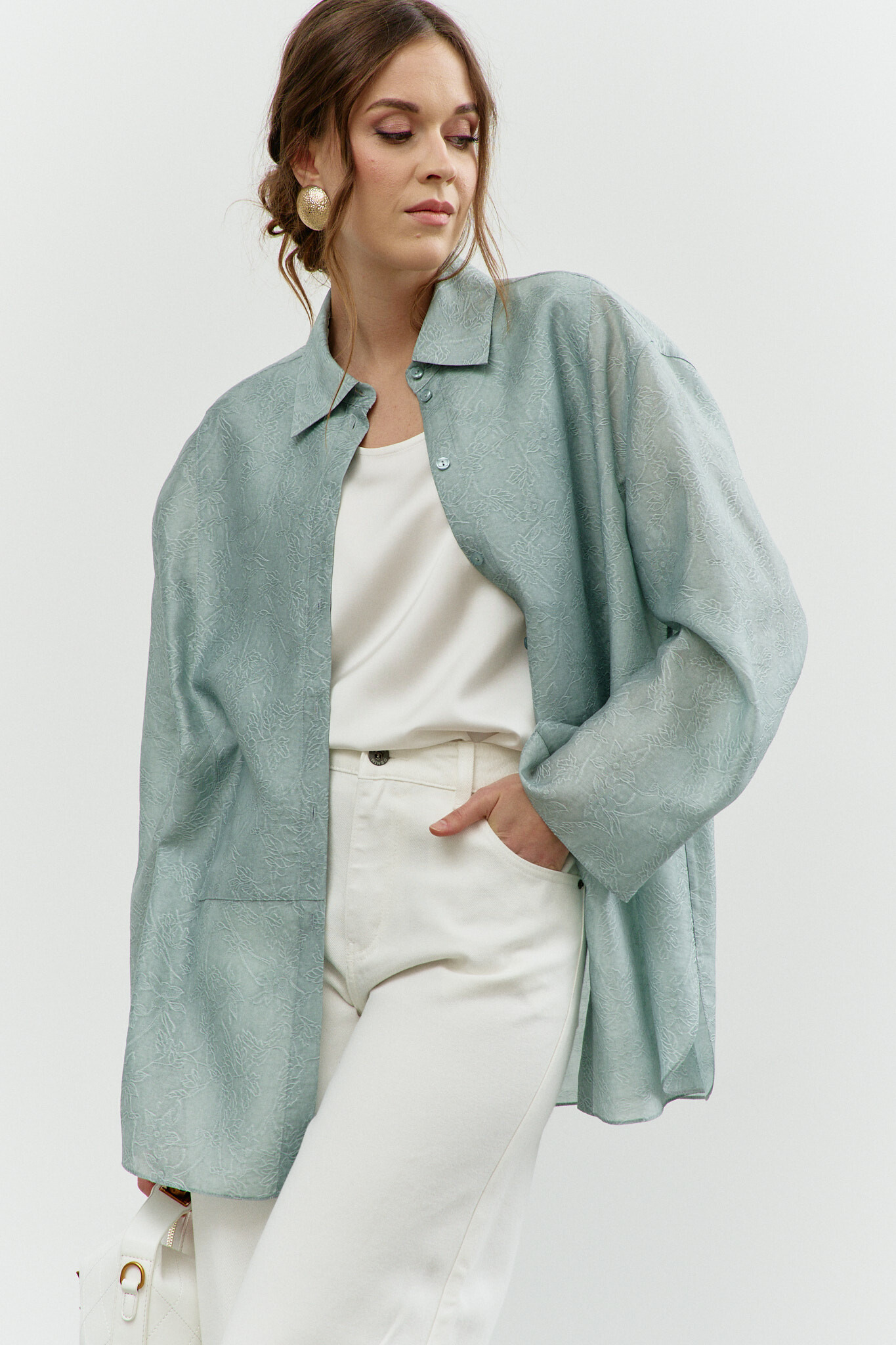 Блузка в стиле city chic выполнена из полупрозрачного шифонового полотна с оригинальным дизайном. Модель прямого силуэта со спущенной линией плеча и закруглённым к боковым швам низом. Воротник отложной на стойке. По центру переда застёжка на цельнокроеную планку на петли и декоративные пуговицы. Особый вид изделию придает отделочная фигурная кокетка по переду. Рукава втачные длинные. Длина изделия 77 см, длина рукава (от горловины) 76 см.