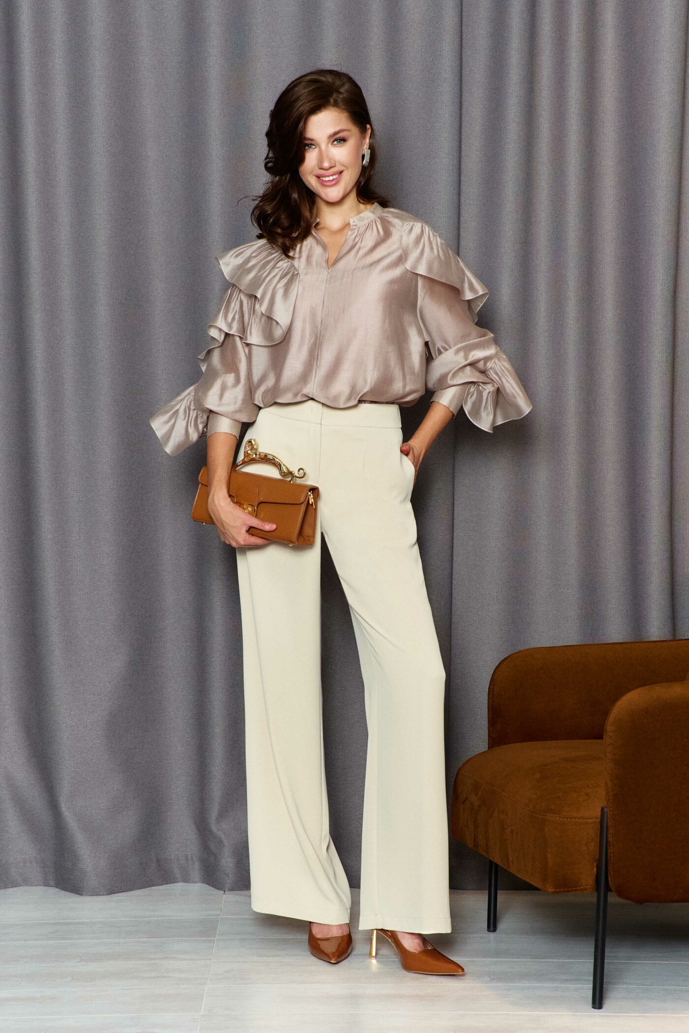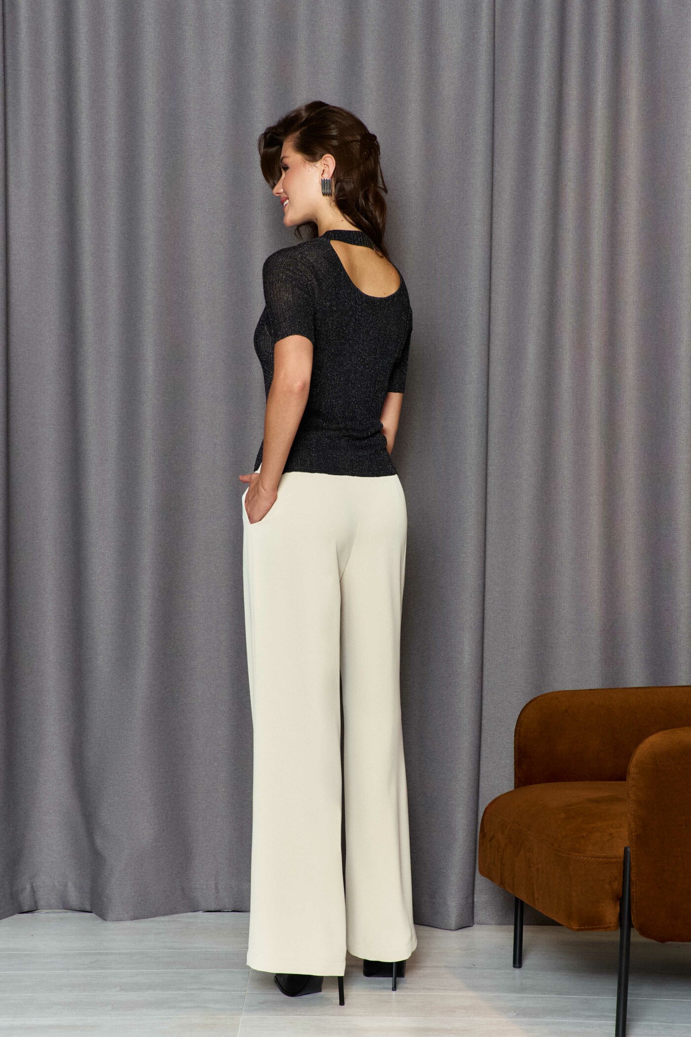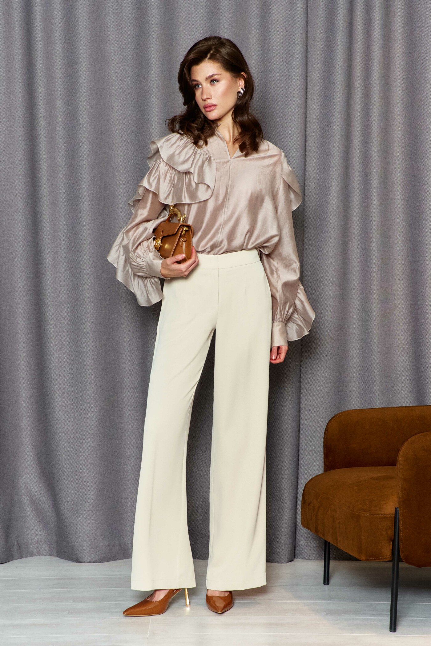 Классические брюки прямого силуэта выполнены из струящегося полотна. Модель с комфортной средней посадкой на притачном поясе с эластичной тесьмой по спинке, с застёжкой на тесьму "молнию" и потайной брючный крючок. Спереди предусмотрены карманы в боковых швах. Длина изделия по боковому шву (с поясом) 114см.