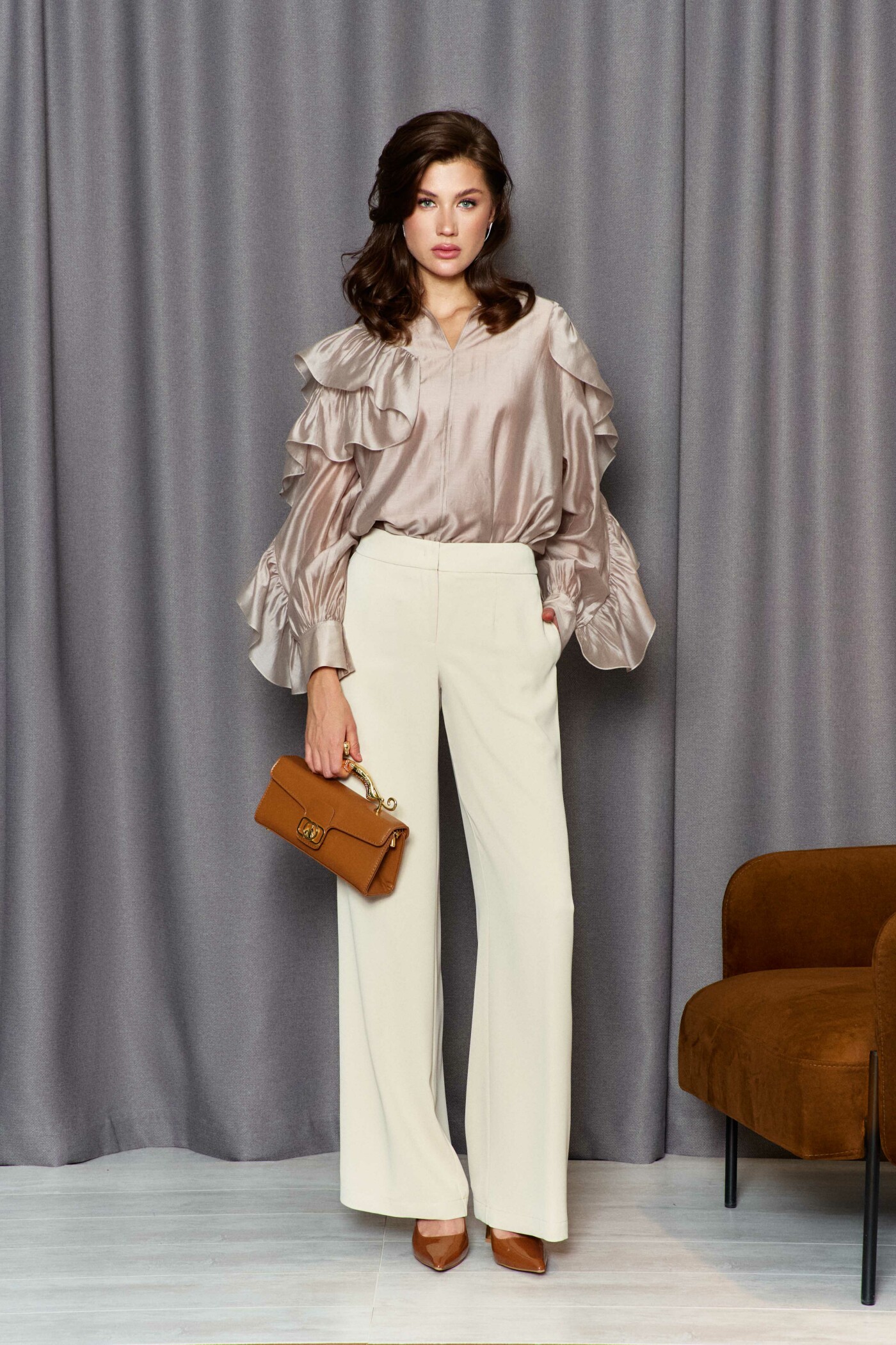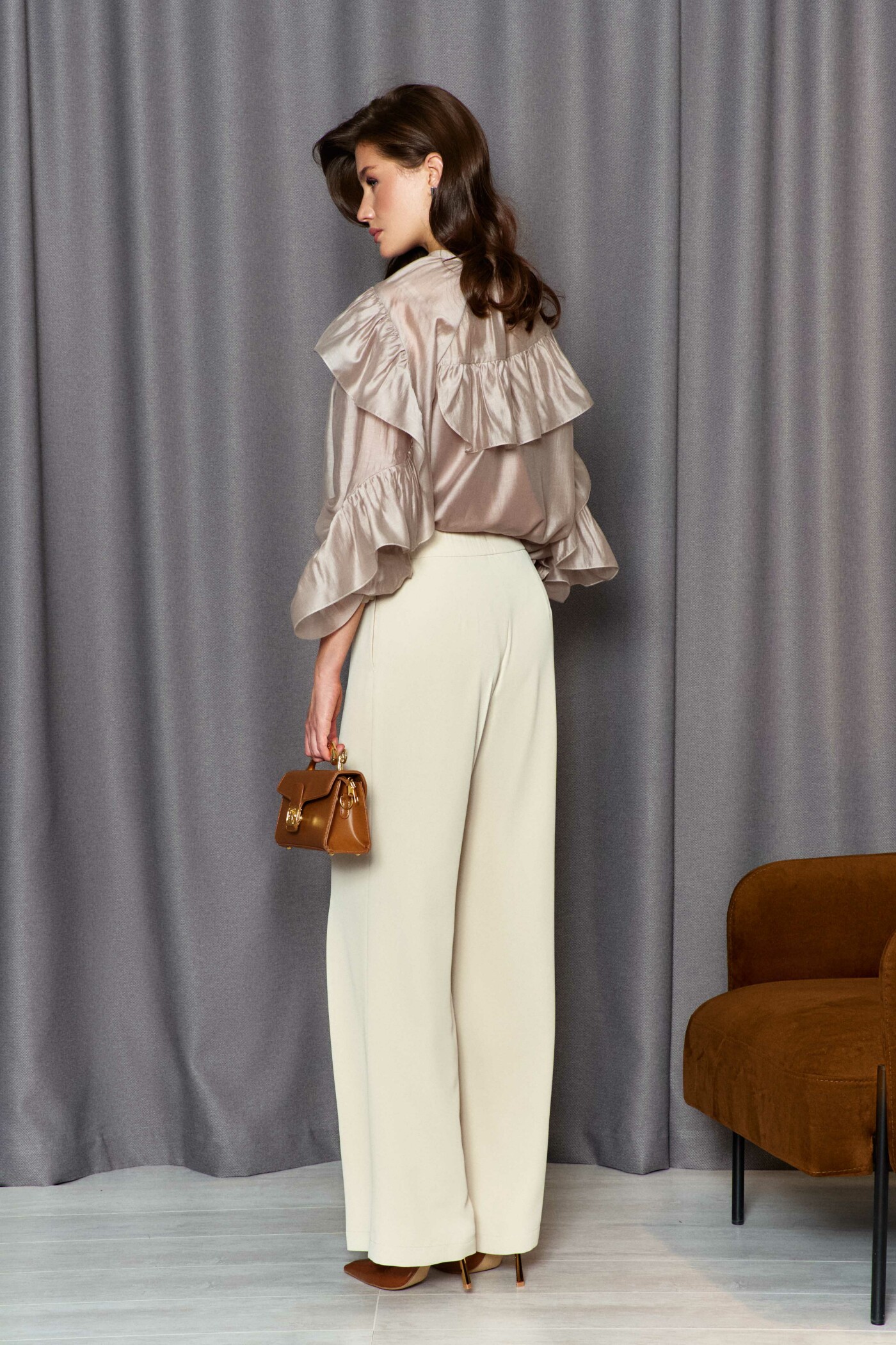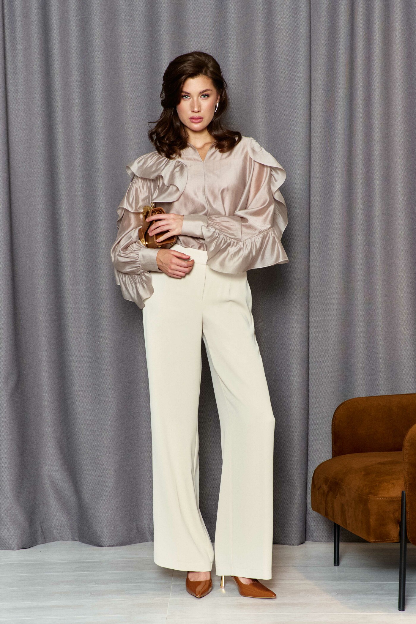 Классические брюки прямого силуэта выполнены из струящегося полотна. Модель с комфортной средней посадкой на притачном поясе с эластичной тесьмой по спинке, с застёжкой на тесьму "молнию" и потайной брючный крючок. Спереди предусмотрены карманы в боковых швах. Длина изделия по боковому шву (с поясом) 114см.
