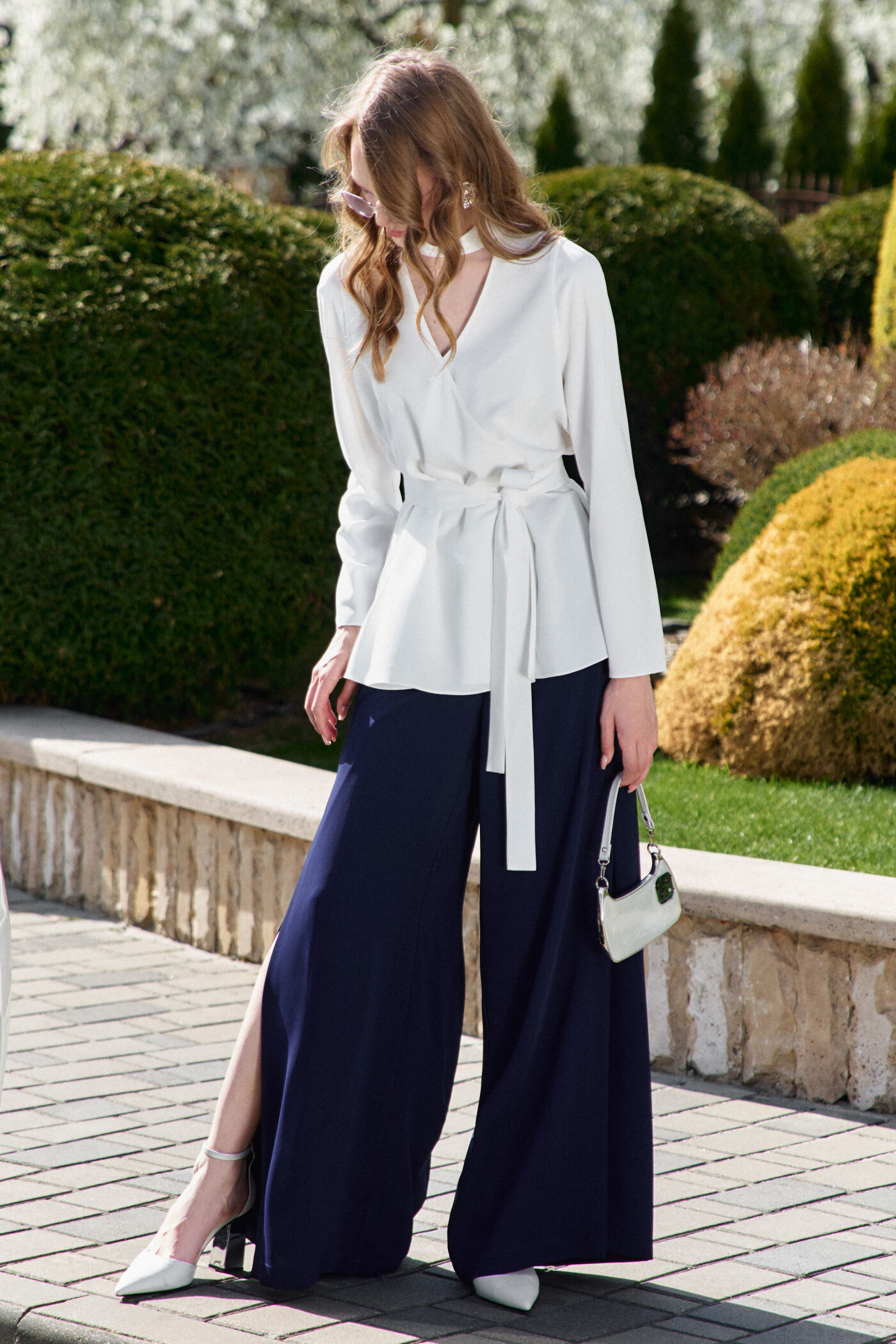 Классические свободные брюки выполнены из струящегося полотна.. Модель с комфортной высокой посадкой; на притачном поясе и эластичной лентой внутри по спинке; застегивающиеся на потайной брючный крючок. Спереди предусмотрены косые боковые карманы и застёжка на тесьму "молнию". Особым декоративным элементом высокие шлицы в швах переда. Длина изделия по боковому шву (с поясом) 112см.