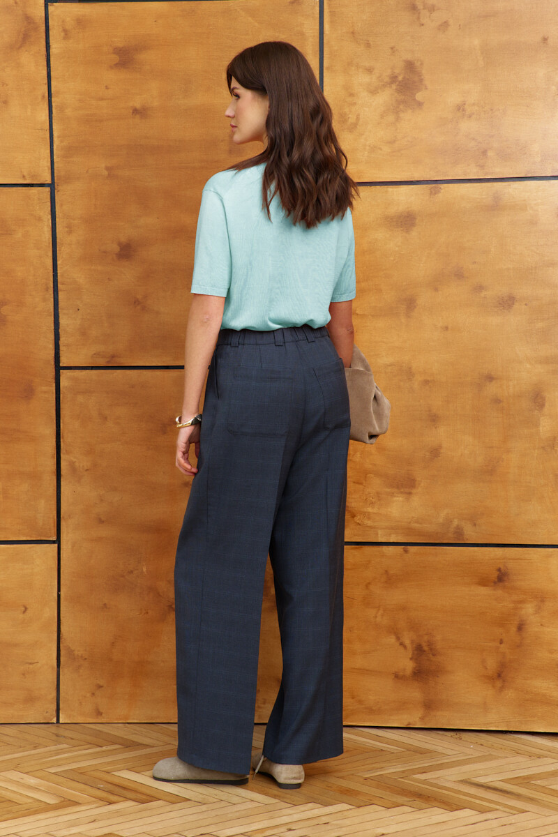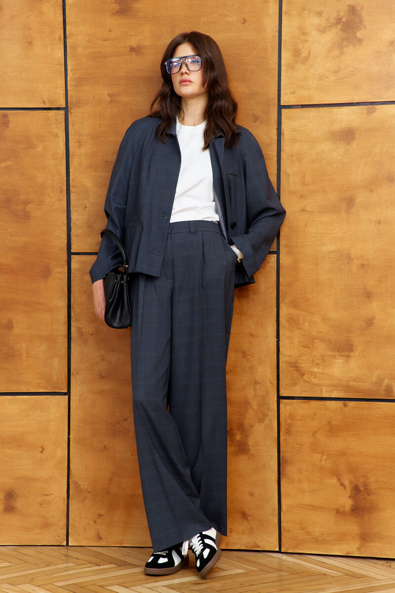 Классические свободные брюки выполнены из костюмного полотна с актуальным дизайном в основе которого лежит клетка "Windowpane". Модель с комфортной высокой посадкой; на притачном поясе со шлевками и эластичной лентой внутри по спинке; застёгивающимся на потайной брючный крючок. Спереди предусмотрены косые карманы и застёжка на тесьму "молнию". Особым декоративным элементом является накладной карман по спинке на декоративную пуговицу и петлю. Длина изделия по боковому шву (с поясом) 109 см.