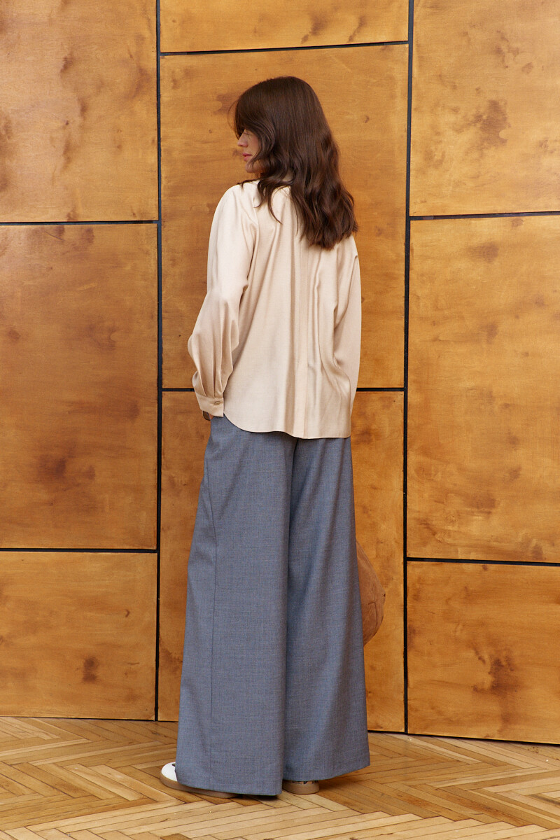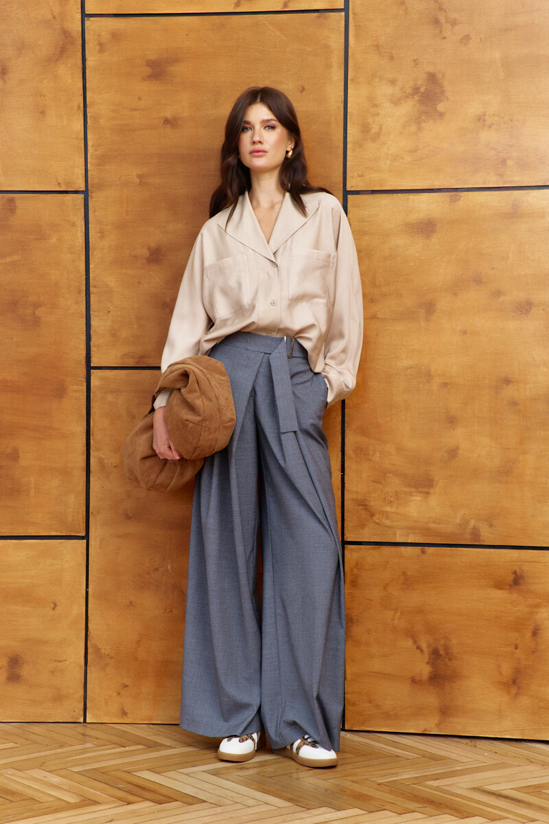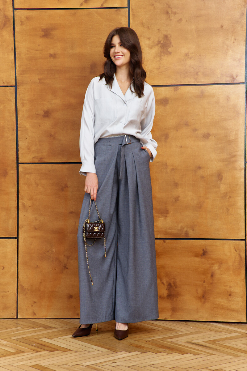 Элегантные брюки выполнены из костюмного полотна. Модель с комфортной средней посадкой, на притачном поясе и эластичной лентой по спинке. Спереди предусмотрены косые карманы, застёжка на тесьму "молнию" и на потайной брючный крючок. Особым декоративным элементом является цельнокроеная отлетная деталь переда, которая фиксируется поясом с металлической пряжкой. Сзади имитация кармана «с листочкой». Длина изделия (с поясом) 111см.