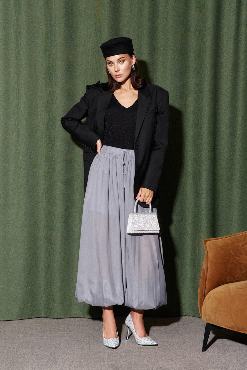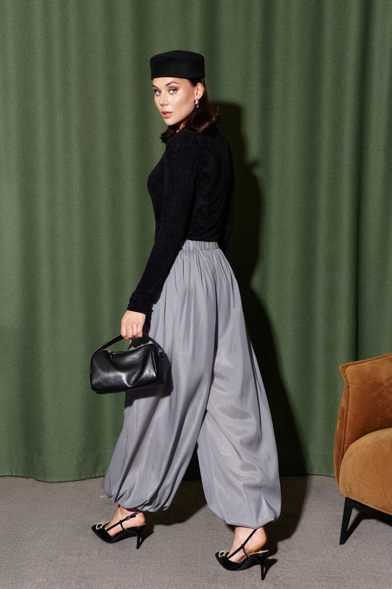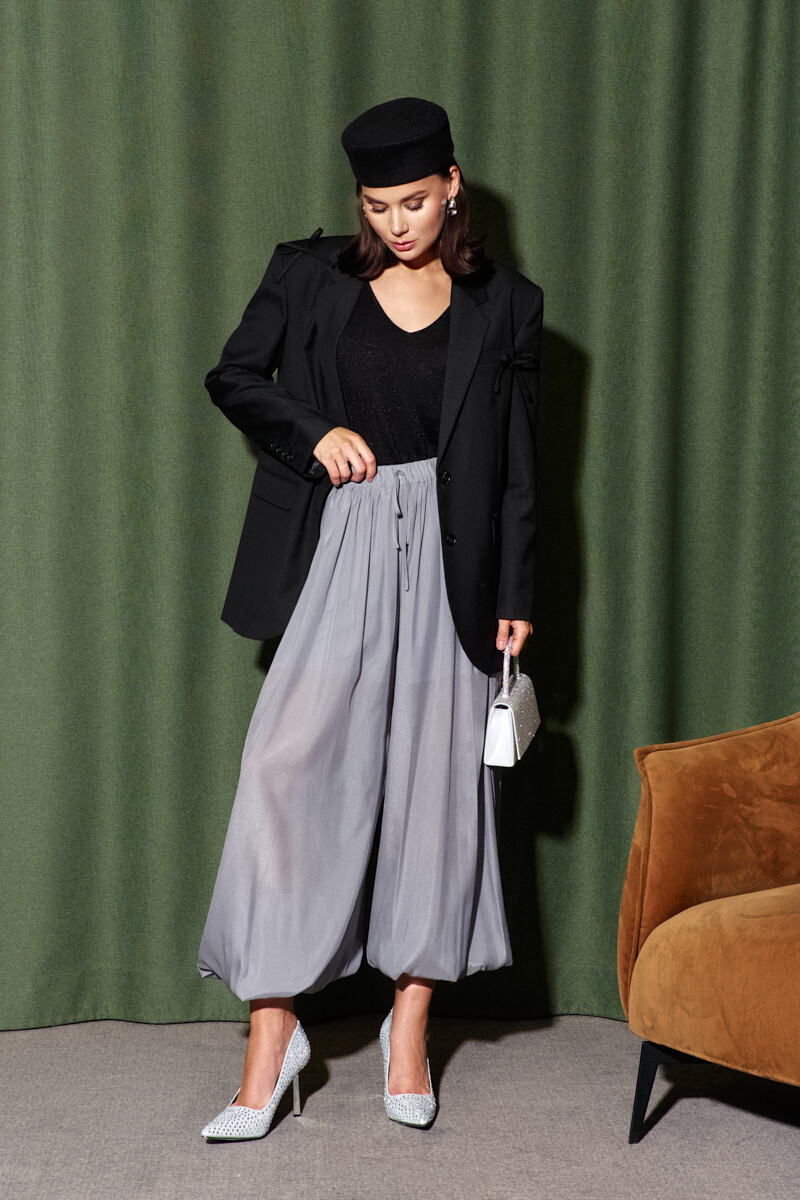 Свободные брюки в стиле city chic выполнены из полупрозрачного шифона с лёгким блеском на подкладке из вискозного полотна. Модель с комфортной средней посадкой на притачном поясе с декоративным завязывающимся узким пояском и эластичной тесьмой между слоями. Брюки со сборкой по линии притачивания пояса и манжетами, создающими эффект воздушности и легкости. Манжеты с декоративными завязками и эластичной тесьмой. Длина изделия (с поясом) 109 см.